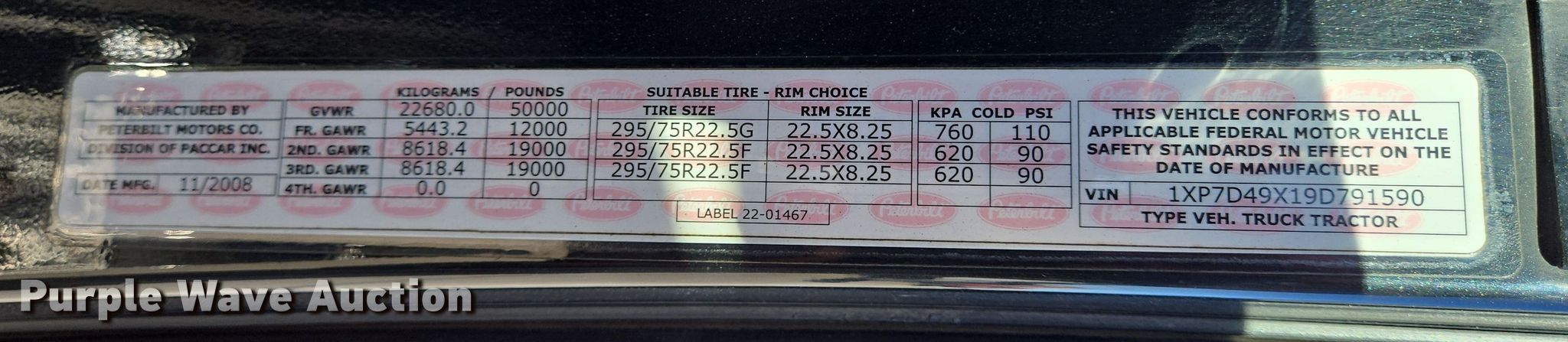 Purple Wave is selling a used Truck Tractor in Texas. This item is a 2009 Peterbilt 387 semi truck with the following: Miles: 1,168,102 on odometer, VIN: 1XP7D49X19D791590
