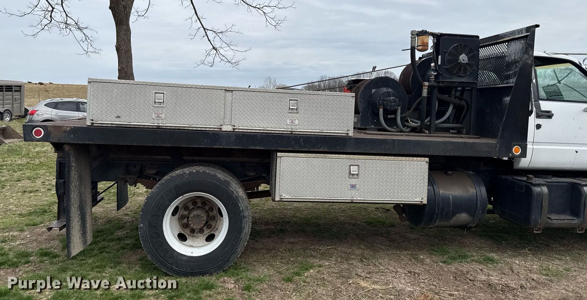 1995 Chevrolet C7 Topkick winch truck. Miles: 105,547 on odometer, VIN: 1GBL7H1J3SJ110184. Engine Caterpillar 3116, Displacement: 6.6L, Cylinders: 6, Fuel type: Diesel. Transmission Manual, Speed: 5. Chassis Axles: Single, Suspension: Spring, Brakes: Hydraulic, PTO. Interior AC, Heat. Features Flatbed 16' L x 96" W, Winch Pull Master M12, Dual. Tires Size: 11R22.5. Missouri title. Hi-G LLC. Platte City, MO 64079