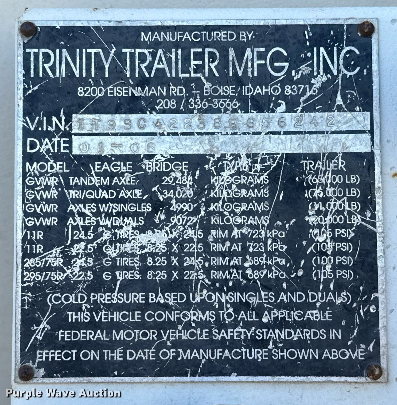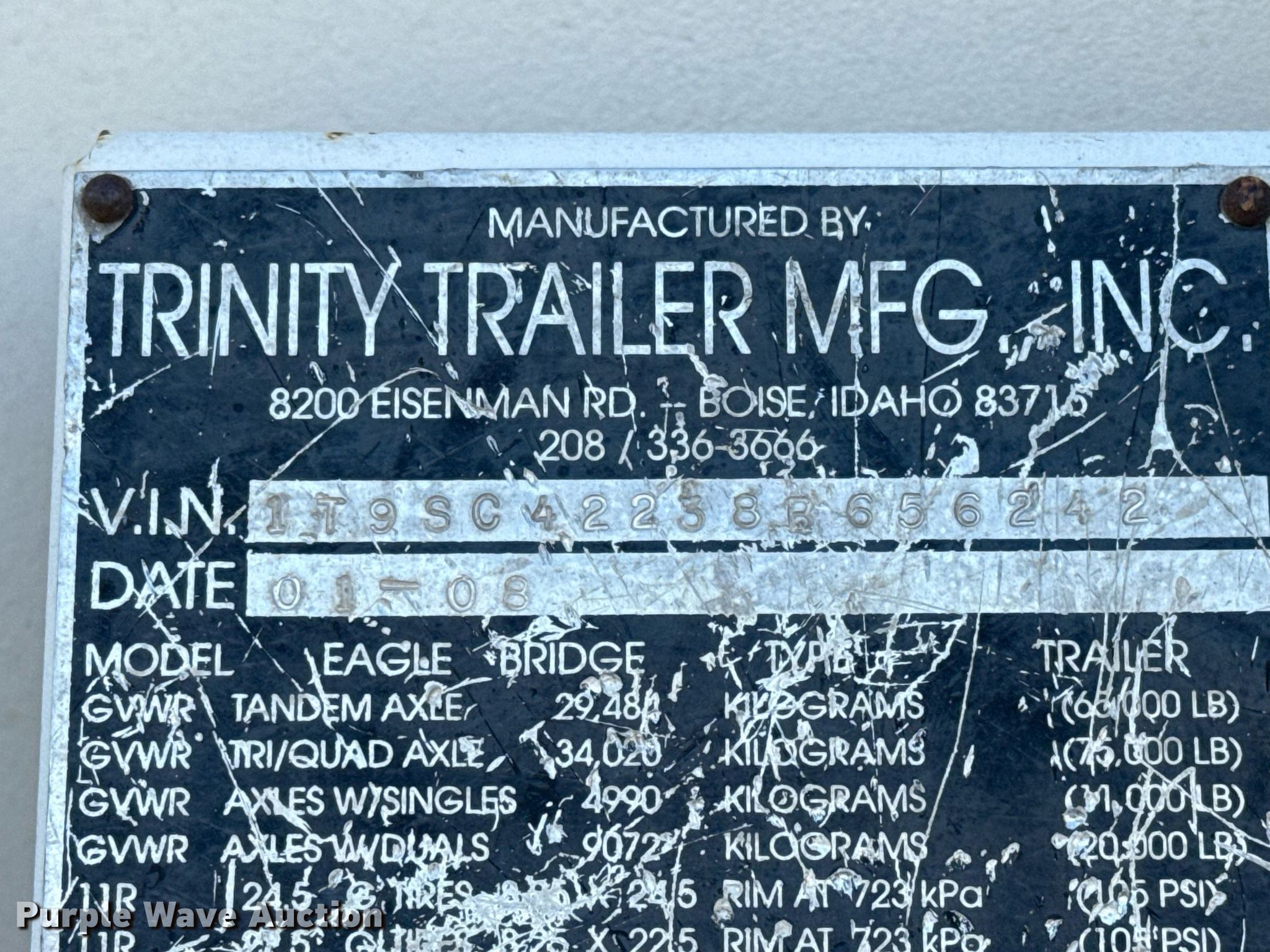 Purple Wave is selling a used Grain or Commodity Trailer in Texas. This item is a 2008 Trinity Eagle Bridge live bottom trailer with the following: VIN: 1T9SC42238B656242, Unit #: 8