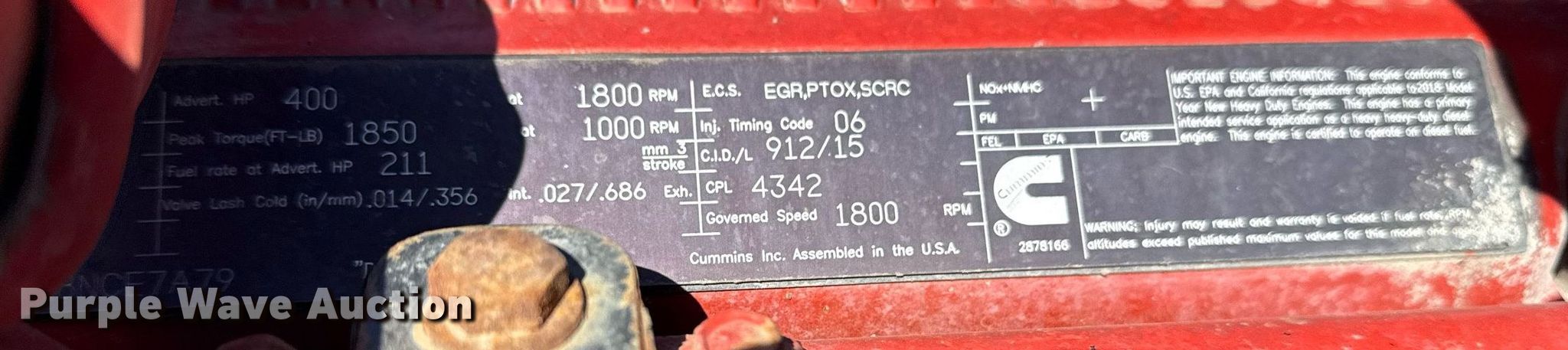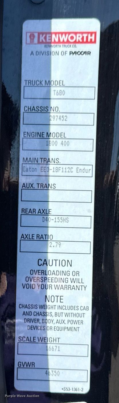 2019 Kenworth T680 semi truck. Miles: 373,716 on odometer, VIN: 1XKYD48X2KJ297452. Engine Cummins X15 400SA, Serial: 80117454, Displacement: 15.0L, Cylinders: 6, Fuel type: Diesel, HP: 400, Engine brake. Transmission Automated manual. Chassis Axles: Tandem, Differential lock: Inter-axle, Suspension: Air Dump valves, Brakes: Air, GVWR: 46,350 lbs FAWR: 12,350 lbs, IAWR: 17,000 lbs, RAWR: 17,000 lbs. Interior AC, Heat, Heated mirrors, Power windows, Power locks, Cruise control, Air ride cab, Sleeper Sleeper length: 5', Beds: Double bunk, Rear climate control. Features Deck plate: Aluminum, Fifth wheel type: Fixed, Fuel tank: Dual. Tires Front: 295/75R22.5, Rear: 445/50R22.5. Oklahoma title. Seller is an Oklahoma licensed motor vehicle dealer. Title will be assigned and distributed by the dealer. Please contact the seller for distribution questions. Title distribution may be delayed up to 30 days from verification of funds. 15107 North 137th East Avenue. Collinsville, OK 74021