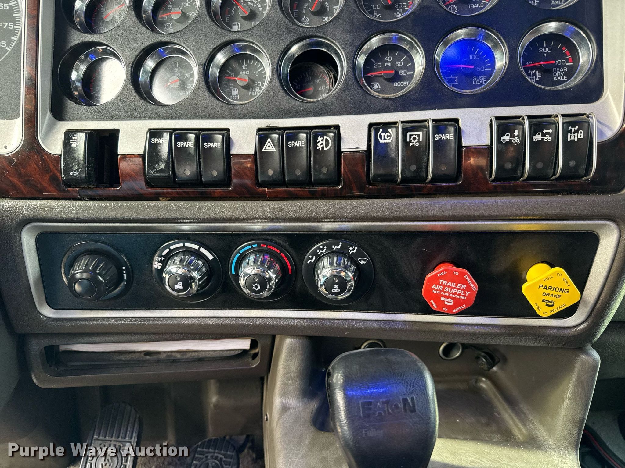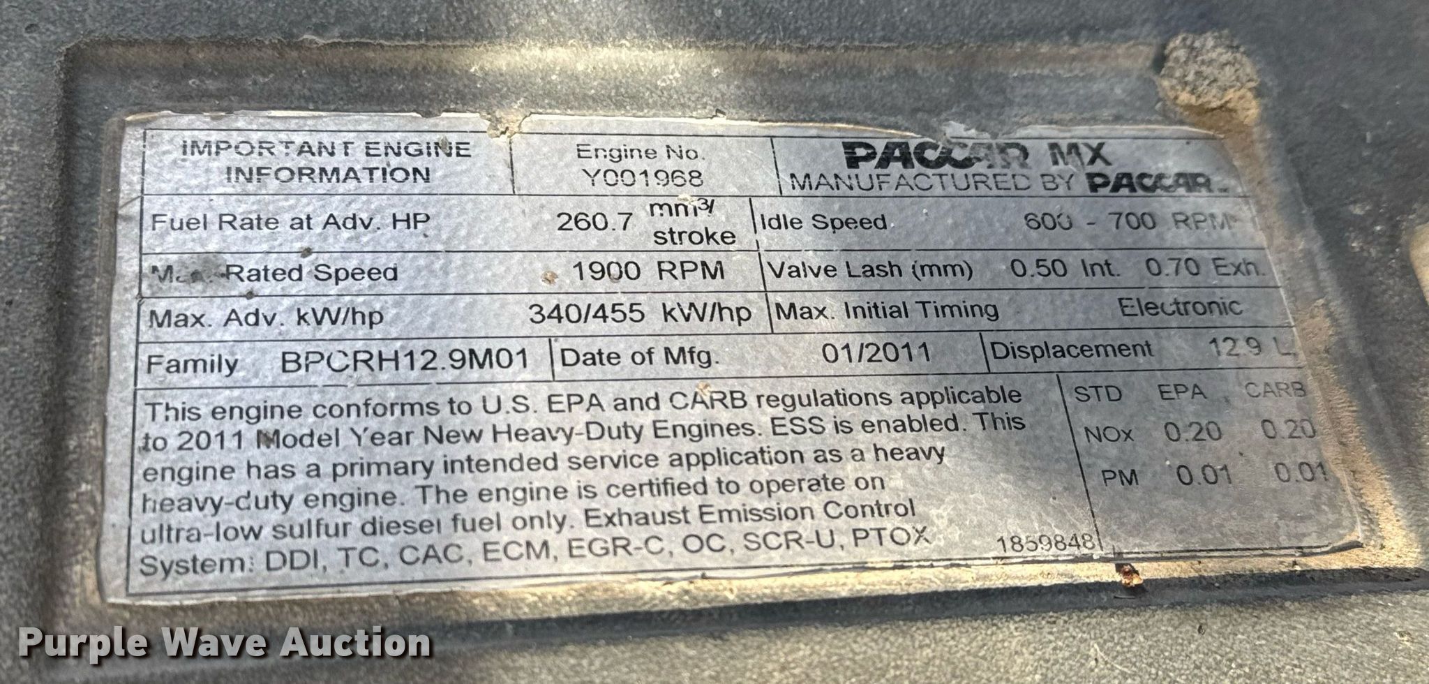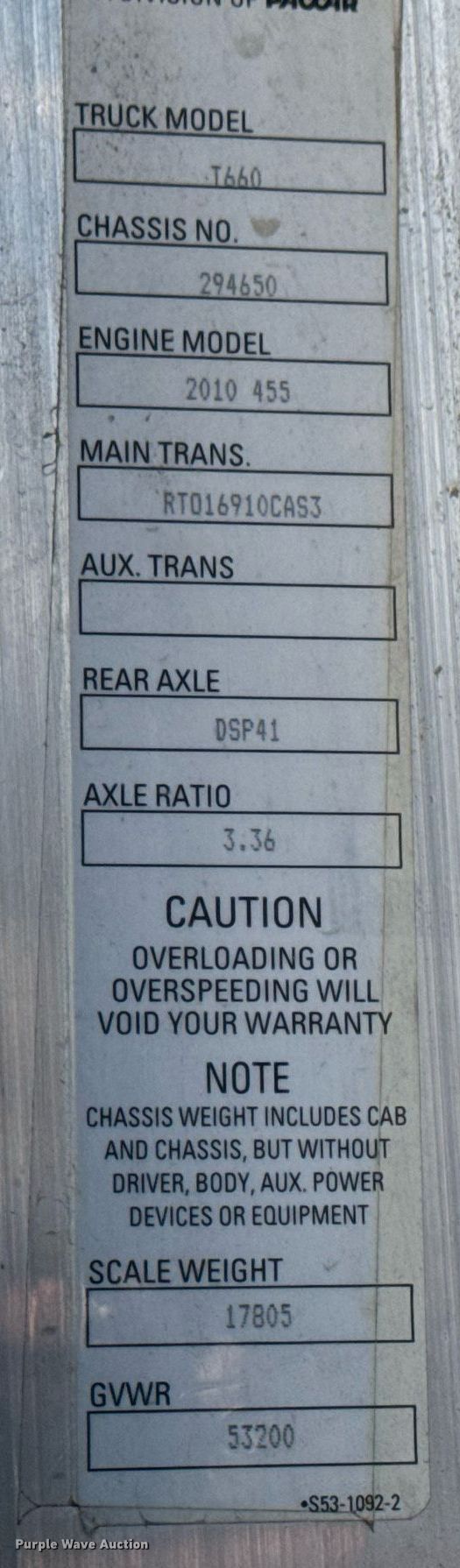 2012 Kenworth T660 semi truck. Miles: 1,013,098 on odometer, Hours: 36,172 on meter, VIN: 1XKADP9X9CJ294650. Engine Paccar MX, Serial: Y001968, Displacement: 12.9L, Cylinders: 6, Fuel type: Diesel, HP: 455, Engine brake. Transmission Eaton Fuller RT016910CAS3, Automated manual. Chassis Axles: Tandem, Gear ratio: 3.36, Differential lock: Inter-axle, Suspension: Air Dump valves, Brakes: Air, PTO, GVWR: 53,200 lbs. Interior AC, Heat, Power windows, Power locks, Cruise control, Air ride cab, Sleeper Kenworth Aerocab, Sleeper length: 60", Beds: Single, Refrigerator, Rear climate control. Features Fifth wheel type: Air operated, Sliding, Fuel tank: Dual. Tires Front: 11R22.5, Rear: 295/75R22.5. Notes Dash warning indicator: Check engine, Regen. Kansas title. Title distribution may be delayed up to 14 days from verification of funds. Clearwater, KS 67026
