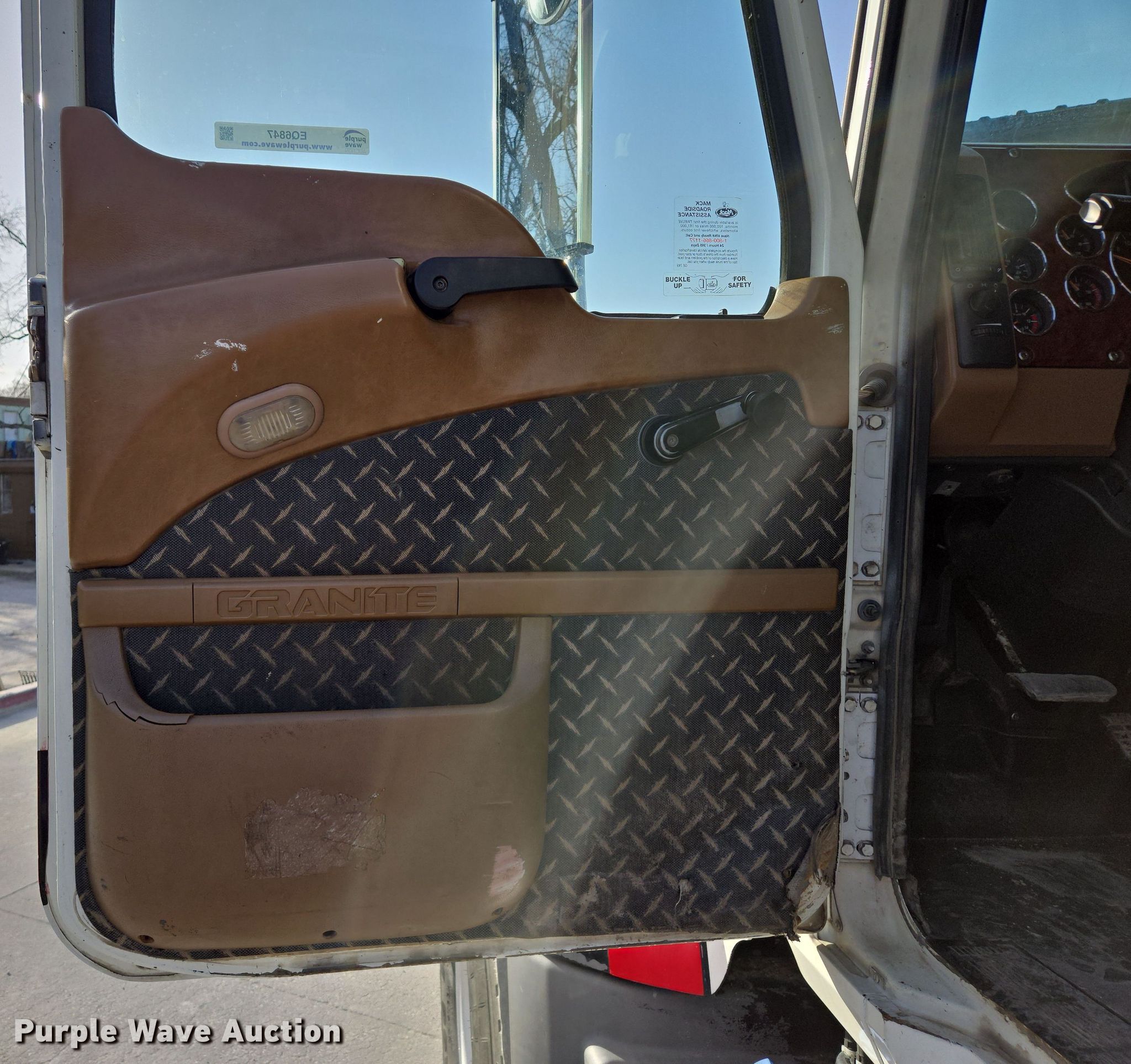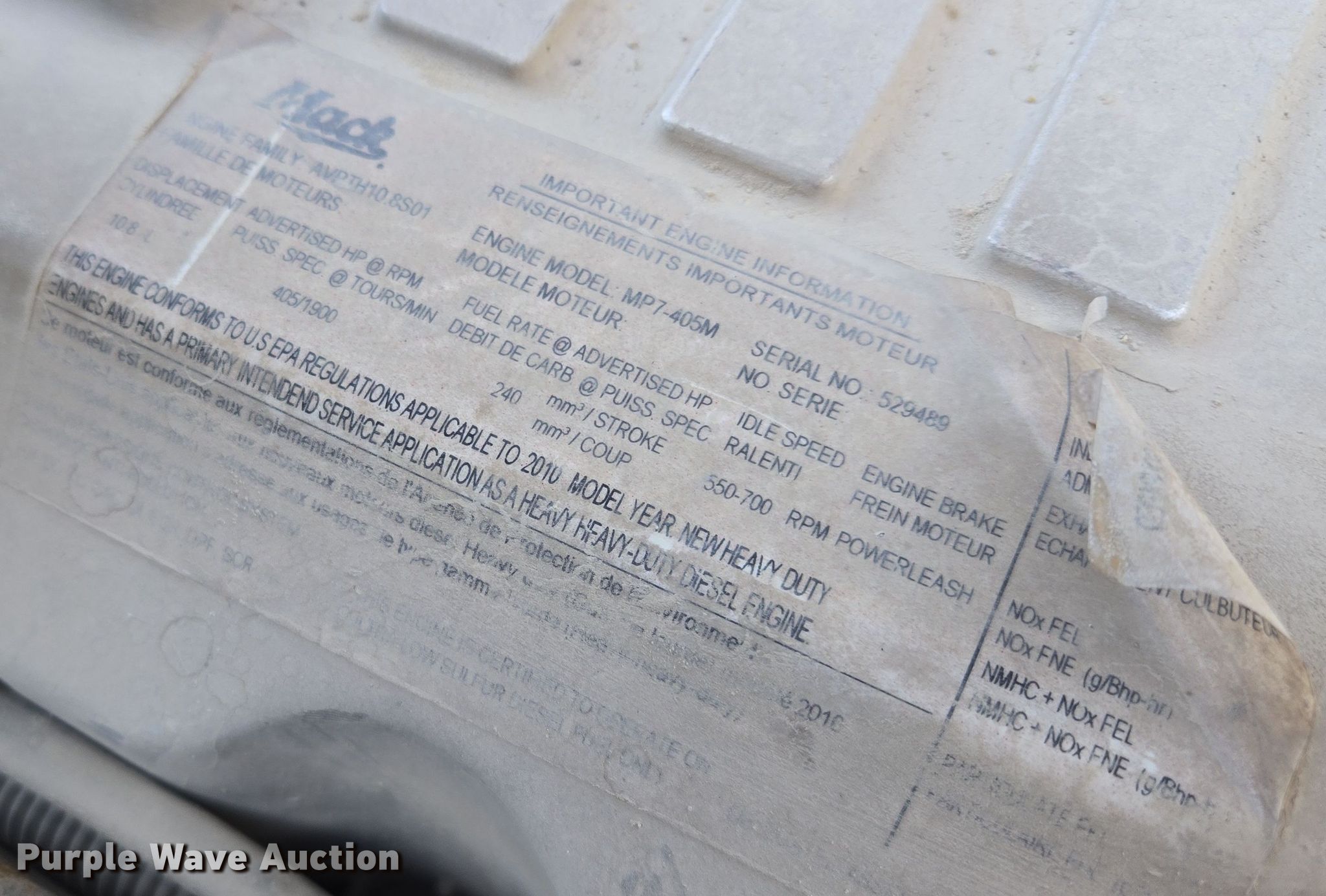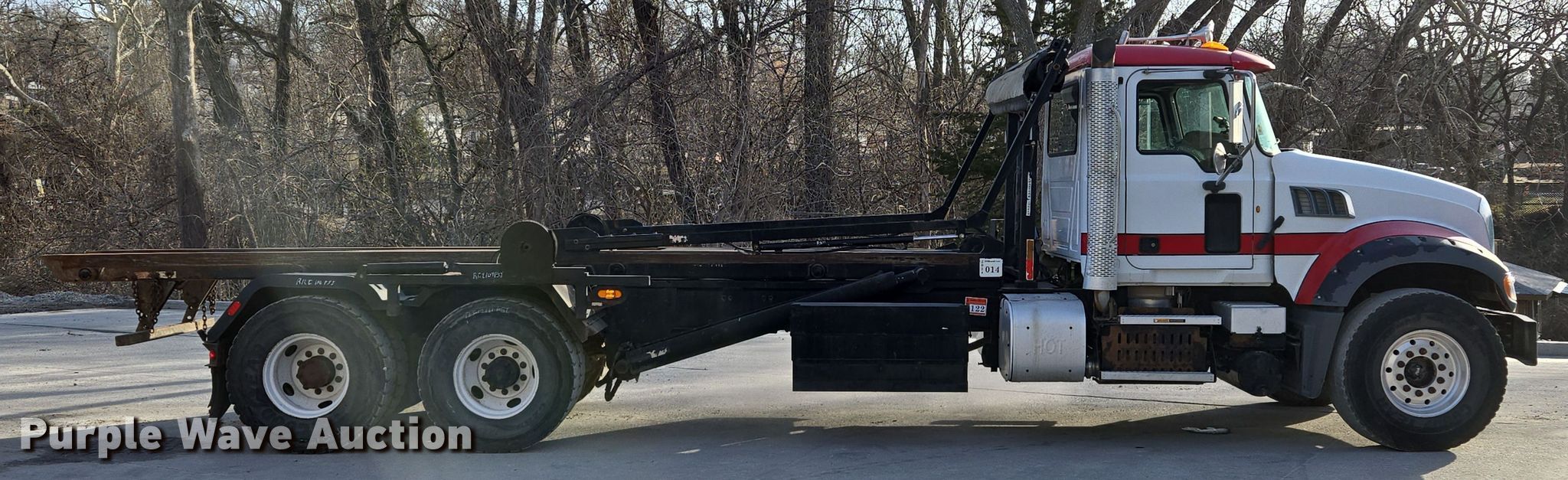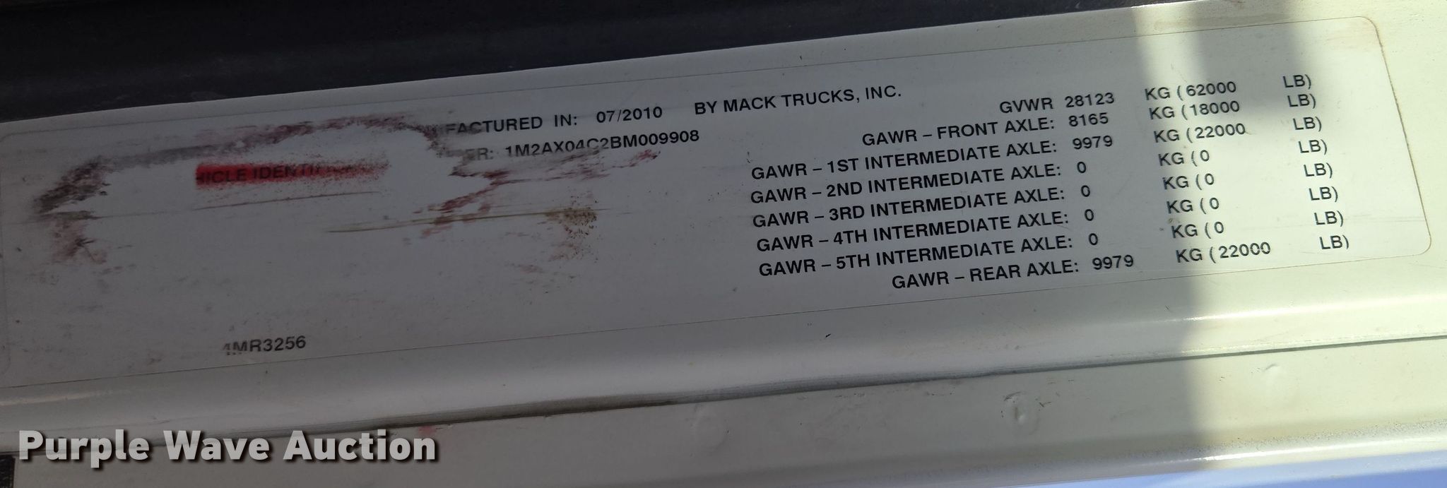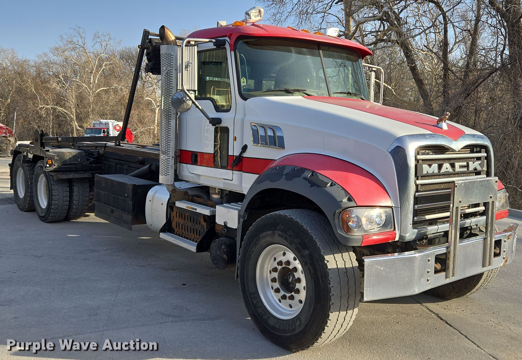 2011 Mack GU713 roll-off container truck. Miles: 499,373 on odometer, VIN: 1M2AX04C2BM009908. Engine Mack MP7-405M, Displacement: 10.8L, Cylinders: 6, Fuel type: Diesel. Transmission Mack Maxitorque ES, Manual, Speed: 10. Chassis Axles: Tandem, Suspension: Spring over walking beam, Brakes: Air, PTO. Interior AC, Heat, Cruise control. Features Roll-off bed Galbreath U5-OR-174, 23' 3" L x 108" W, Lift capacity: 60,000lbs, Ram: Dual, Roll tarp, Rolling tailboard. Tires Front: 425/65R22.5, Rear: 315/80R22.5. Missouri title. Title distribution may be delayed up to 14 days from verification of funds. Ted's Trash Service, Inc.. Independence, MO 64052