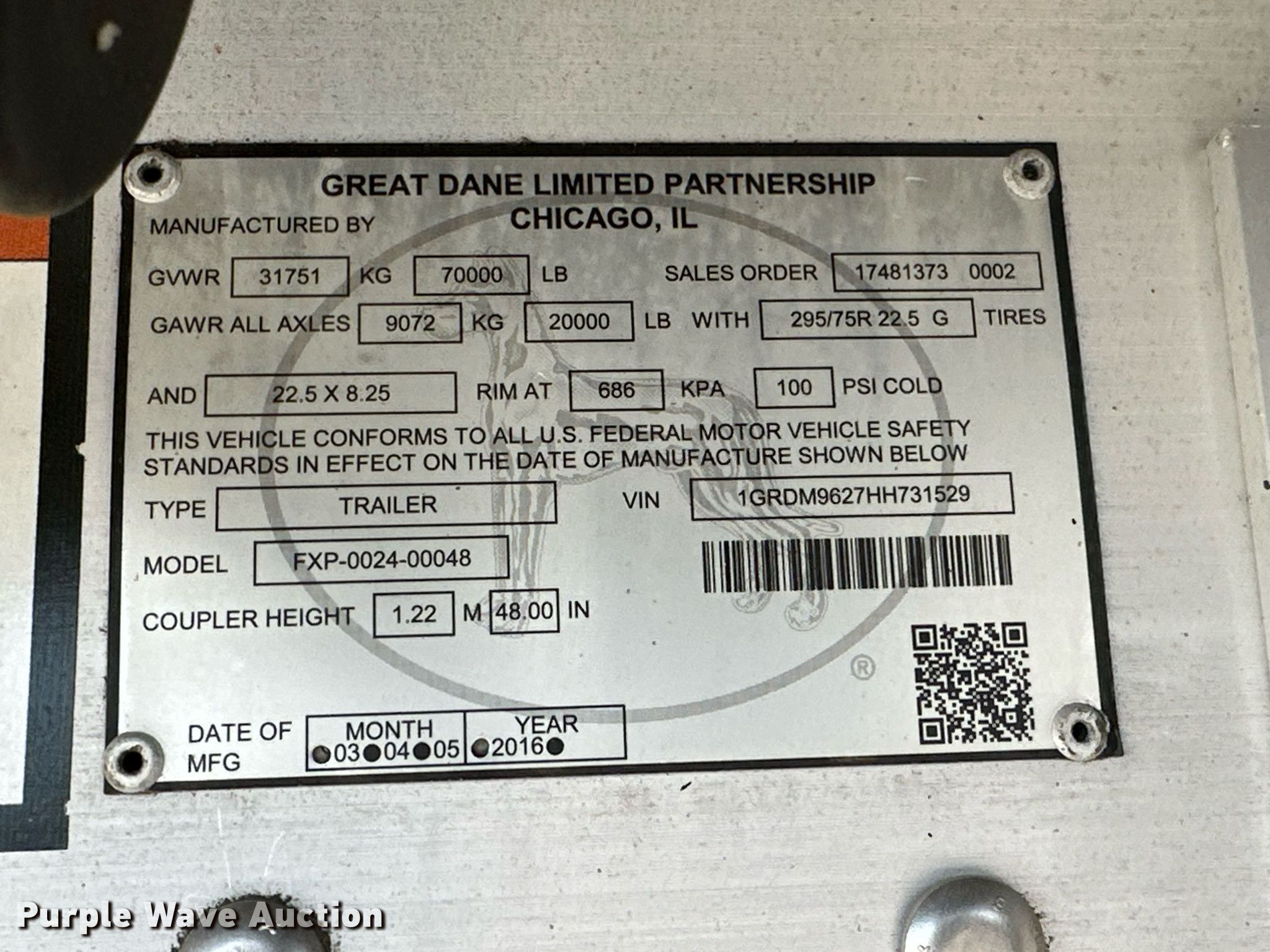 2017 Great Dane FXP-0024-00048 flatbed trailer. VIN: 1GRDM9627HH731529. Dimensions Overall: 48' L x 102" W, Deck: 48' L x 98" W. Features Deck type: Aluminum, Wood. Chassis Landing gear: Dual, Suspension: Air, Brakes: Air, Axles: Spread, GVWR: 70,000 lbs, GAWR: 20,000 lbs. Tires Aluminum wheels, Size: 295/75R22.5. Kansas title. Title distribution may be delayed up to 14 days from verification of funds. Ulysses, KS 67880