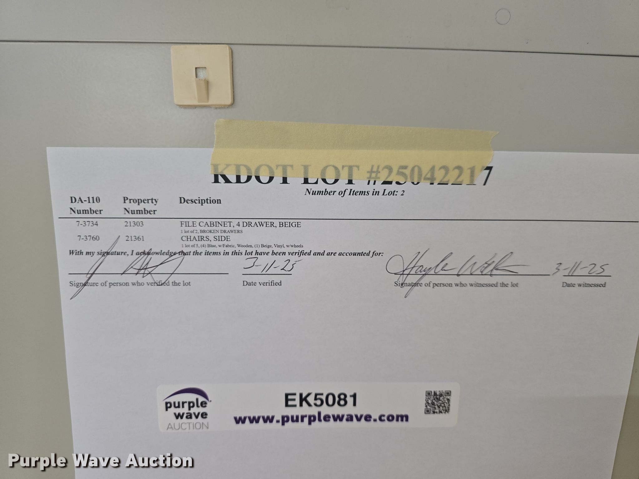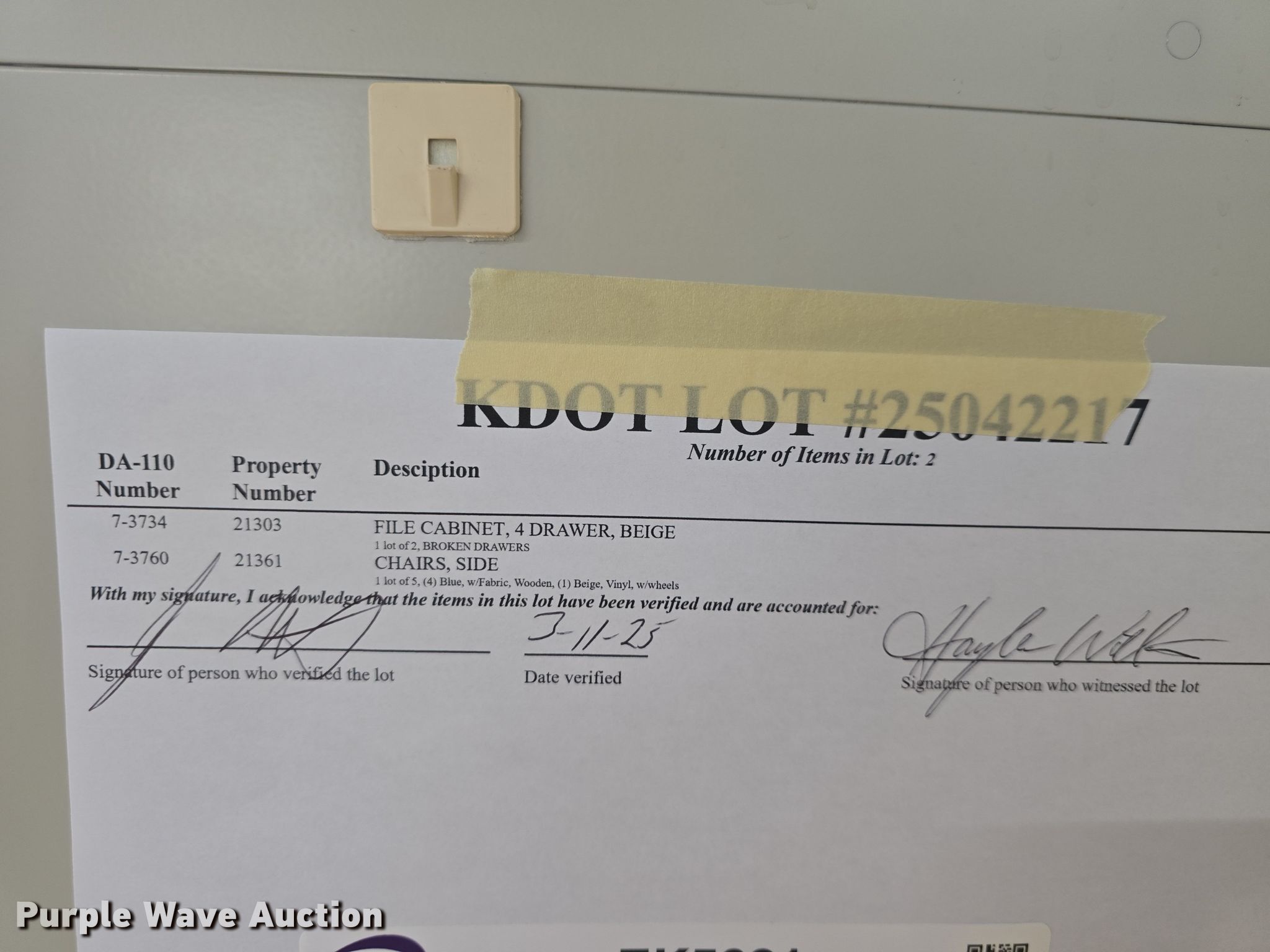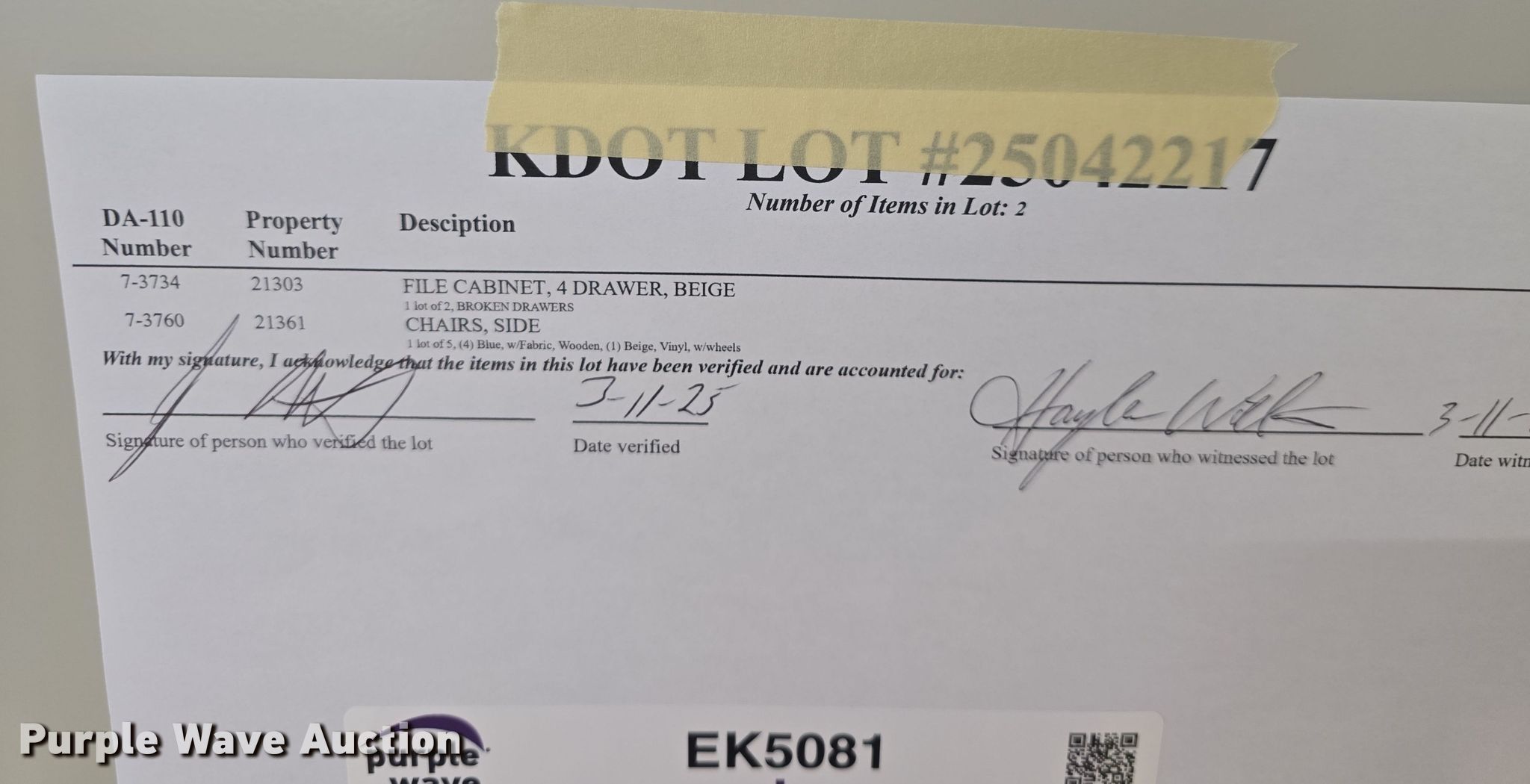 Purple Wave is selling a used Furniture in Kansas. This item is a Furniture with the following: Chairs: 5, Filing cabinets: 2, KDOT ID: 25042217