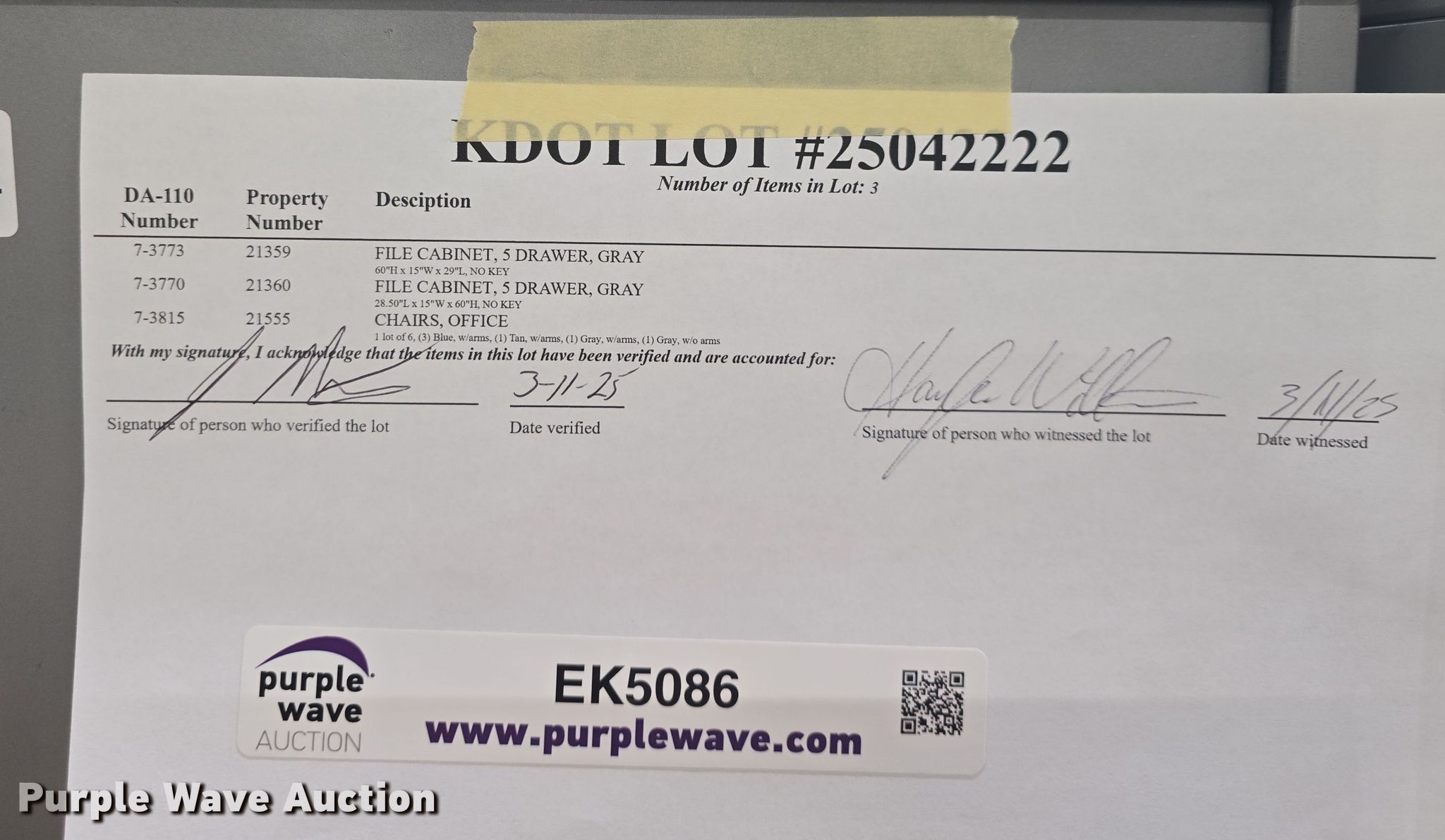 Purple Wave is selling a used Furniture in Kansas. This item is a Furniture with the following: Chairs: 6, Filing cabinets: 2, KDOT ID: 25042222