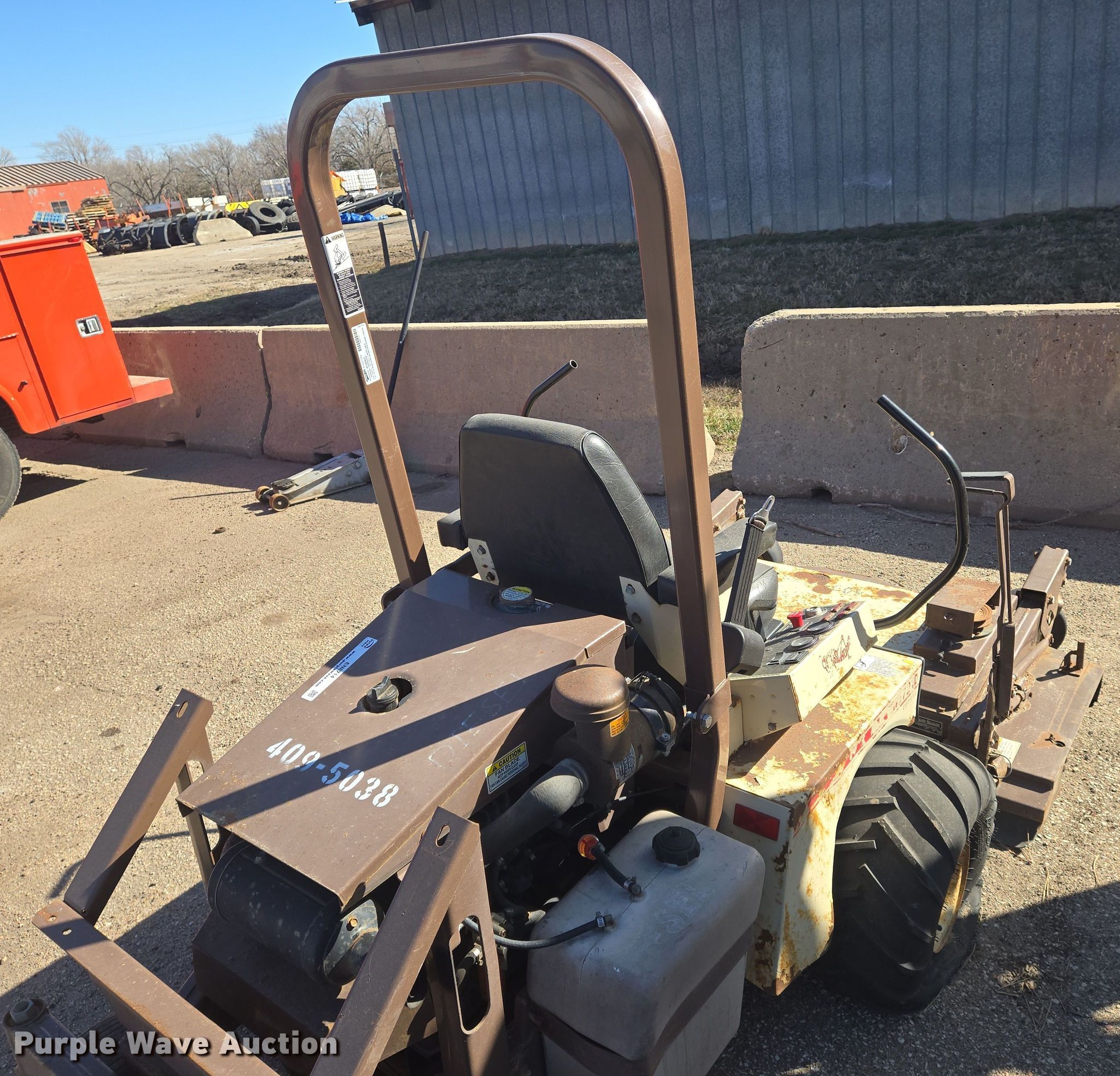 Grasshopper 721D ZTR lawn mower. Hours: 797 on meter, Cutting width: 61", Serial: 490560, KDOT ID: 409-5038. Engine Kubota D722-E, Cylinders: 3, Fuel type: Diesel. Transmission Hydrostatic. Features Flip up front deck. Tires Front: 21x11.00-8, Rear: 13x6.50-6. Notes Flat tire, Unknown operating condition. Kansas Dept. of Transportation-Shop. Hutchinson, KS 67504