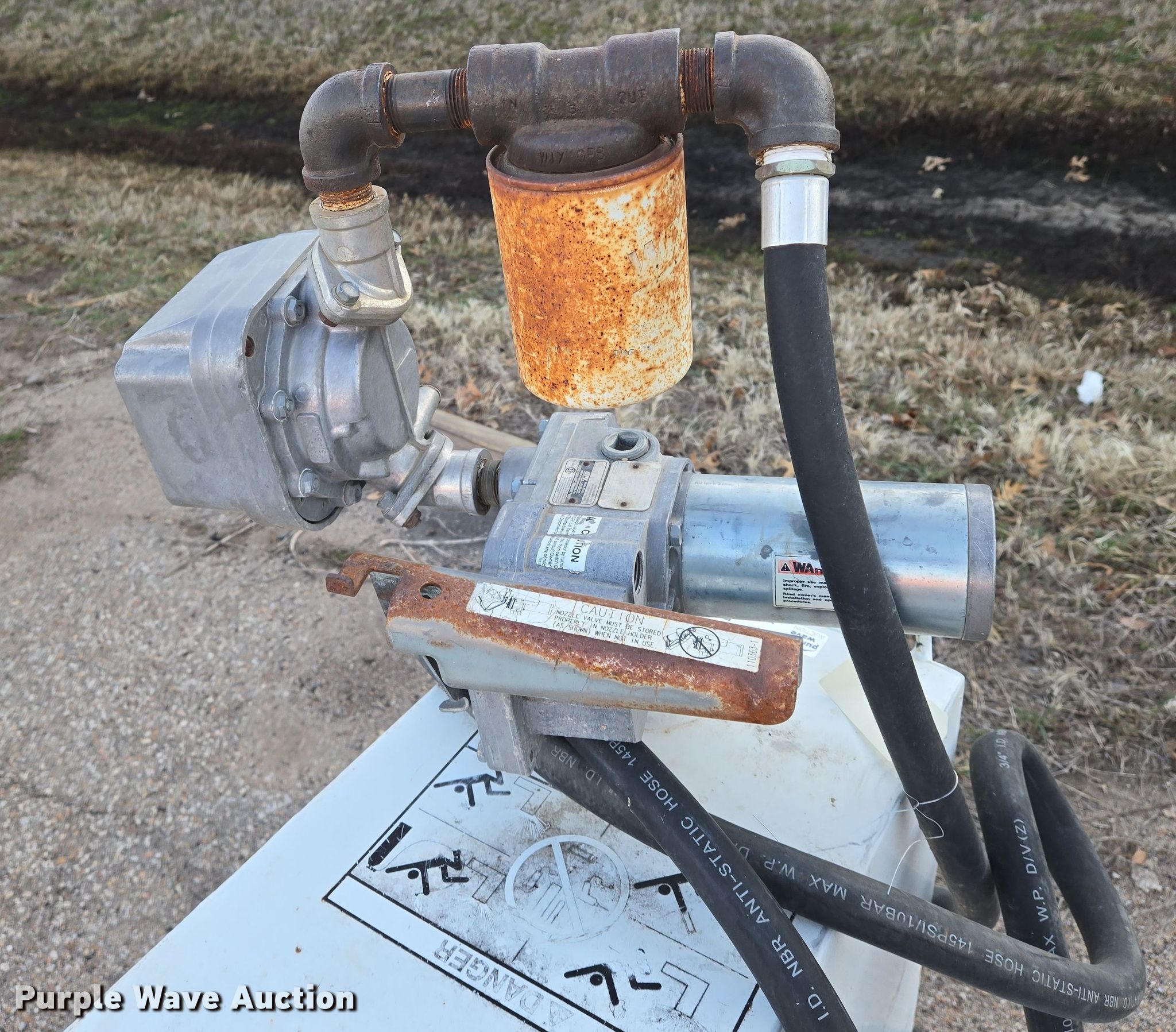 Weather guard fuel tank. KDOT ID: 50641, GPI MD-130 fuel meter, GPI 150S transfer pump, Nozzle, Unknown operating condition. Kansas Dept. of Transportation-Shop. Hutchinson, KS 67504