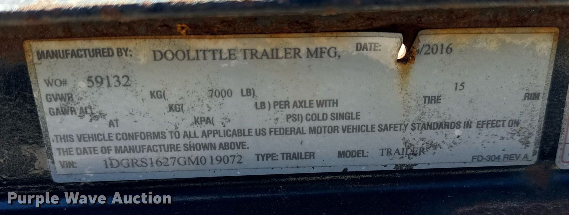 2016 Doolittle utility trailer. VIN: 1DGRS1627GM019072. Dimensions Overall: 20' L x 98" W, Deck: 16' L x 77" W, Side height: 12', Deck height: 20', Ramps: Manual Length: 60". Features Deck type: Wood. Chassis Ball hitch: 2 5/16", Landing gear: Single, Suspension: Spring, Brakes: Electric, Axles: Tandem, GVWR: 7,000 lbs, GAWR: 3,500 lbs. Tires Steel wheels, Size: 205/75R16. Missouri title. Title distribution may be delayed up to 30 days from verification of funds. Ken Becker & Sons. Lannon, WI 53046