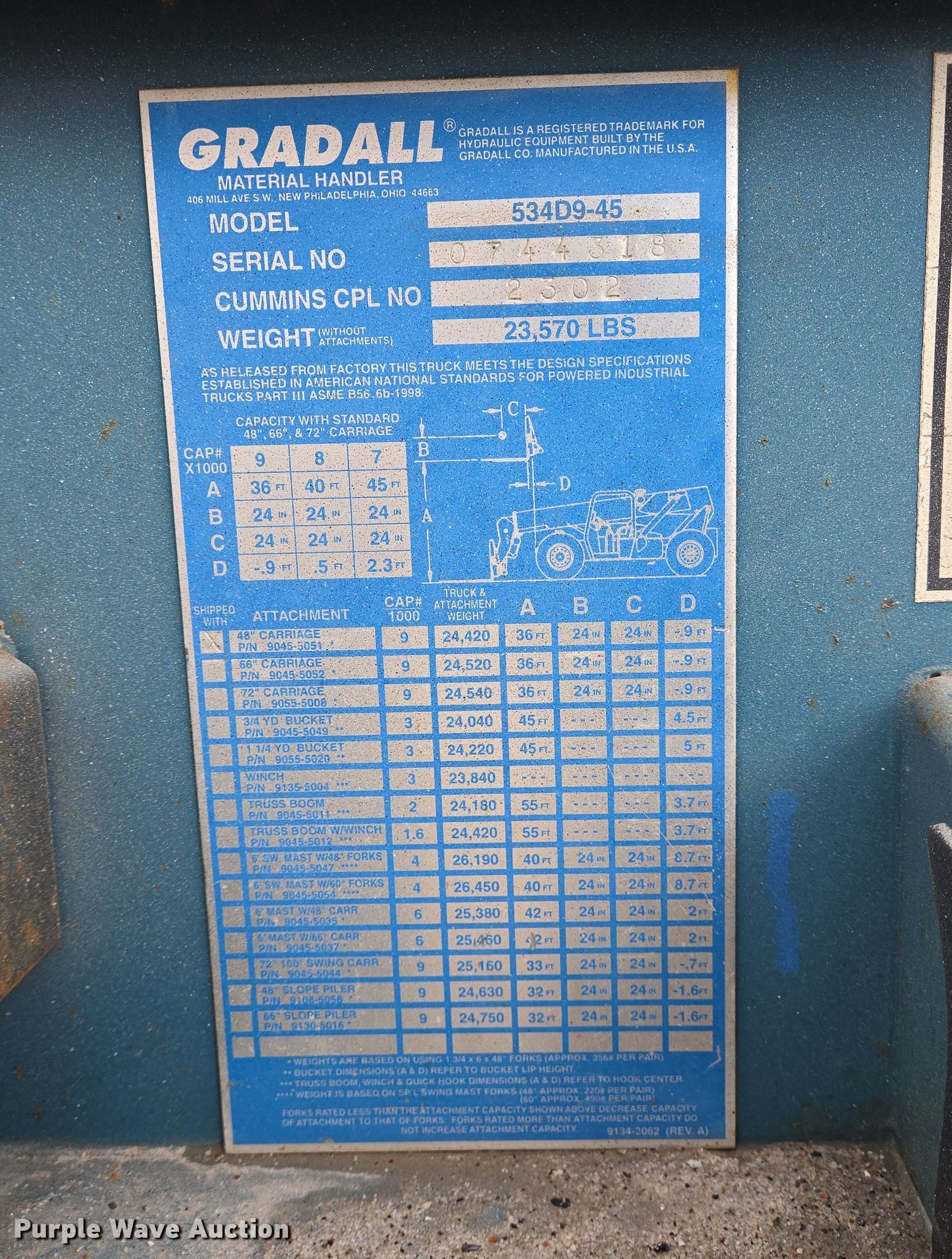 2007 Gradall 534D9-45 telehandler. Hours: Unknown, Miles or hours may vary, unit still in use, Serial: 0744318. Engine Cummins, Cylinders: 4, Fuel type: Diesel. Transmission Powershift, Four wheel drive. Operators station Canopy. Features Maximum lift capacity: 9,000 lbs, Maximum lift height: 46', Boom stages: 3, Fork length: 48", Hydraulic leveling, Quick attach: Manual. Tires Size: 13.00-24. Notes Seat missing, Non-operational hour meter. LAC Services – Fabrication. Robstown, TX 78380
