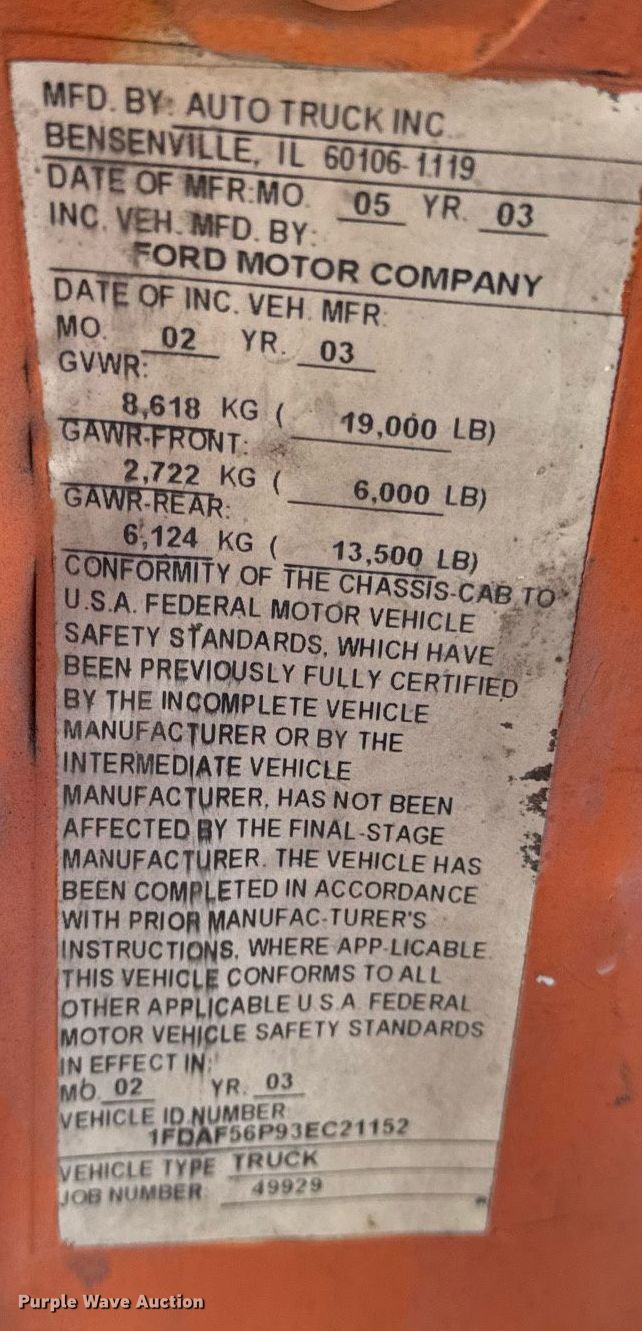 2003 Ford F550 Super Duty dump truck. Miles: 141,129 on odometer, VIN: 1FDAF56P93EC21152, Unit #: 1756. Engine Displacement: 6.0L, Cylinders: 8, Fuel type: Diesel. Transmission Automatic. Chassis Axles: Single. Interior AC, Heat. Features Dump bed 11' L x 93" W, Ram: Single. Tires Size: 225/70R19.5. Notes Non-operational unit Unit must be towed or hauled. Illinois title. Title distribution may be delayed up to 14 days from verification of funds. Builders Concrete Services, LLC. Hillside, IL 60162