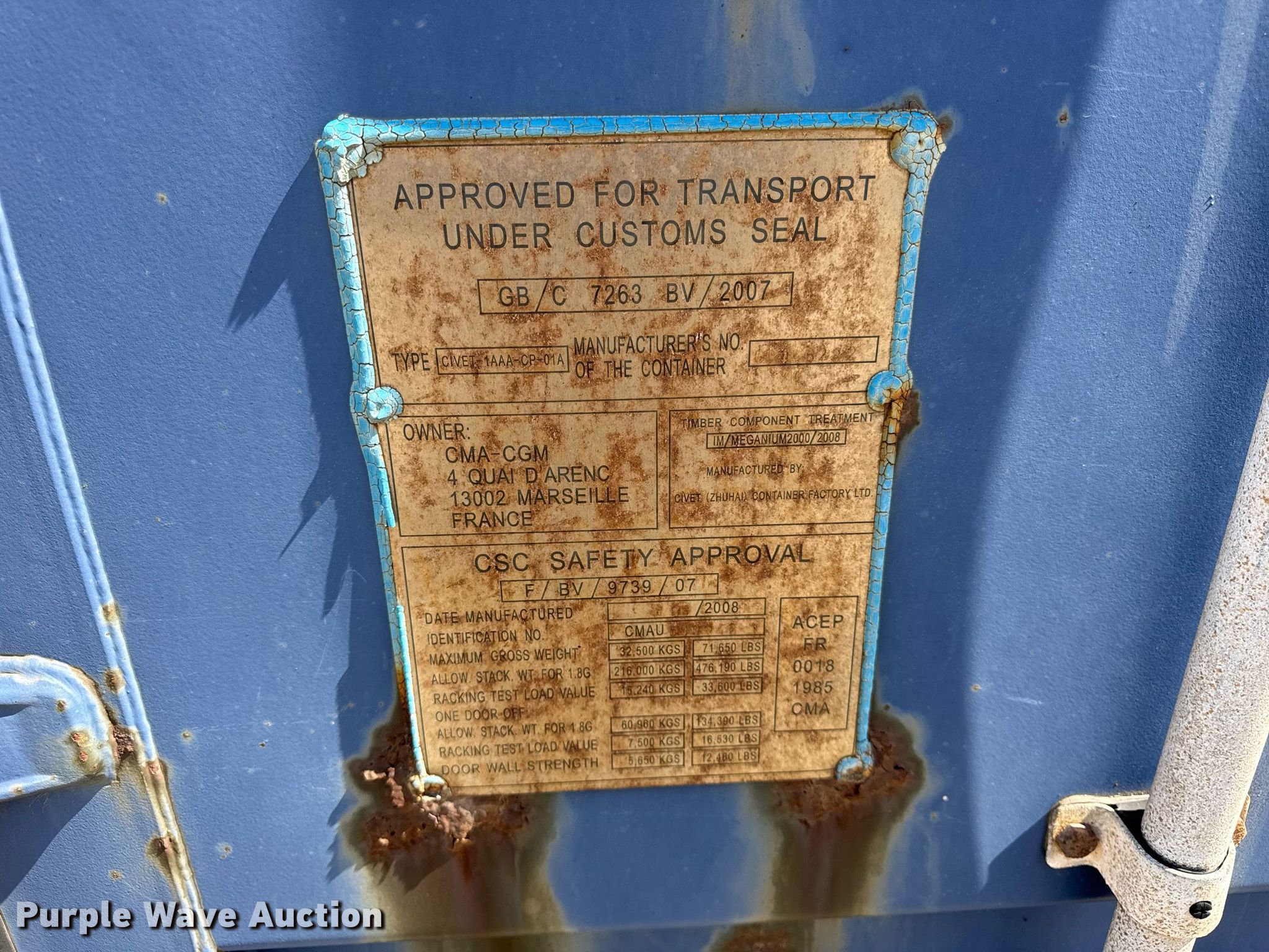 2007 CIVET shipping container. Unit #: 553942-7, 40' L x 8' W x 9' 6"H. Corner Carriers Brokerage Inc. Decatur, IL 62526
