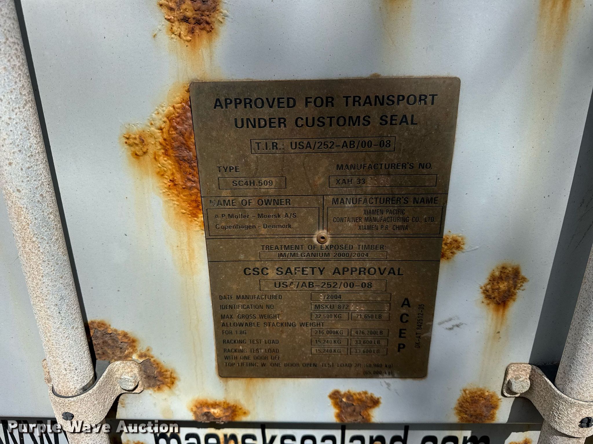 Purple Wave is selling a used Storage or Shipping Container in Illinois. This item is a 2004 Xiamen Pacific shipping container with the following: Unit #: MSKU872284-9, 40' L x 8' W x 9' 6" H