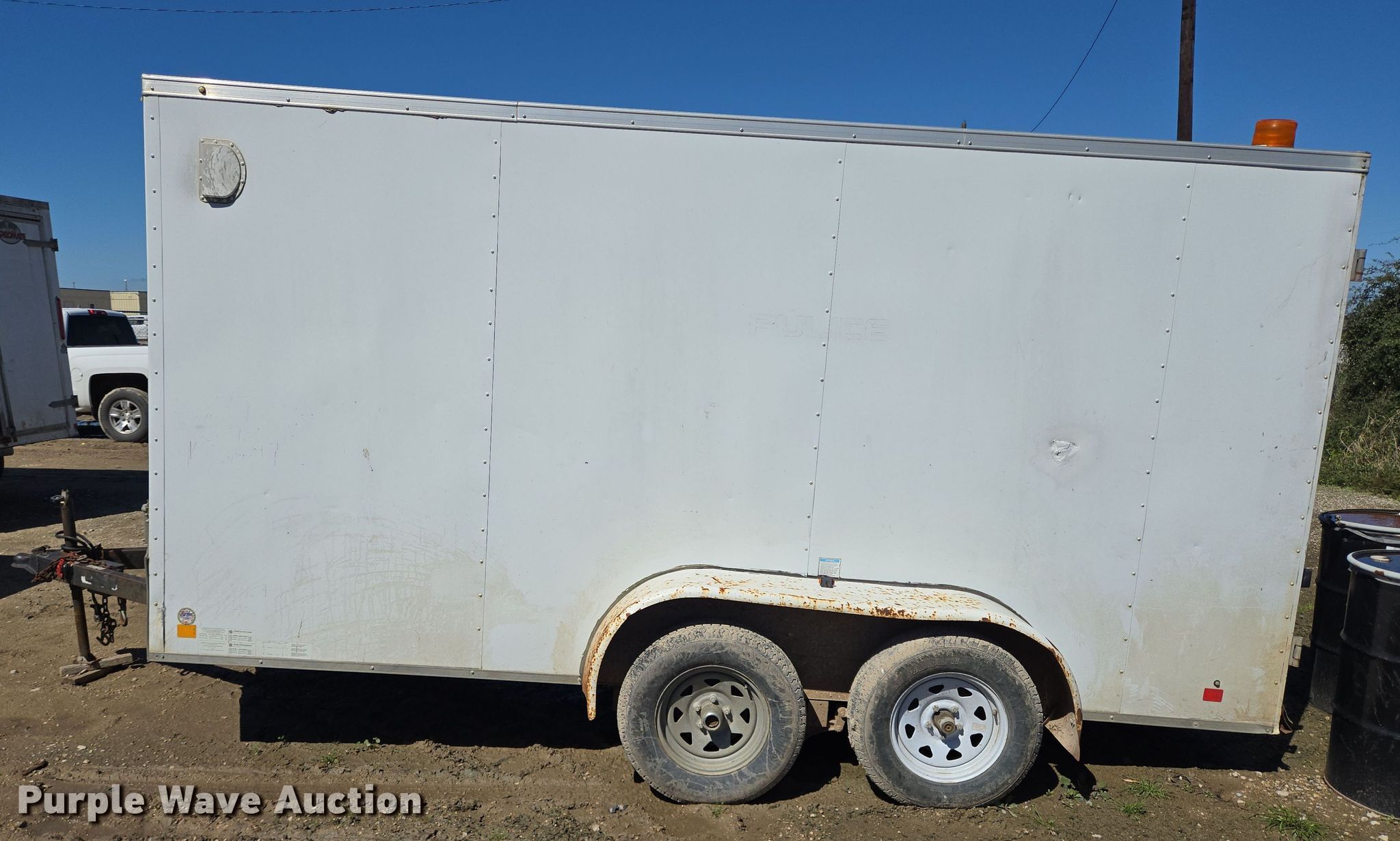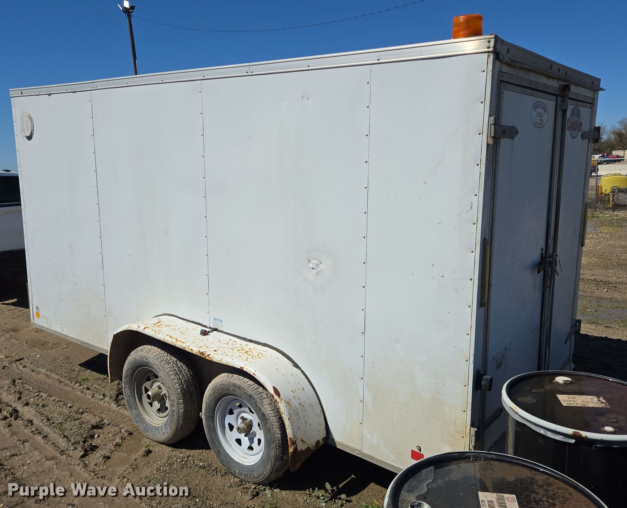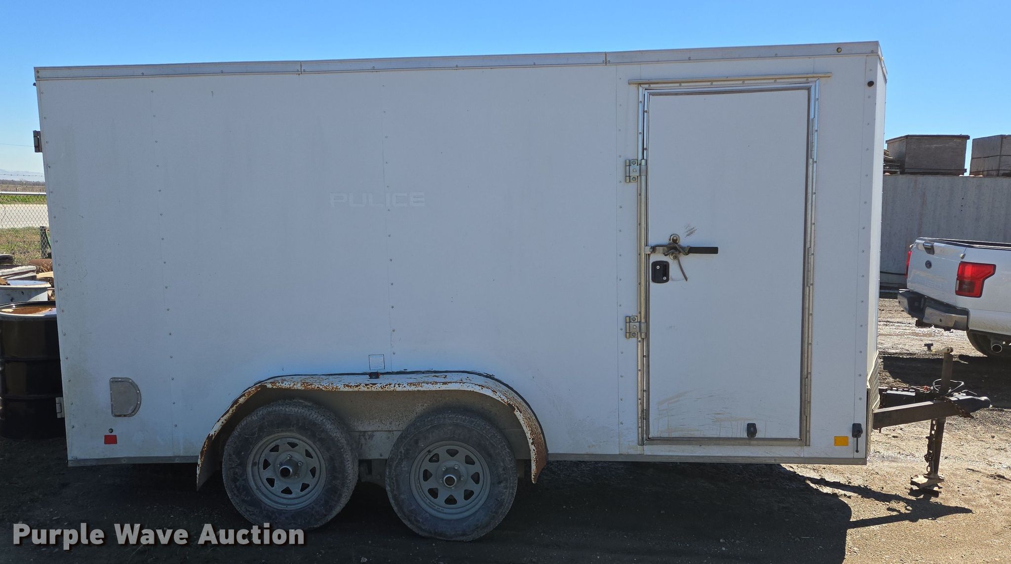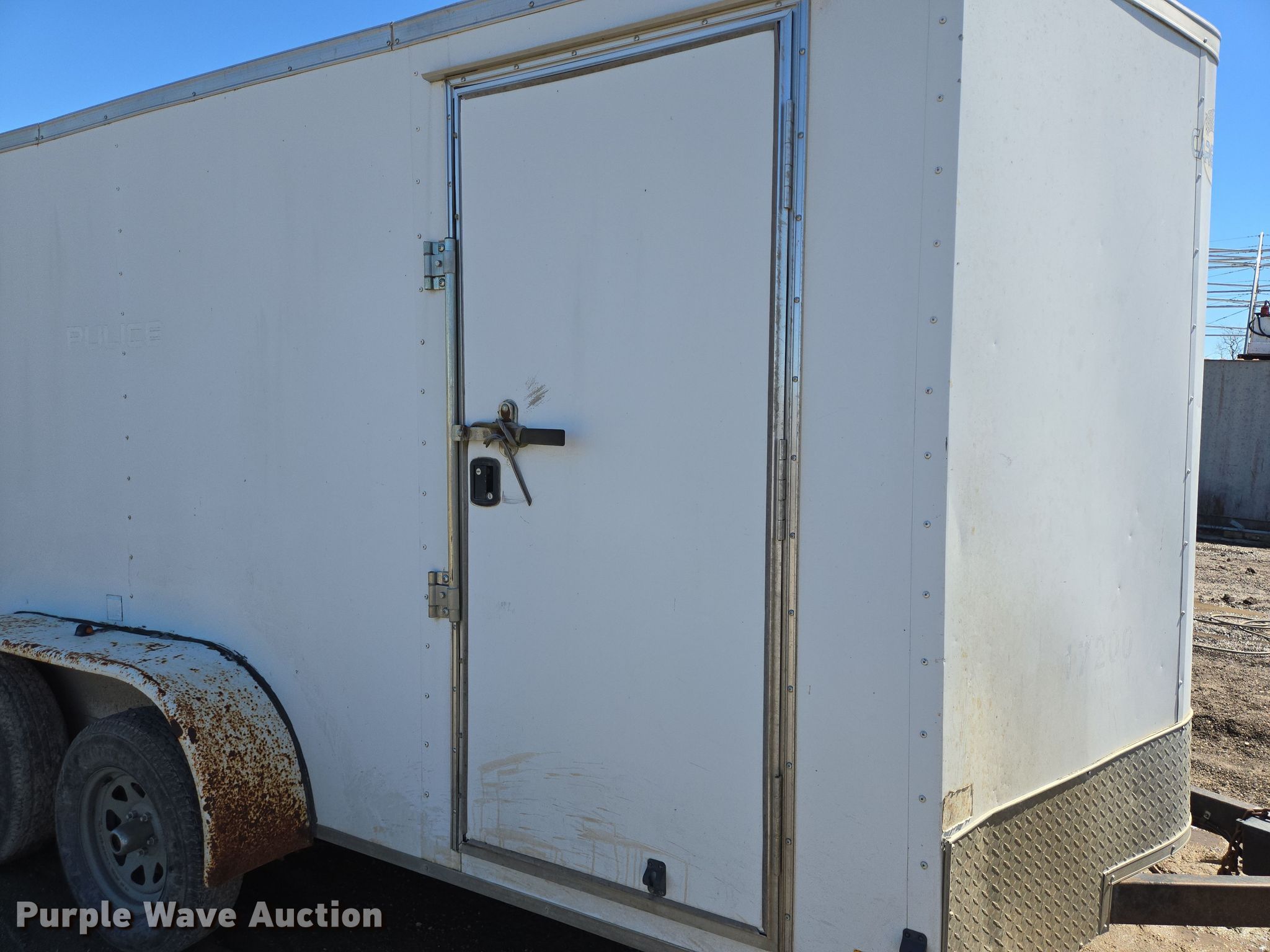 2018 Forest River Cargo Mate enclosed cargo trailer. VIN: 5NHULE422JY077079. Dimensions Overall: 15' L x 77" W. Features Deck type: Wood. Chassis Ball hitch: 2 5/16", Landing gear: Single, Suspension: Spring, Brakes: Electric, Axles: Tandem. Tires Steel wheels, Size: 205/75R15. Texas title. Title distribution may be delayed up to 30 days from verification of funds. Pulice Construction. Damon, TX 77430