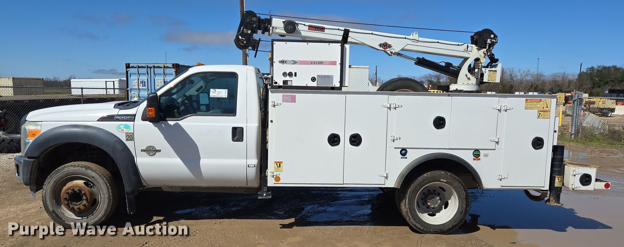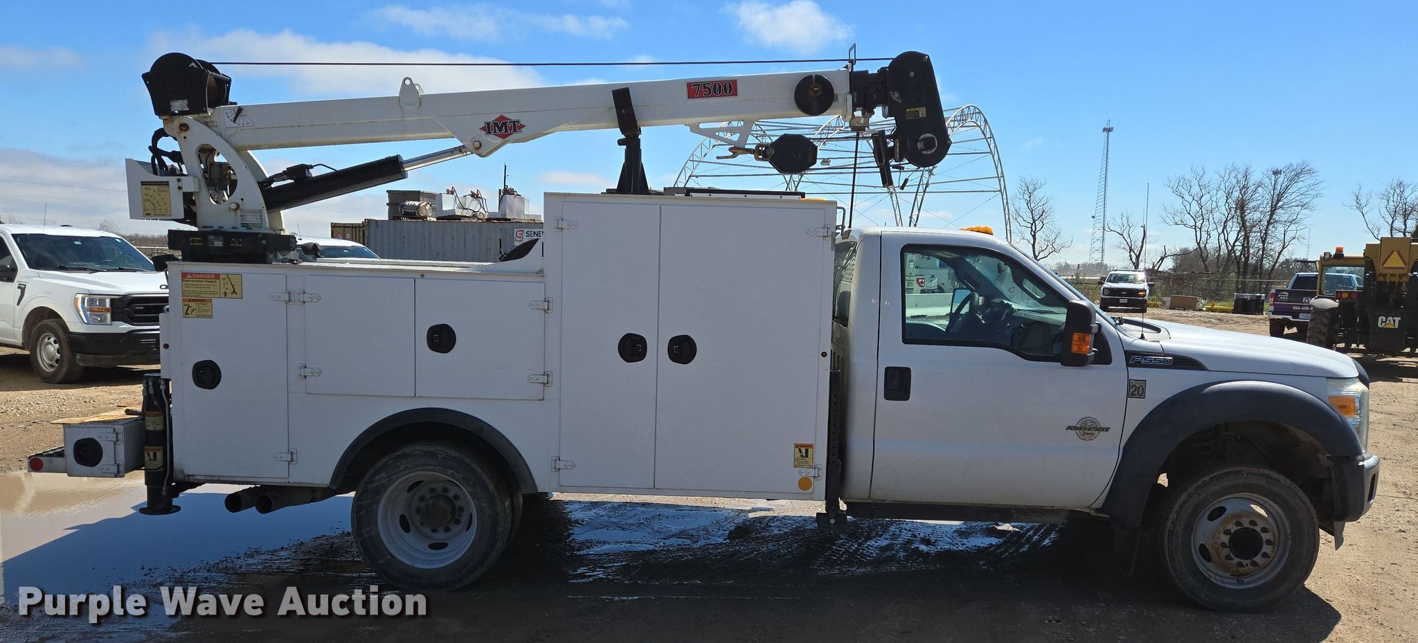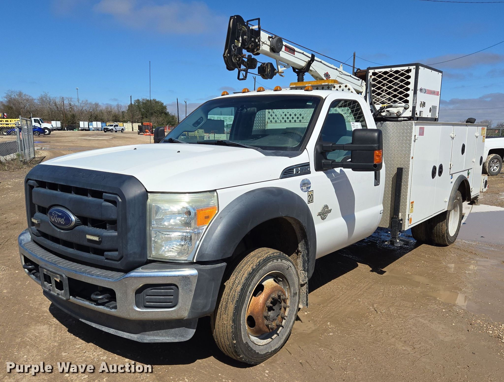 2015 Ford F550 Super Duty XL utility / service truck. Miles: 182,526 on odometer, VIN: 1FDUF5GTXFED70392. Engine Displacement: 6.7L, Cylinders: 8, Fuel type: Diesel. Transmission Automatic. Chassis Axles: Single, Suspension: Spring, PTO, GVWR: 19,500 lbs, Wheelbase: 164". Interior AC, Heat, Power windows, Power locks, Cruise control, Auxiliary controls. Features Bed 11' L x 92" W, Air compressor IMT CAS40P, Crane IMT 7500, Maximum boom length: 21.5' Maximum lift capacity: 7,500 lbs.. Tires Size: 225/70R19.5. Texas title. Title distribution may be delayed up to 30 days from verification of funds. Pulice Construction. Damon, TX 77430