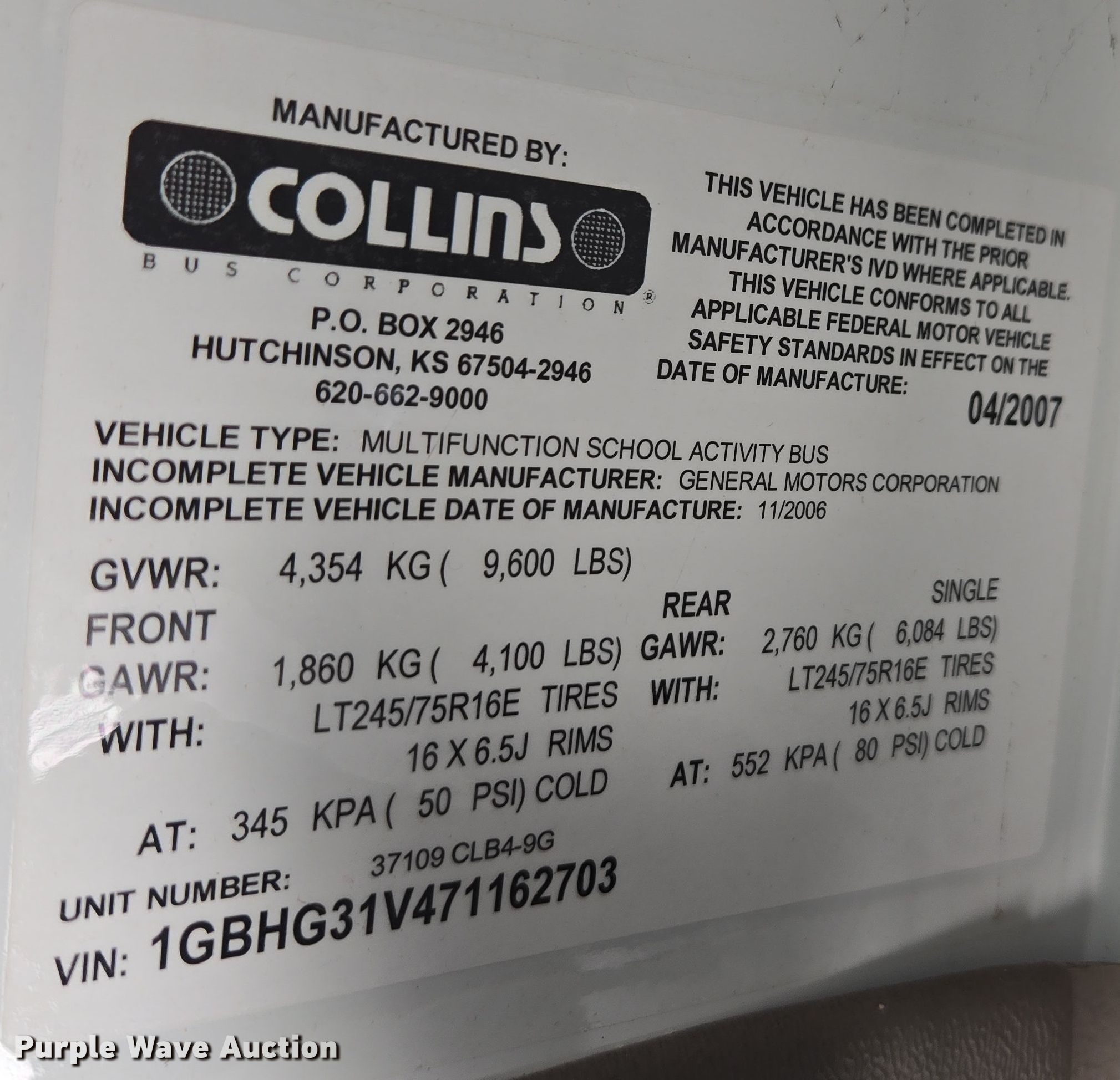 Purple Wave is selling a used Bus in Tennessee. This item is a 2007 Chevrolet 1500 school bus with the following: Miles: 67,111 on odometer, VIN: 1GBHG31V471162703