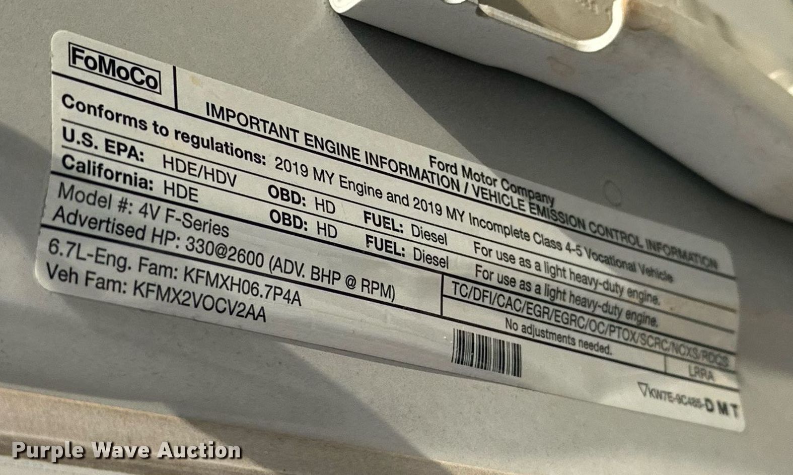 2019 Ford F550 Super Duty truck cab and chassis. Miles: 127,607 on odometer, VIN: 1FDUF5GT4KEF60473. Engine Displacement: 6.7L, Cylinders: 8, Fuel type: Diesel. Transmission Automatic. Interior AC, Heat, Heated mirrors, Power windows, Power locks, Cruise control. Tires Size: 225/70R19.5. Notes Dash warning indicator: ABS, Traction control, Windshield chipped or cracked, Hail damage. Oklahoma title. Title distribution may be delayed up to 14 days from verification of funds. Midstate Traffic Conrol Inc. Oklahoma City, OK 73114