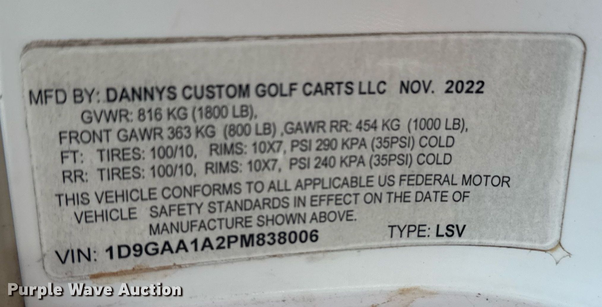 Purple Wave is selling a used Golf Cart in Oklahoma. This item is a 2022 Dannys Custom Golf Carts golf cart with the following: VIN: 1D9GAA1A2PM838006