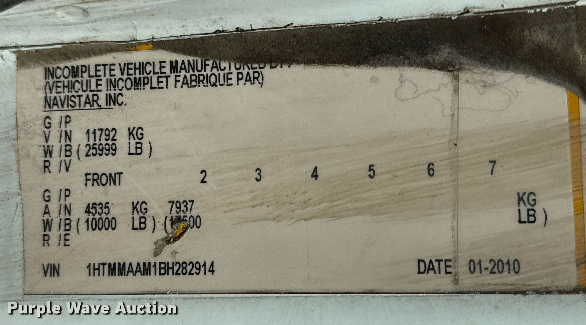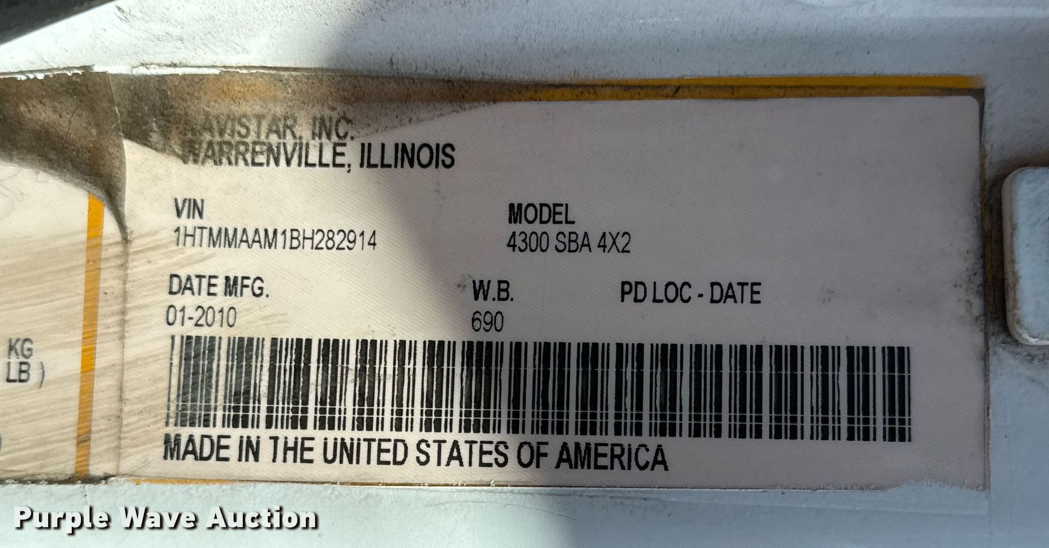 2011 International 4300 flatbed truck. Miles: 216,190 on odometer, Hours: 6,764 on meter, VIN: 1HTMMAAM1BH282914. Engine International GDT210, Displacement: 7.6L, Cylinders: 6, Fuel type: Diesel. Transmission Automatic. Chassis Axles: Single, Suspension: Spring, Brakes: Hydraulic, GVWR: 25,999 lbs. Interior AC, Heat, Cruise control. Features Flatbed 20' L x 96" W, Removable sides, Side height: 30", Arrow board Trafcon SmartFlash II remote control. Tires Size: 11R22.5. Notes Dash warning indicator: Fault code. Oklahoma title. Seller is an Oklahoma licensed motor vehicle dealer. Title will be assigned and distributed by the dealer. Please contact the seller for distribution questions. Title distribution may be delayed up to 30 days from verification of funds. 15107 North 137th East Avenue. Collinsville, OK 74021