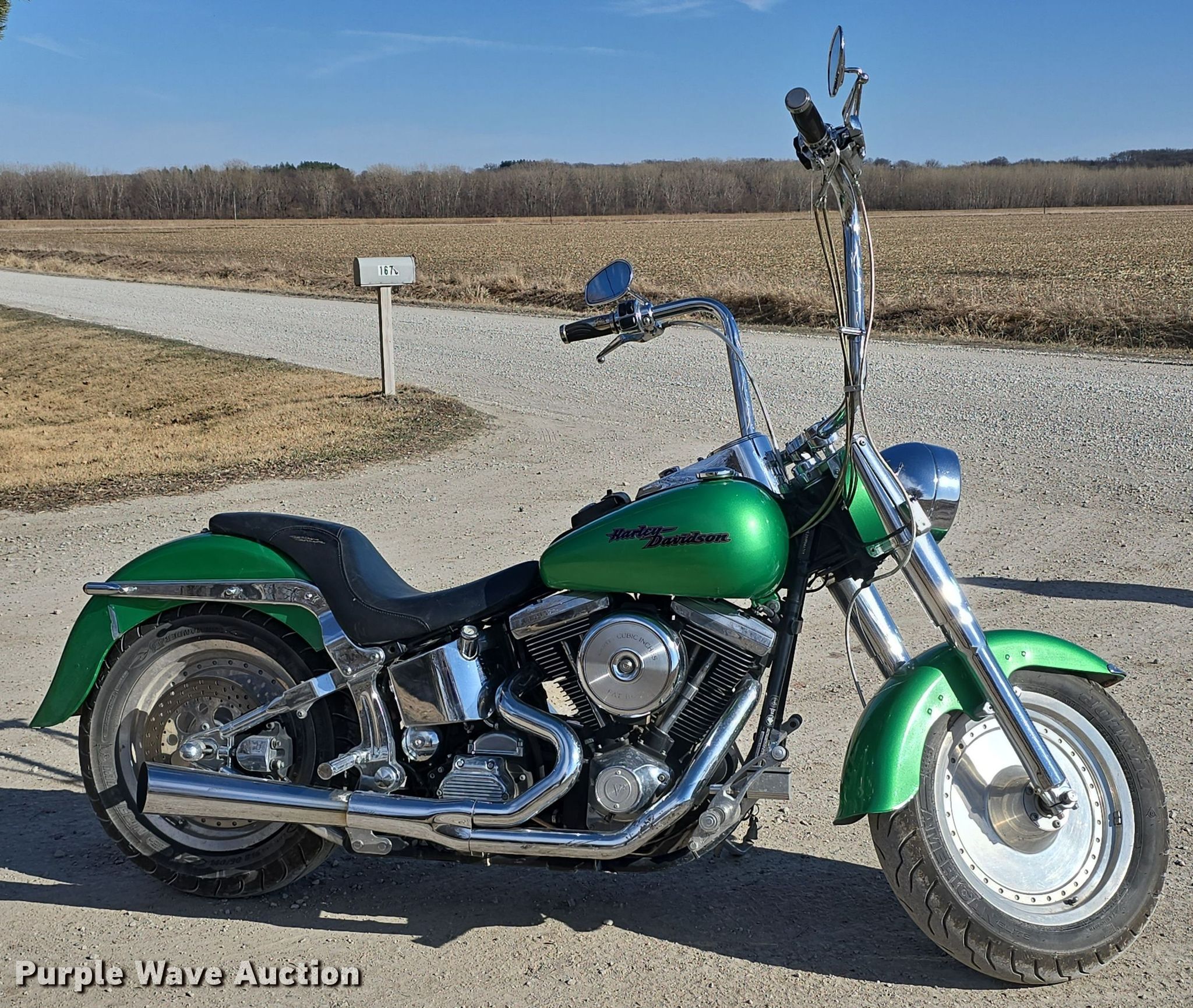 1998 Harley Davidson Fat Boy motorcycle. Miles: 23,146 on odometer, Miles or hours may vary, unit still in use, VIN: 1HD1BML12WY054628. Engine Displacement: 1,340 cc, Cylinders: 2, Fuel type: Gas. Transmission Manual, Speed: 5. Tires Front: MT90B16 M/C, Rear: 140/90B16. Notes Additional seat. Iowa title. Title distribution may be delayed up to 14 days from verification of funds. OBrien Equipment Service. Red Oak, IA 51566