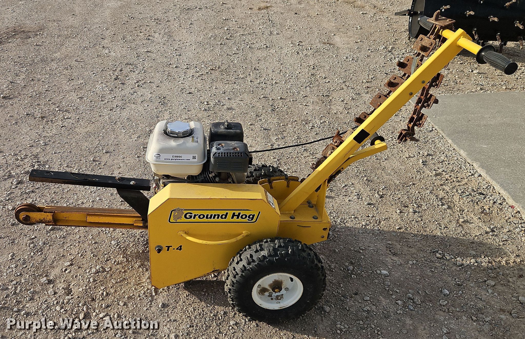 Purple Wave is selling a used Trencher or Rock Saw in Kansas. This item is a Gound Hog T-4-HS18 trencher with the following: Serial: 14923