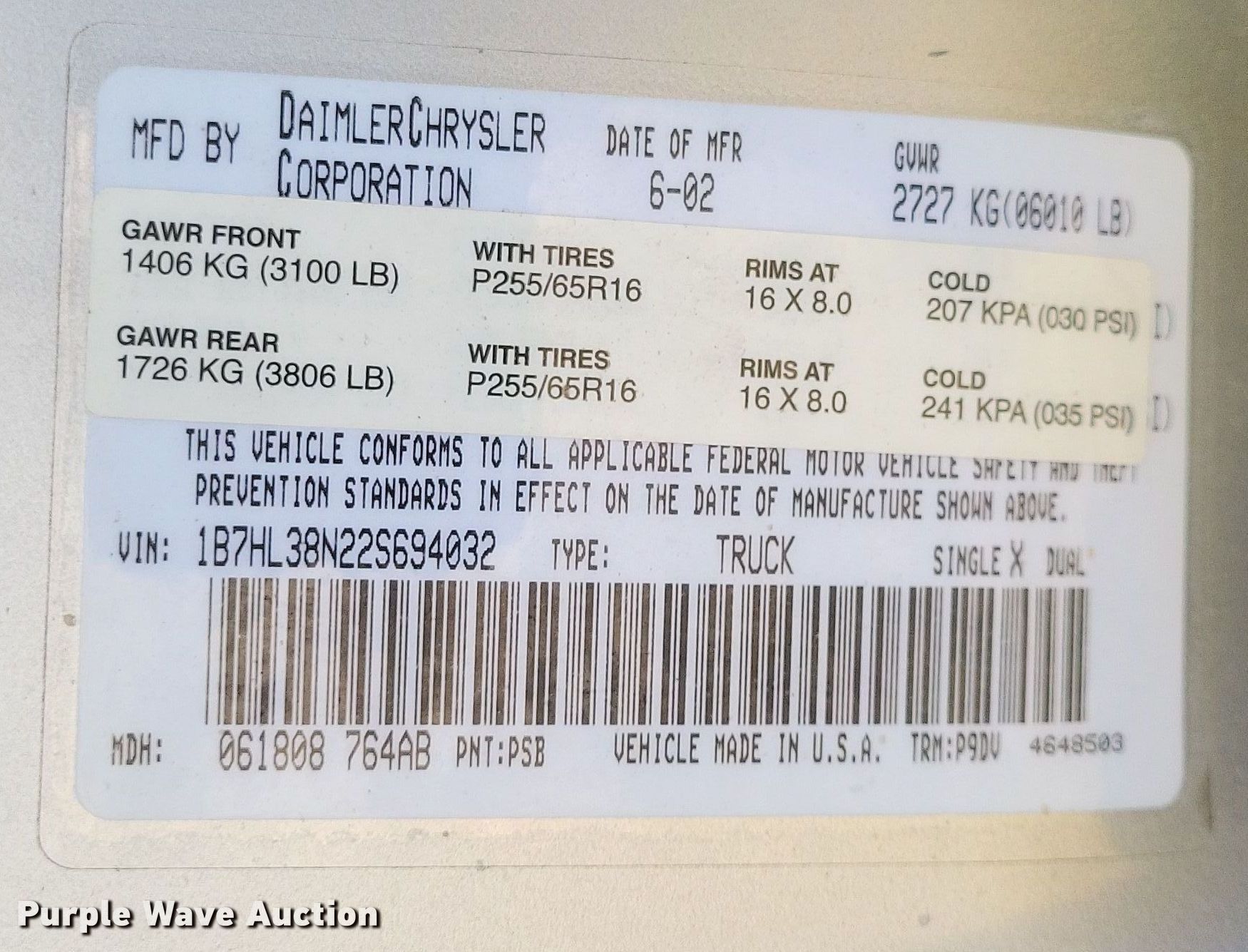 Purple Wave is selling a used Compact Pickup or Van in Missouri. This item is a 2002 Dodge Dakota Sport Quad Cab pickup truck with the following: Miles: 191,296 on odometer, VIN: 1B7HL38N22S694032