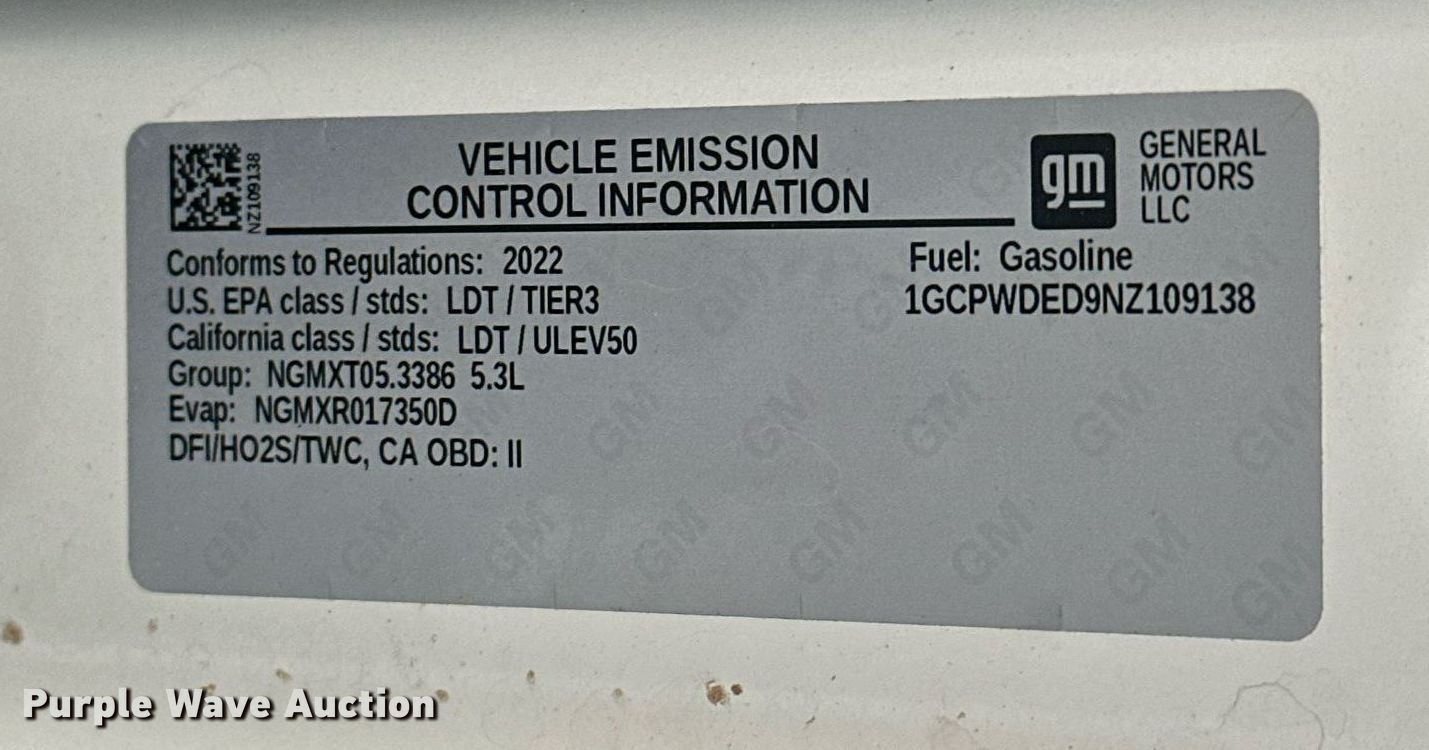 2022 Chevrolet Silverado 1500 Crew Cab pickup truck. Miles: 101,162 on odometer, VIN: 1GCPWDED9NZ109138. Engine Displacement: 5.3L V8 OHV, Cylinders: 8, Fuel type: Gas. Transmission Automatic. Interior AC, Heat, Seat: Power driver, Heated mirrors, Power windows, Power locks, Cruise control, Backup camera. Tires Size: LT275/60R20. Notes Windshield chipped or cracked. Oklahoma title. Title distribution may be delayed up to 30 days from verification of funds. Gemini Motor Transport. Oklahoma City, OK 73127