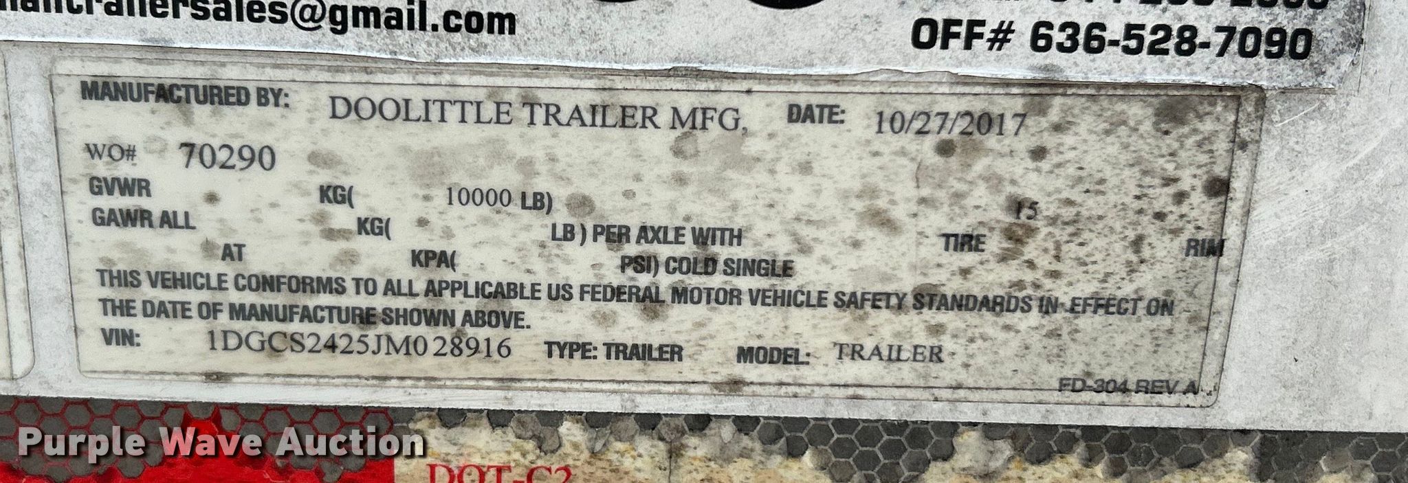 2018 Doolittle enclosed cargo trailer. VIN: 1DGCS2425JM028916. Dimensions Overall: 29' L x 100" W, Body: 27' 6" L x 100" W. Features Deck type: Wood. Chassis Ball hitch: 2 5/16", Landing gear: Single, Brakes: Electric, Axles: Tandem, GVWR: 10,000 lbs. Tires Steel wheels, Size: 225/75R15. Notes Contents included. Missouri title. Title distribution may be delayed up to 14 days from verification of funds. Troy, MO 63379