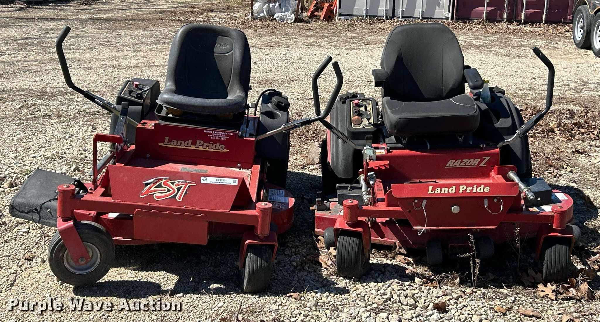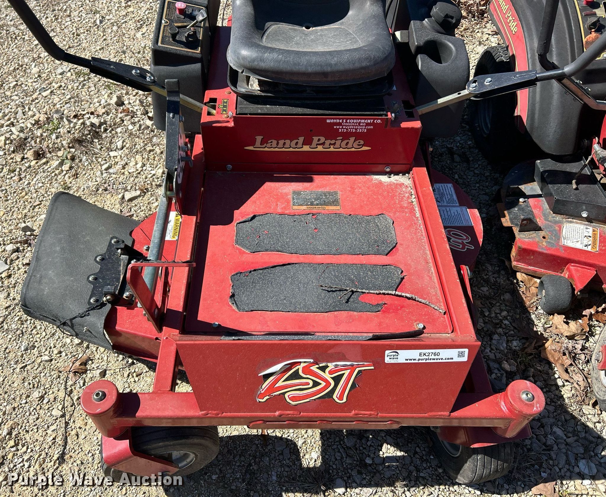2007 Land Pride Z52 ZTR lawn mower. Cutting width: 52", Serial: 558719. Engine Honda, Displacement: 615 cc, Cylinders: 2, Fuel type: Gas. Tires Front: 11x4.00-5, Rear: 18x9.50-8. Notes Non-operational unit. 2012 Land Pride ZST40 ZTR lawn mower Cutting width: 40", Serial: 714681. Engine Kawasaki FR541V, Cylinder: 2, Fuel type: Gas. Tires Front: 11x4.00-5, Rear: 18x7.50-8. Notes Non-operational unit Wayde's Equipment Co LLC. Cuba, MO 65453