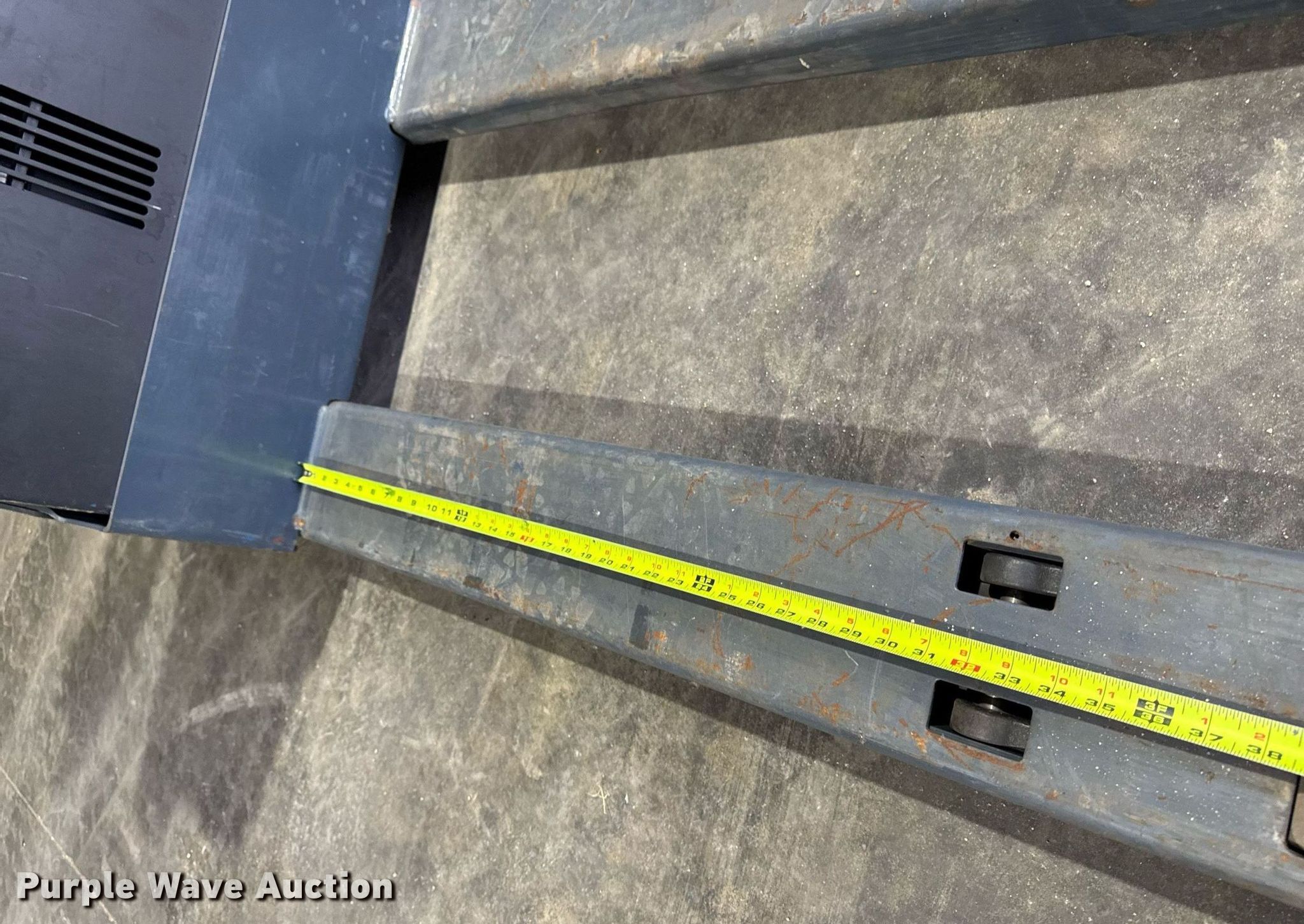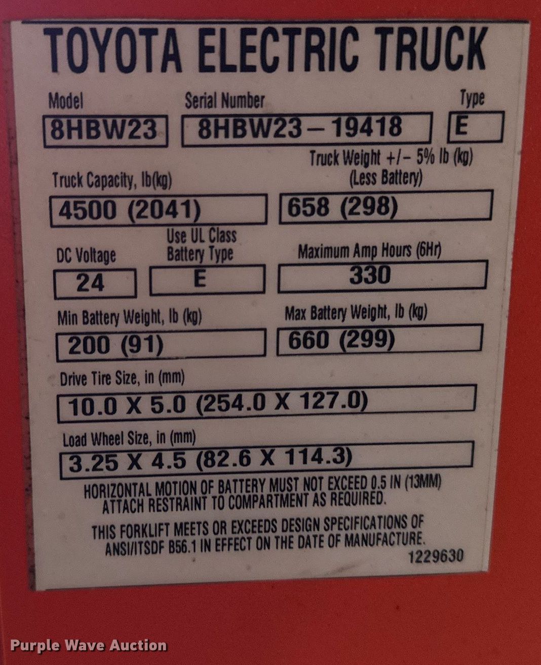 Toyota 8HBW23 pallet jack. Hours: 14 on meter, Serial: 19418. Electric Motor Volts: 24, Charger: Single phase. Transmission Hydrostatic. Features Maximum lift capacity: 4,500 lbs, Maximum lift height: 9", Fork length: 45". West Side Salvage Company LLC. Atkins, IA 52206