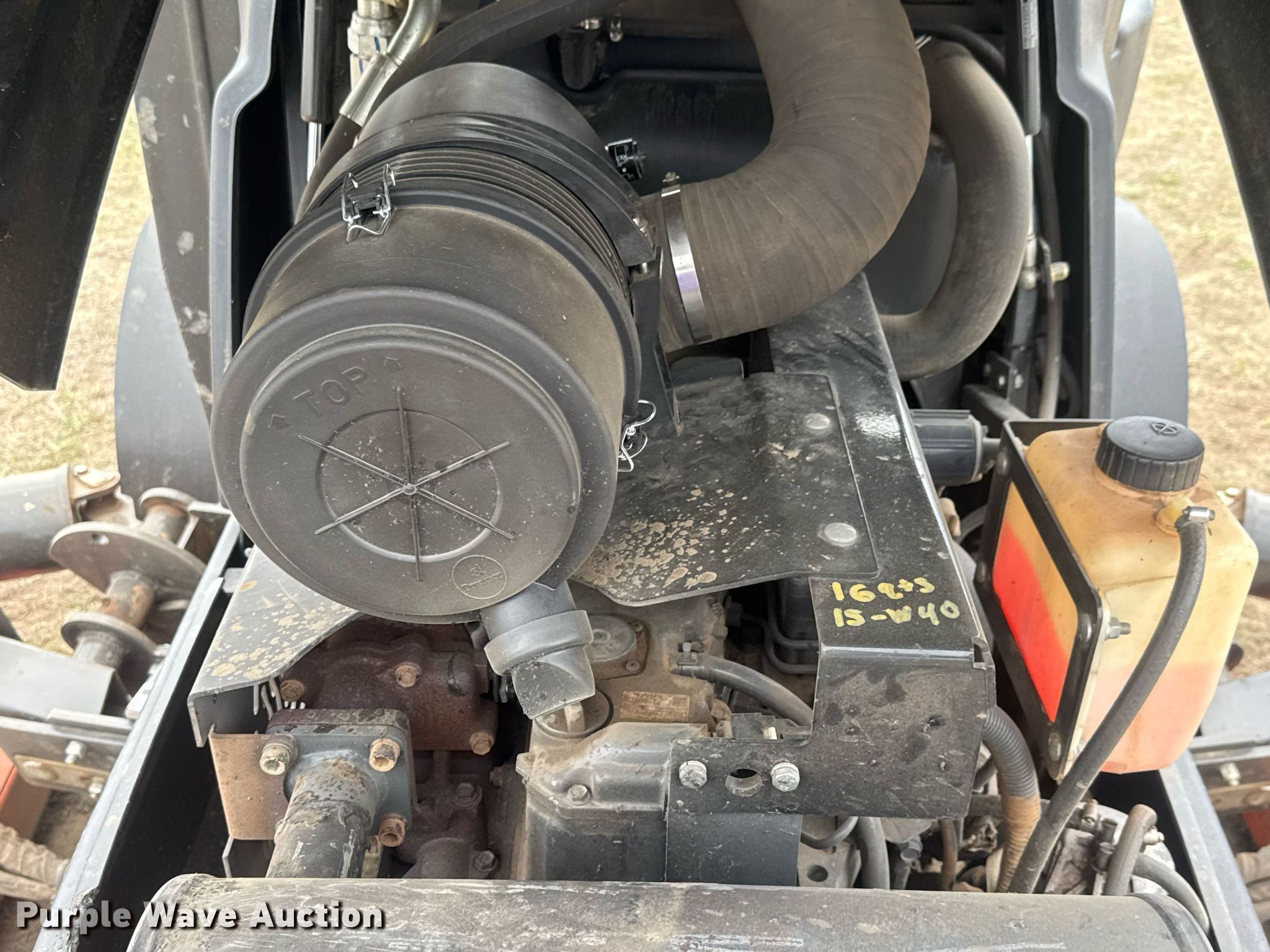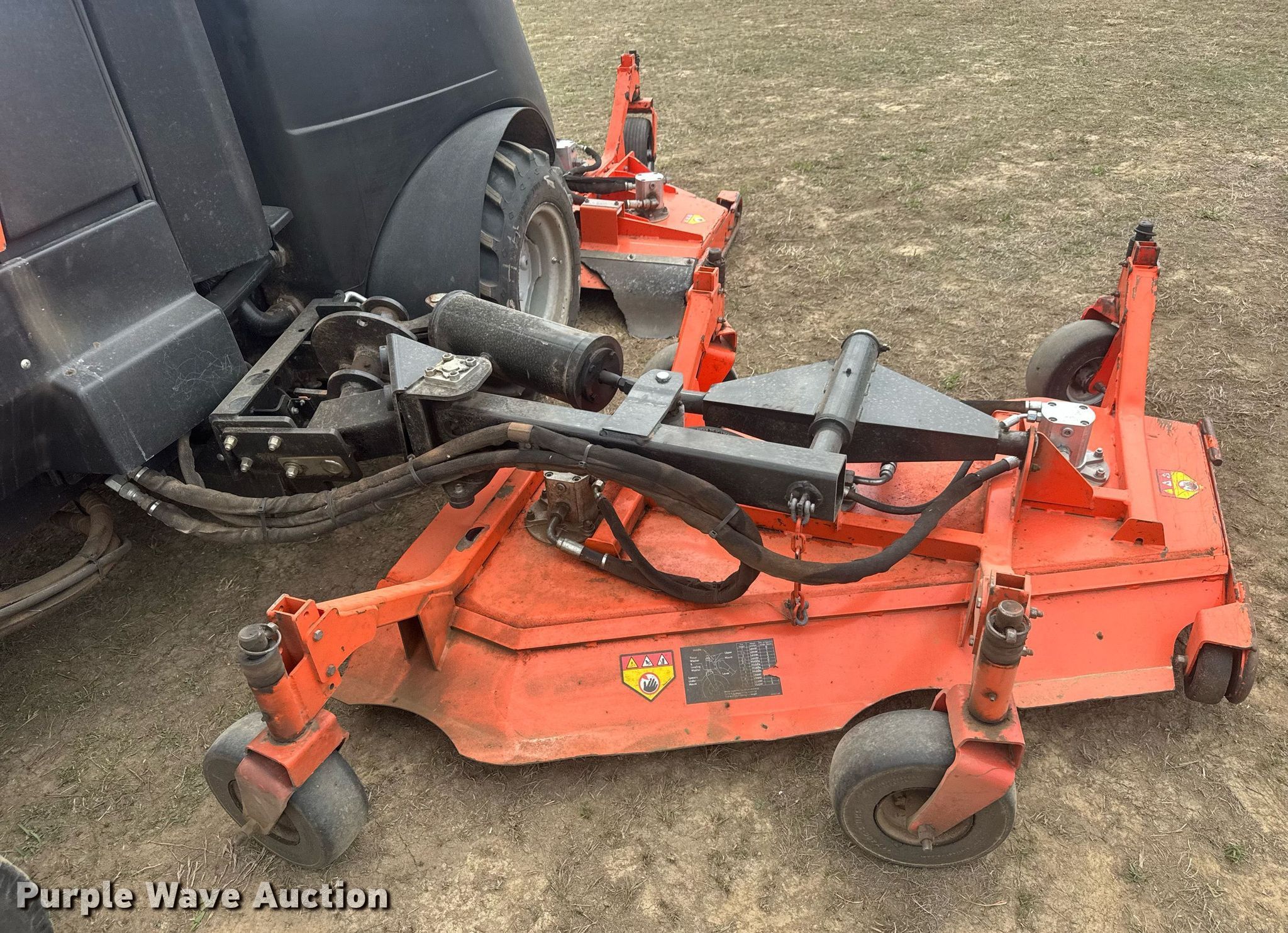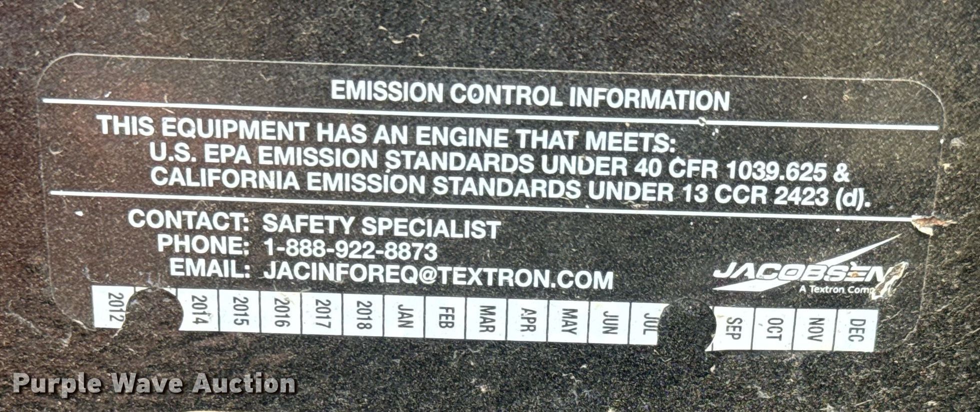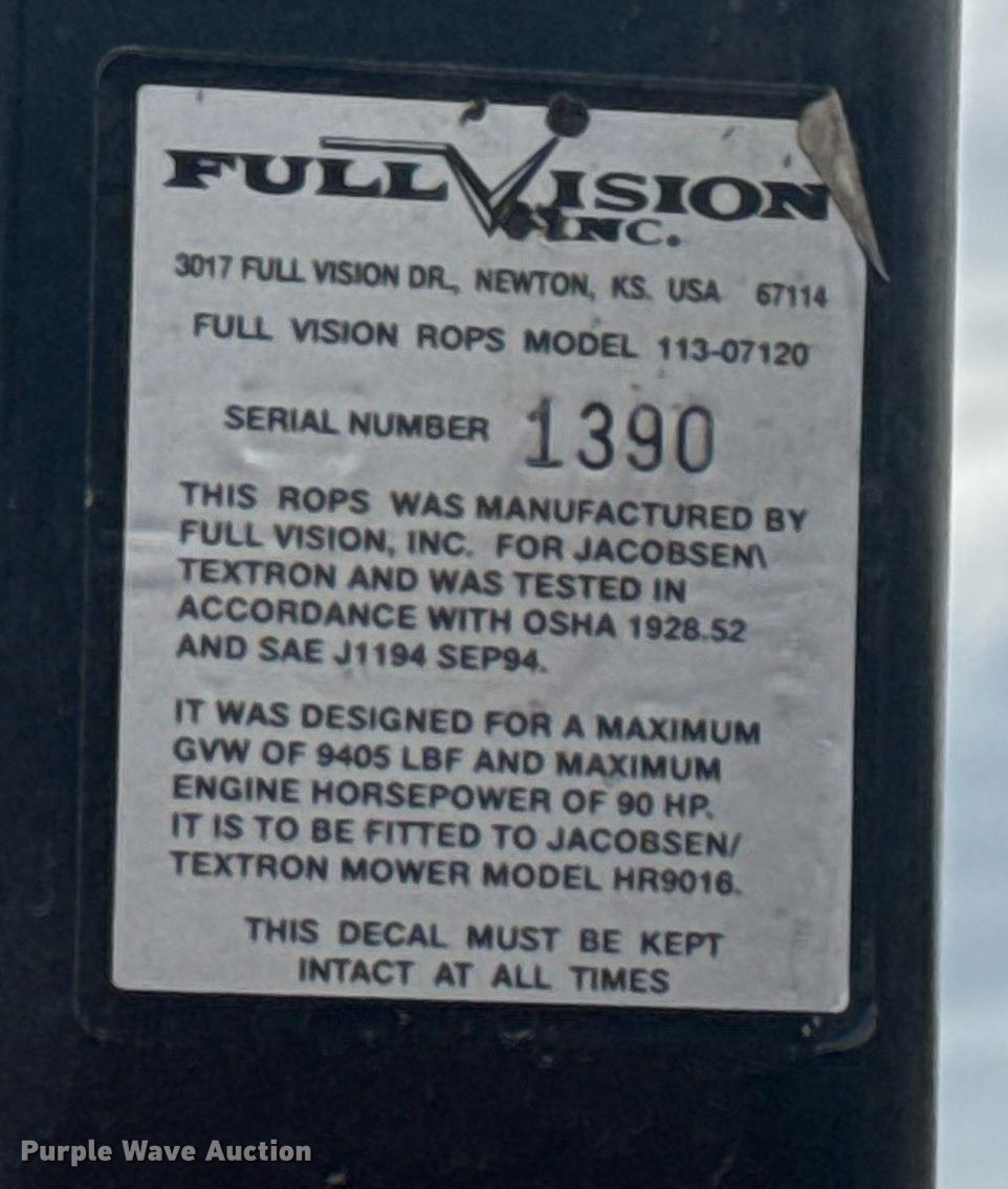 Jacobson HR9016 lawn mower. Hours: 2,143 on meter, Cutting width: 192", Serial: 7053901739. Engine Kubota V3800-T, Serial: 2DE3951, Displacement: 3.8L, Cylinders: 4, Fuel type: Diesel. Transmission Hydrostatic. Chassis Four wheel drive. Operators station OROPS. Features Hydraulic fold decks, Hydraulic front deck lift. Tires Front: 29x12.50-15, Rear: 24x12.00-12. Notes Left mower deck tire and wheel missing. Ramona, OK 74061
