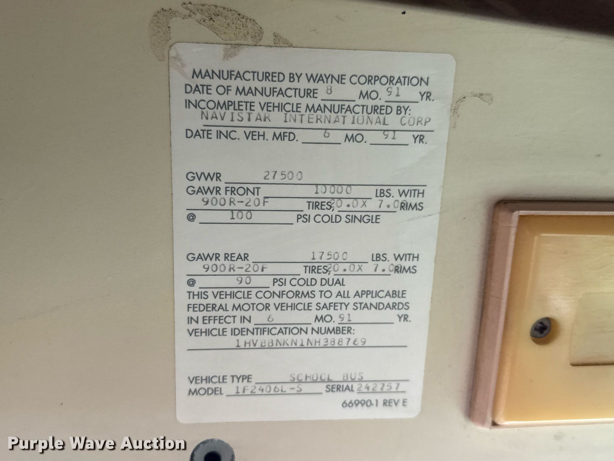 1992 International 3800 school bus. Miles: 165,930 on odometer, VIN: 1HVBBNKN1NH388769. Engine International, Displacement: 5.9L, Cylinders: 6, Fuel type: Diesel. Transmission Automatic. Chassis Axles: Single, Suspension: Spring, Brakes: Air, GVWR: 27,500 lbs, Wheelbase: 218". Interior Heat, Auxiliary controls, Passengers: 33. Tires Size: 9.00R20. Notes Glass cracked. Kansas title. Title distribution may be delayed up to 14 days from verification of funds. Hutchinson, KS 67501