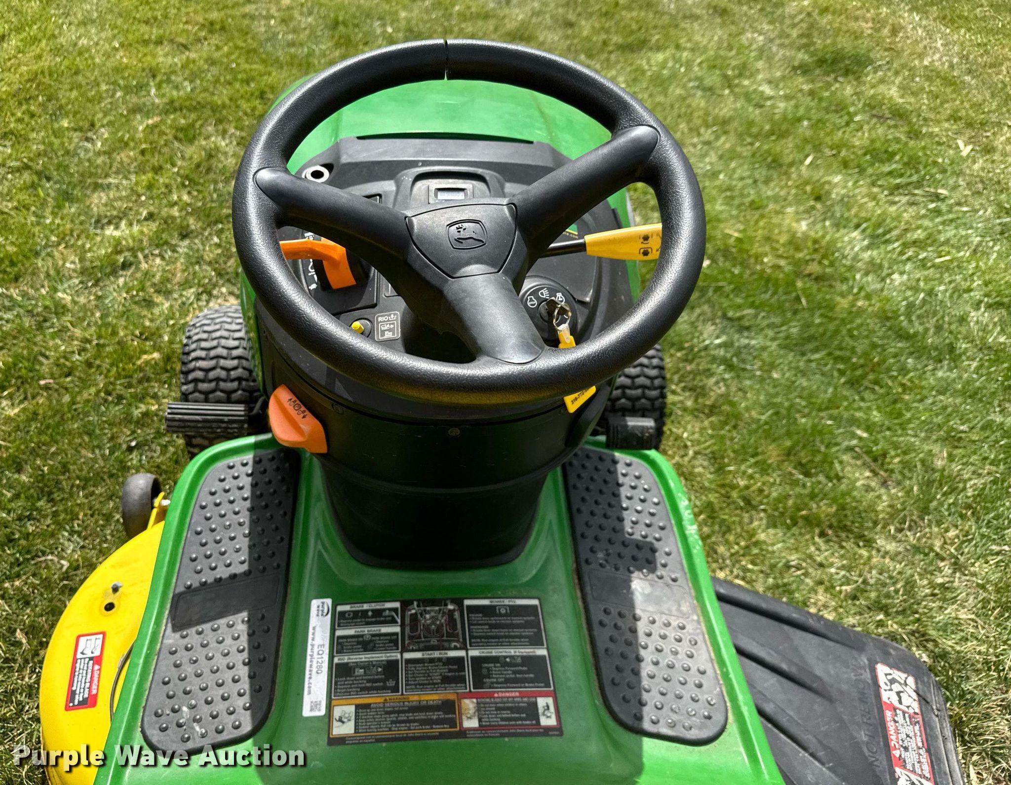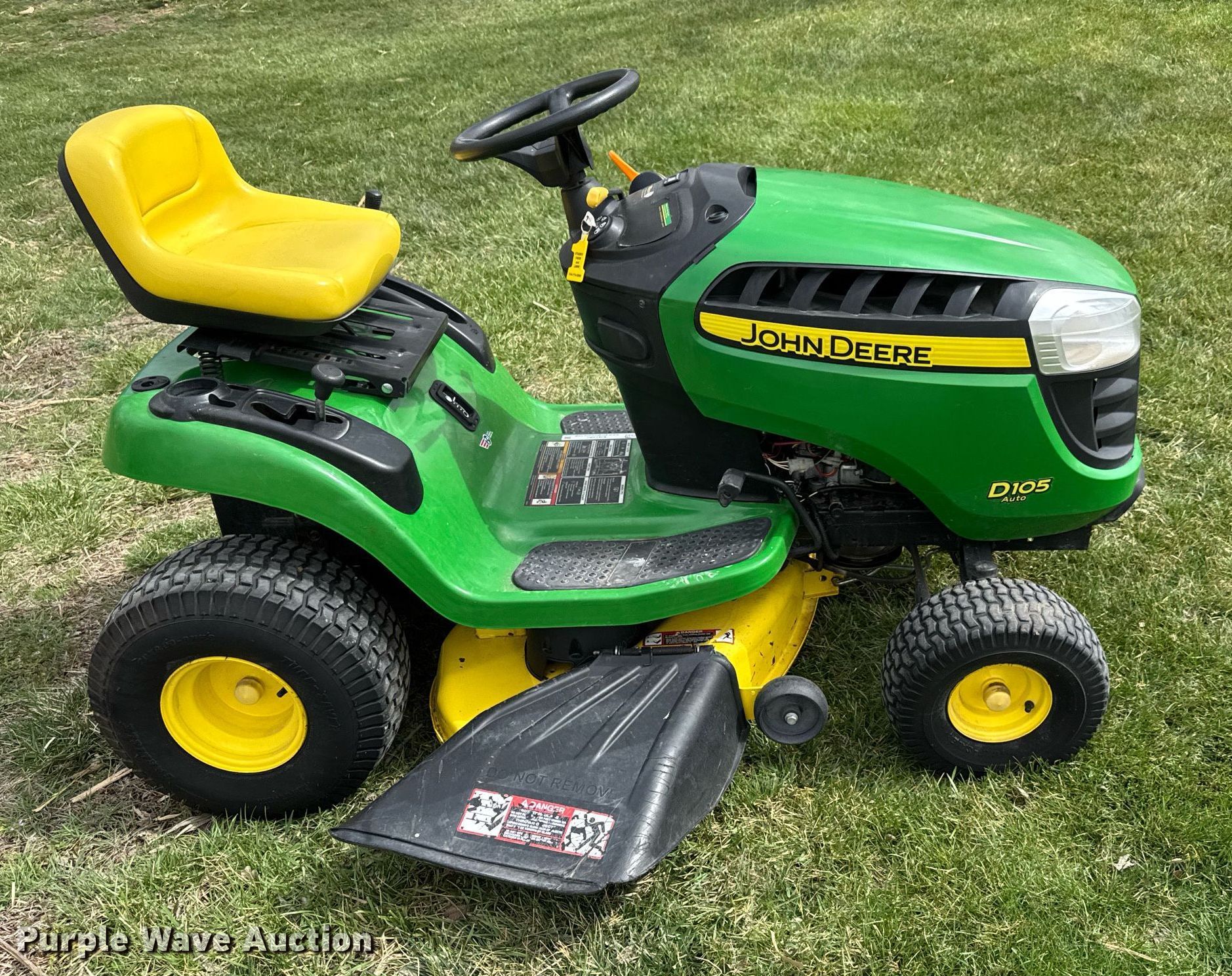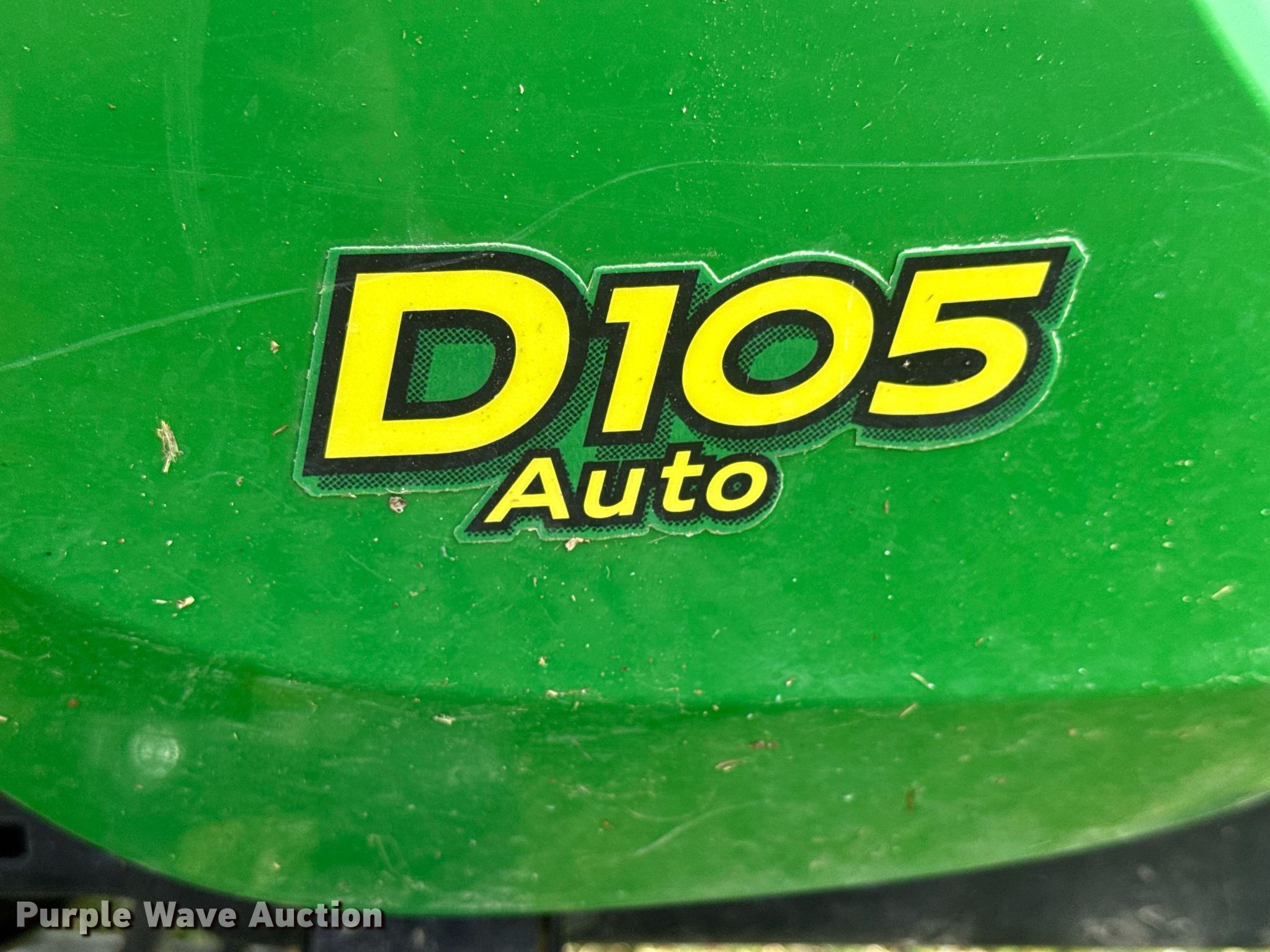 Purple Wave is selling a used Lawn Mower in Kansas. This item is a 2017 John Deere D105 Auto lawn mower with the following: Hours: 299 on meter, Cutting width: 42", Serial: 1GXD105ELHH834143