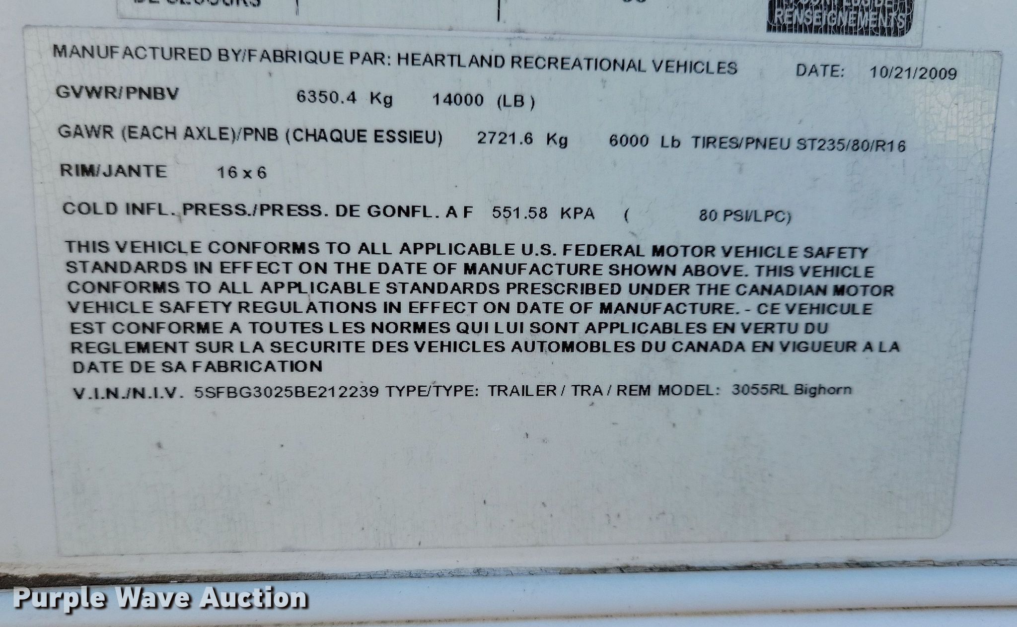 2011 Heartland Big Horn camper. Camper length: 34' 6", VIN: 5SFBG3025BE212239. Chassis Axles: Tandem, Suspension: Spring, Brakes: Electric, GVWR: 14,000 lbs, GAWR: 6,000 lbs. Interior Kitchen: Sink, Refrigerator, Freezer, Microwave, Oven, Stove: Propane, Living room: Table, Couch, Bathroom, Beds: 1 Bed type: King, TVs: 1, Heater, AC units: 2. Features Slide outs: 3, Awnings: 1 Awning type: Electric. Tires Size: ST235/80R16. Notes Non-operational landing gear, Soft floor, Dead battery, Skid steer not included. South Dakota title. Seller is a South Dakota licensed motor vehicle dealer. The buyer may be required to pay sales tax and/or registration fees to the dealer prior to taking possession. Title will be assigned and distributed by the dealer. Please contact the seller for distribution questions. Title distribution may be delayed up to 14 days from verification of funds. Noteboom RV. Harrisburg, SD 57032