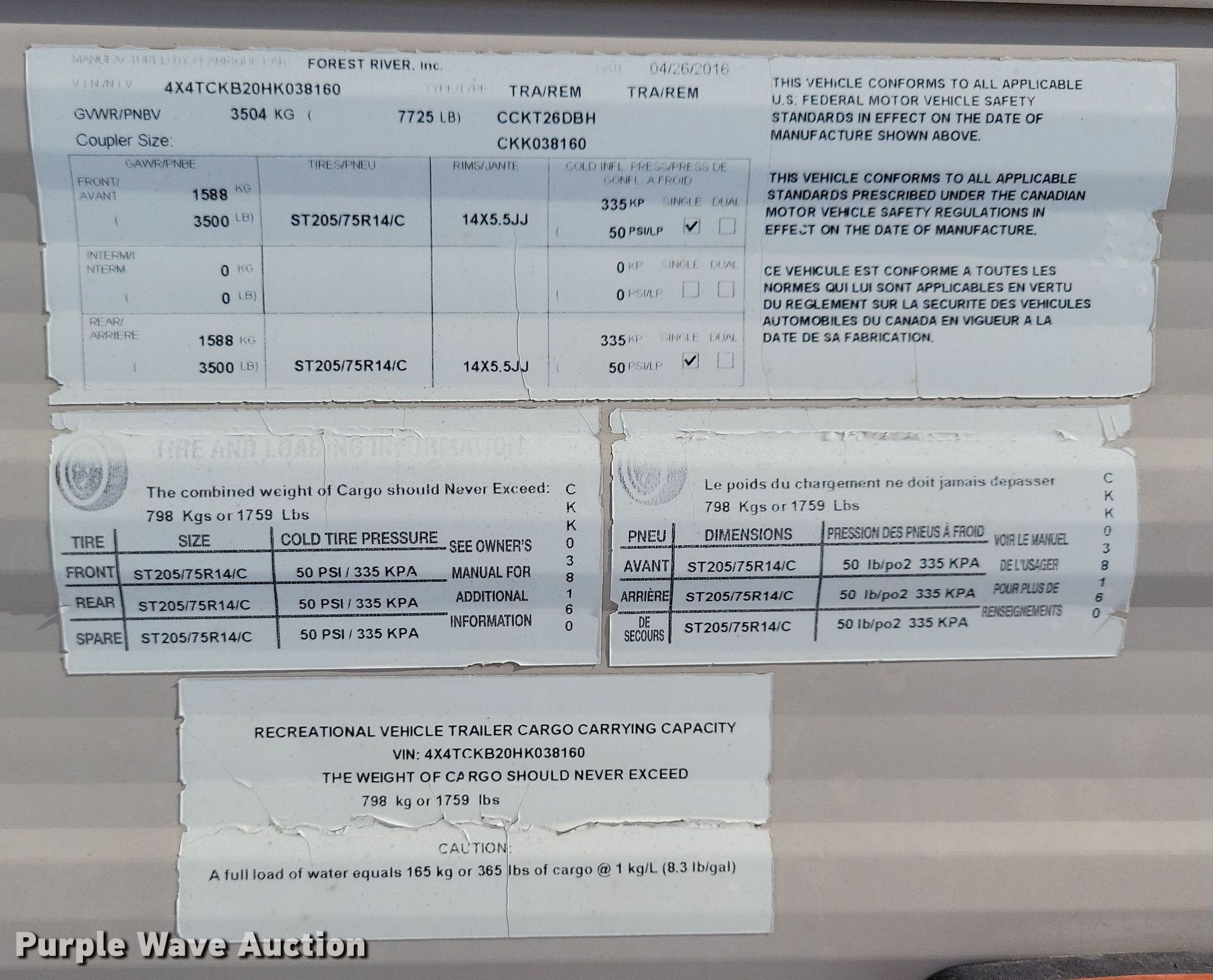 2017 Forest River Patriot camper. Camper length: 28', VIN: 4X4TCKB20HK038160, Unit #: C84-24. Chassis Axles: Tandem, Suspension: Spring, Brakes: Electric, GVWR: 7,725 lbs, GAWR: 3,500 lbs. Interior Kitchen: Sink, Refrigerator, Freezer, Microwave, Oven, Stove: Propane, Living room: Table, Couch, Bathroom, Beds: 3 Bed type: Queen, Double, TVs: 1, Heater, AC units: 1. Features Slide outs: 1, Awnings: 1 Awning type: Electric. Tires Size: ST205/7575R14. Notes Battery missing, Window damaged. South Dakota title. Title distribution may be delayed up to 14 days from verification of funds. PleasureLand RV - Sioux Falls. Sioux Falls, SD 57107