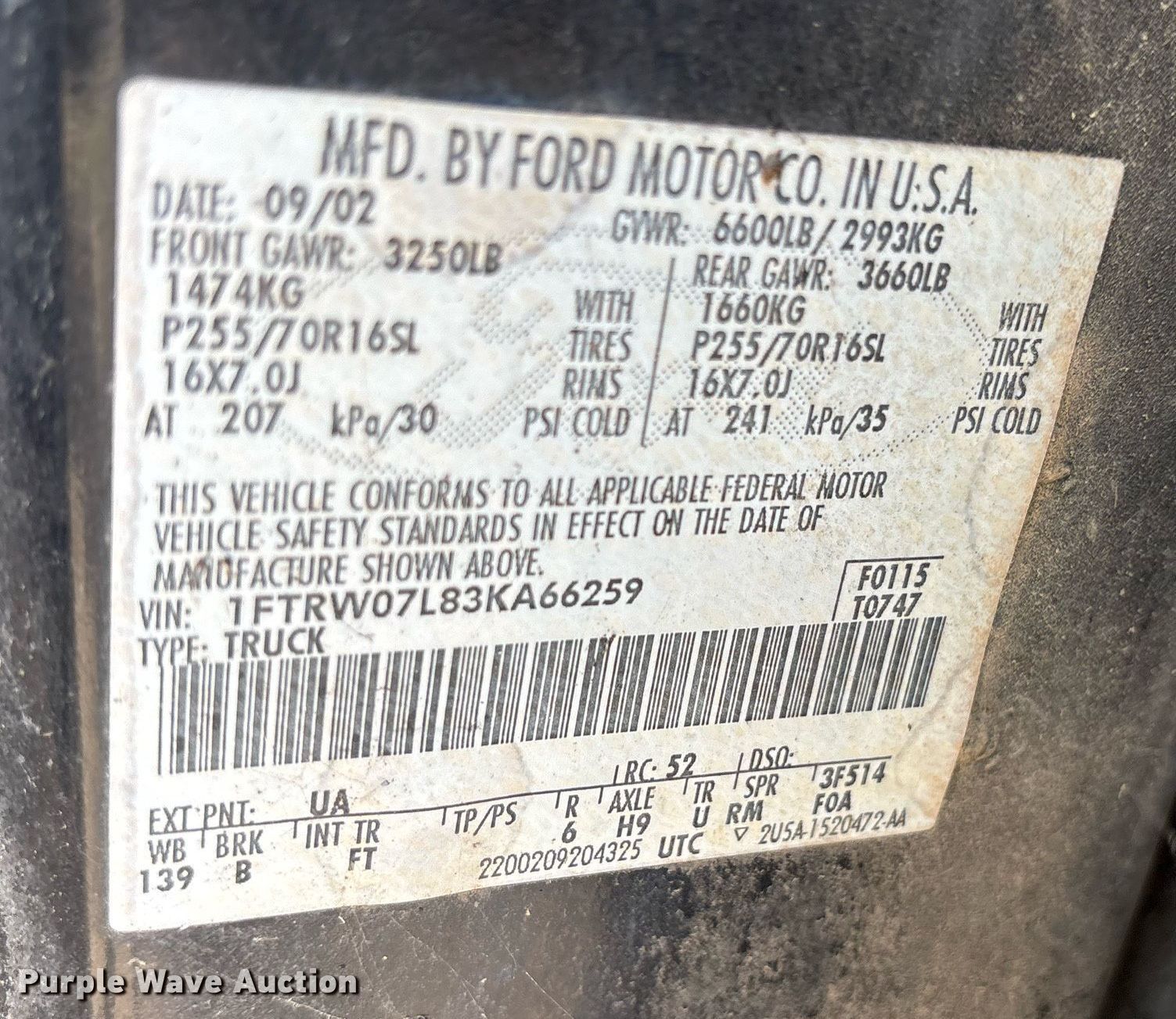 2003 Ford F150 Super Crew pickup truck. Miles: 194,224 on odometer, VIN: 1FTRW07L83KA66259. Engine Displacement: 5.4L V8 SOHC, Cylinders: 8, Fuel type: Gas. Transmission Automatic. Interior AC, Heat, Power windows, Power locks, Cruise control. Tires Size: 285/75R16. Notes Dead battery, Non-operational unit. Lender owned. Item condition and history are unknown. Oklahoma title. Title distribution may be delayed up to 14 days from verification of funds. FirstBank. Antlers, OK 74523