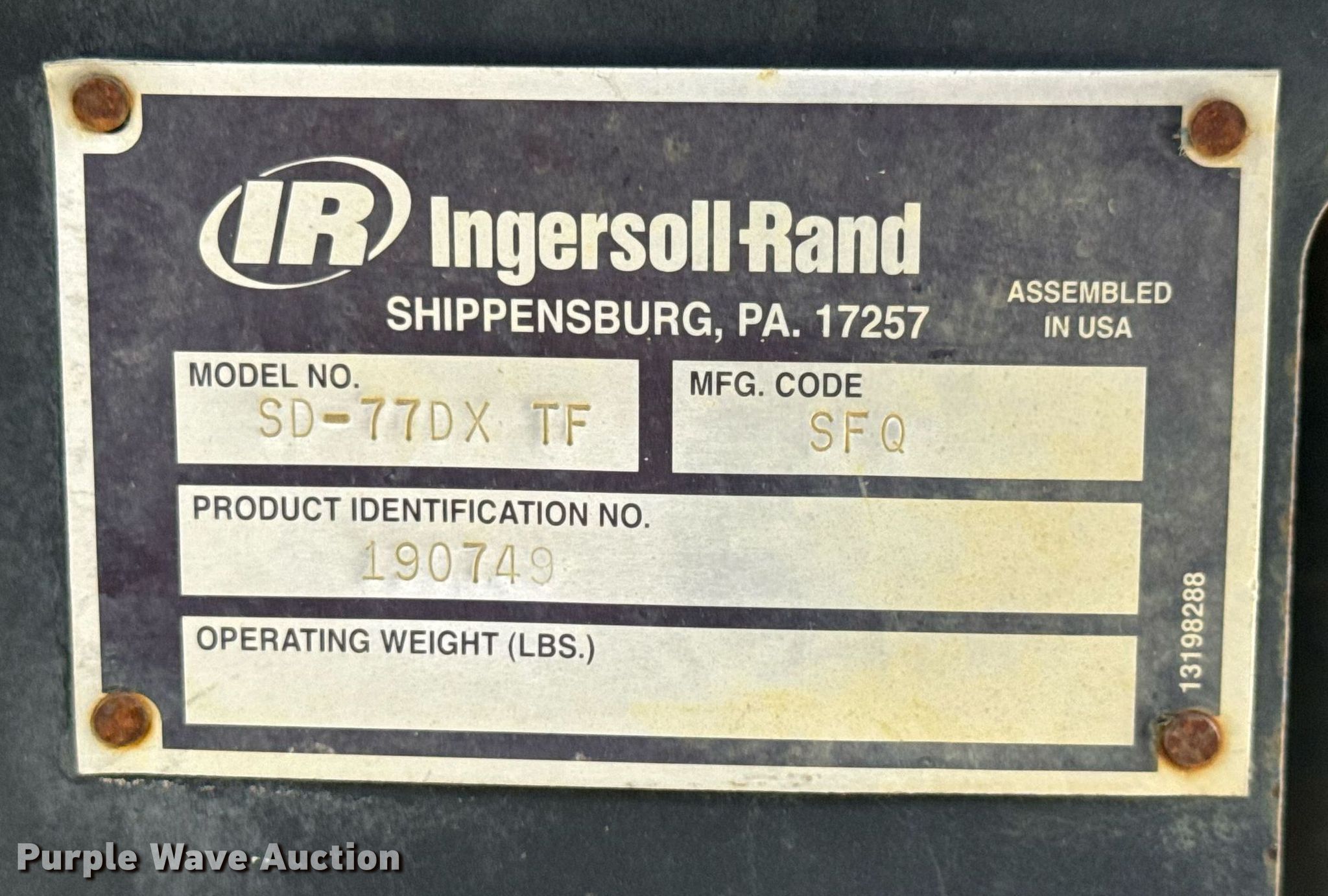 Purple Wave is selling a used Single Drum Roller Compactor in Oklahoma. This item is a 2006 Ingersoll Rand SD-77DX TF single drum vibratory roller with the following: Hours: 3,078 on meter, Serial: 190749, Unit #: D9