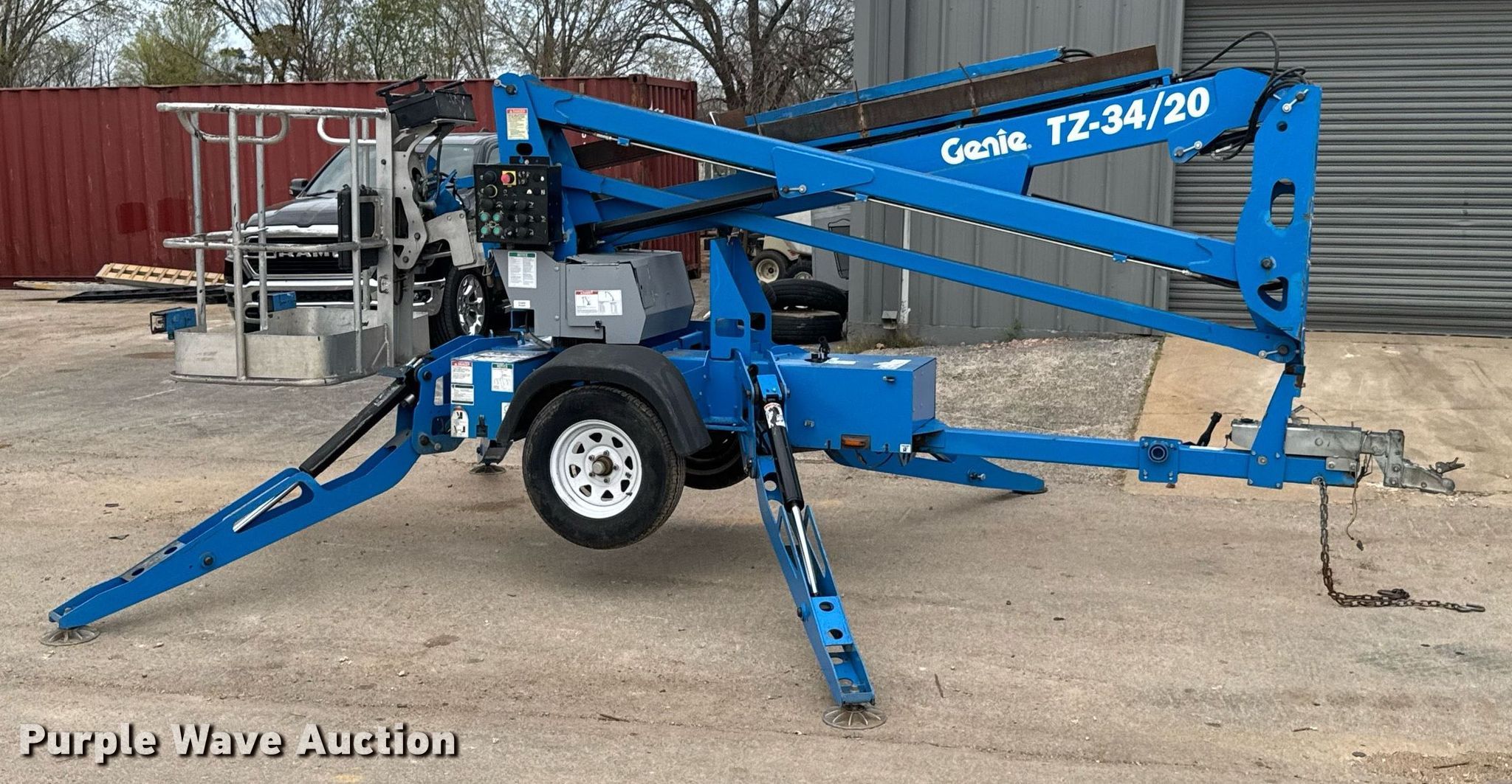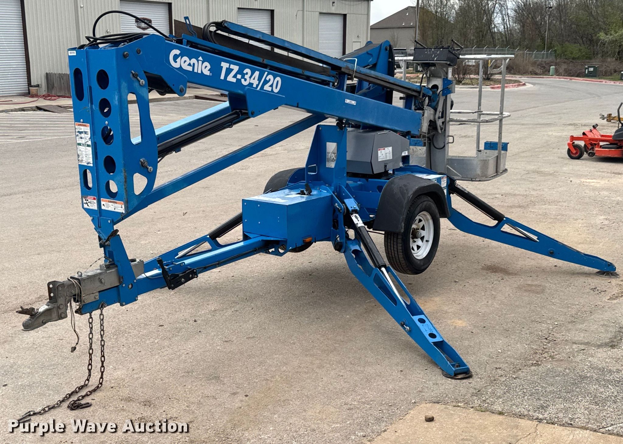 2019 Genie TZ-34/20 boom lift. Hours: 175 on meter, Serial: TZ34J-4022. Electric Motor HP: 1, kW: 1, Volts: 24. Features Tow behind, Boom type: Articulating, Maximum lift capacity: 500 lbs, Maximum reach length: 18', Maximum lift height: 34', Hydraulic outriggers, Platform: 27" L x 45" W, AC power outlet, Controls: Platform, Ground. Tires Tire size: ST205/75R14. Notes Platform control issues, switchboard needs replaced Repairs to be completed prior to auction. Elite Property Services. Rogers, AR 72758