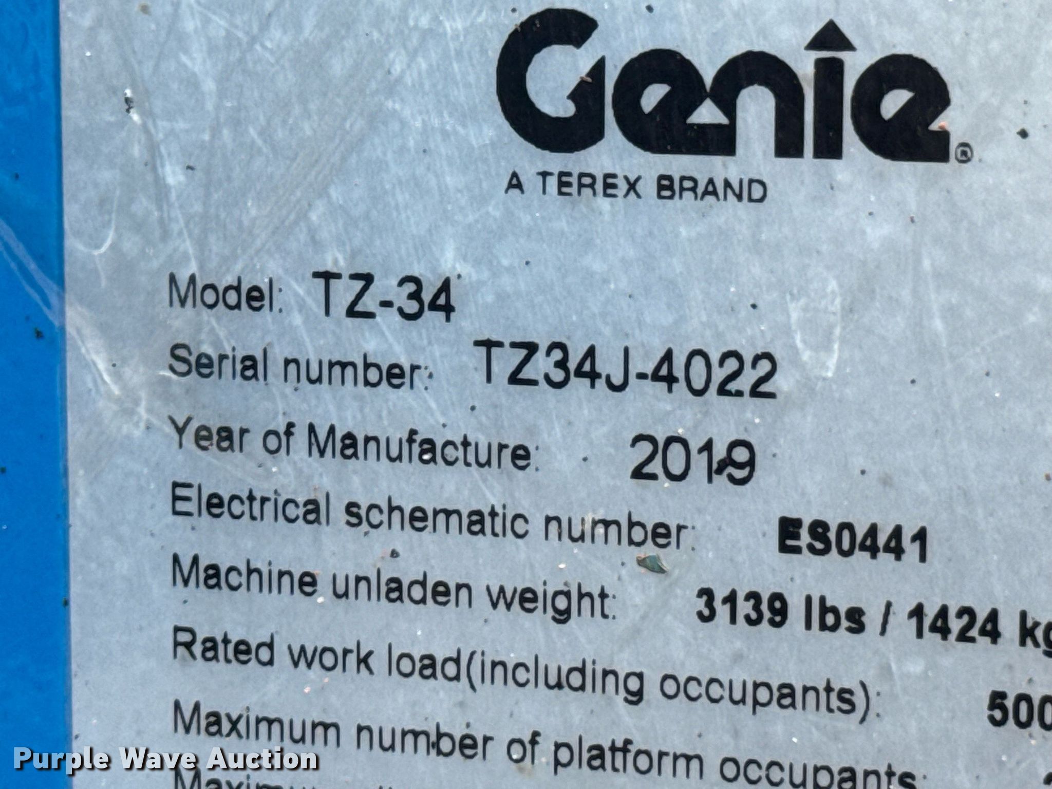 Purple Wave is selling a used Boom Lift in Arkansas. This item is a 2019 Genie TZ-34/20 boom lift with the following: Hours: 175 on meter, Serial: TZ34J-4022