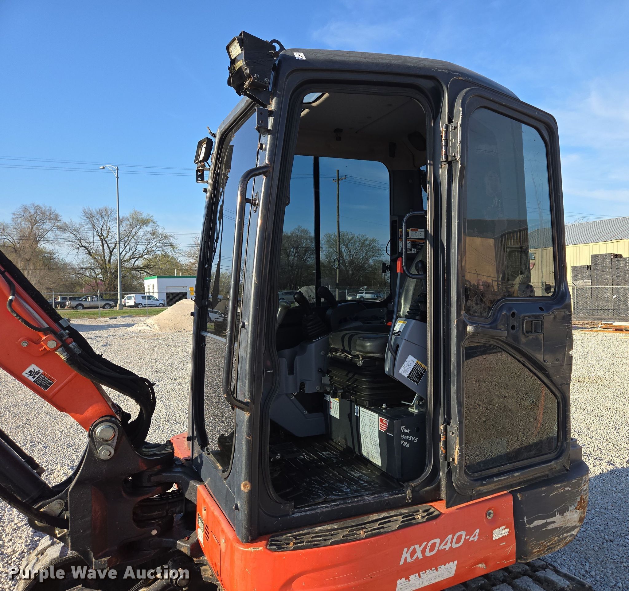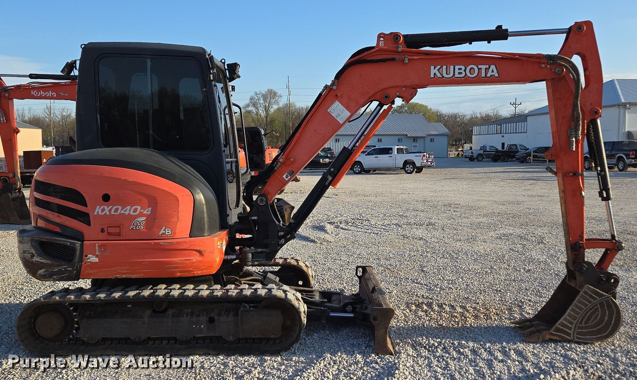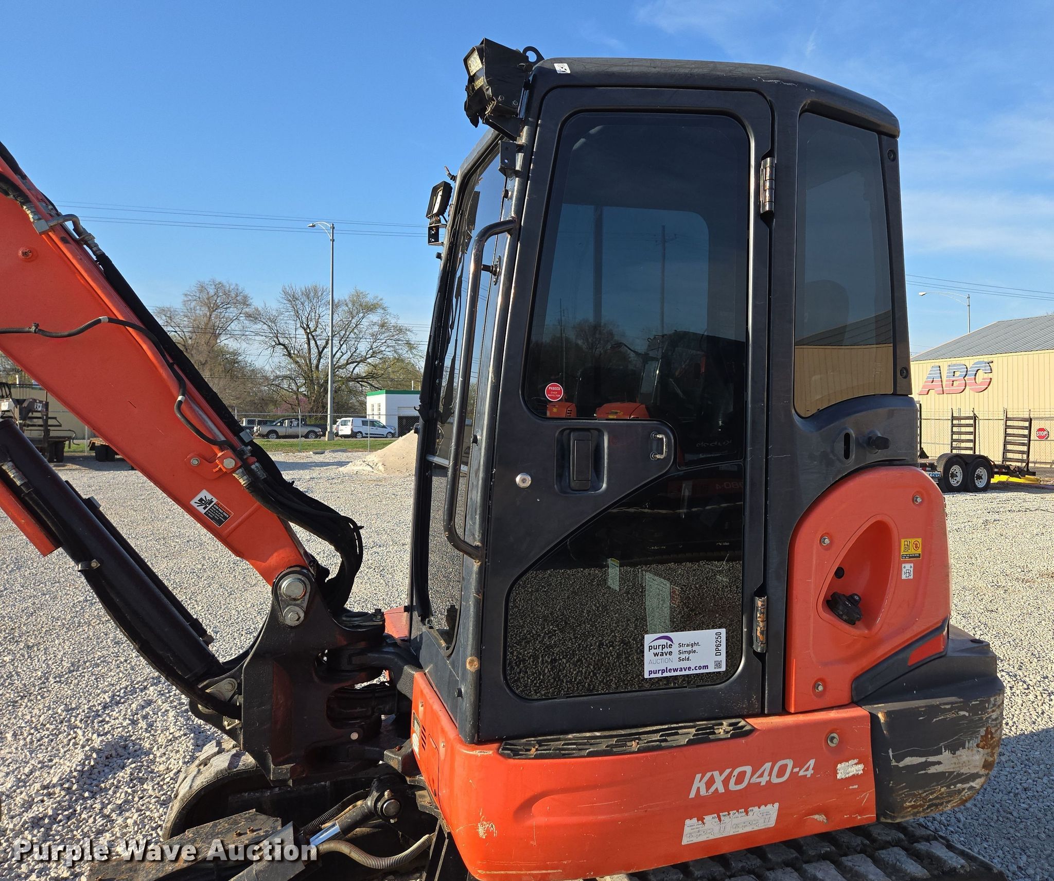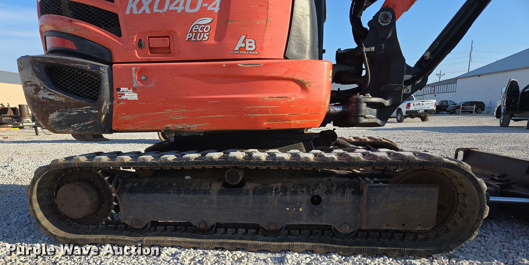 2015 Kubota KX040-4 mini excavator. Hours: 4,004 on meter, Serial: 23422. Engine Kubota D1803-CR-T-EF03, Serial: 7FH2045, Cylinders: 3, Fuel type: Diesel, kW: 29.7. Transmission Hydrostatic. Operators station Enclosed cab, AC, Heat, Pattern changer. Features Auxiliary hydraulics, Backfill blade Width: 67", Boom Swing, Stick Stick length: 5' 3", Quick coupler: Mechanical, Bucket Width: 18.5", Teeth: 4. Tracks Width: 14", Rubber. L&B Services LLC. Springfield, MO 65802
