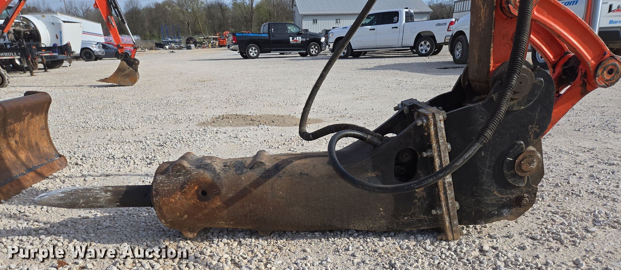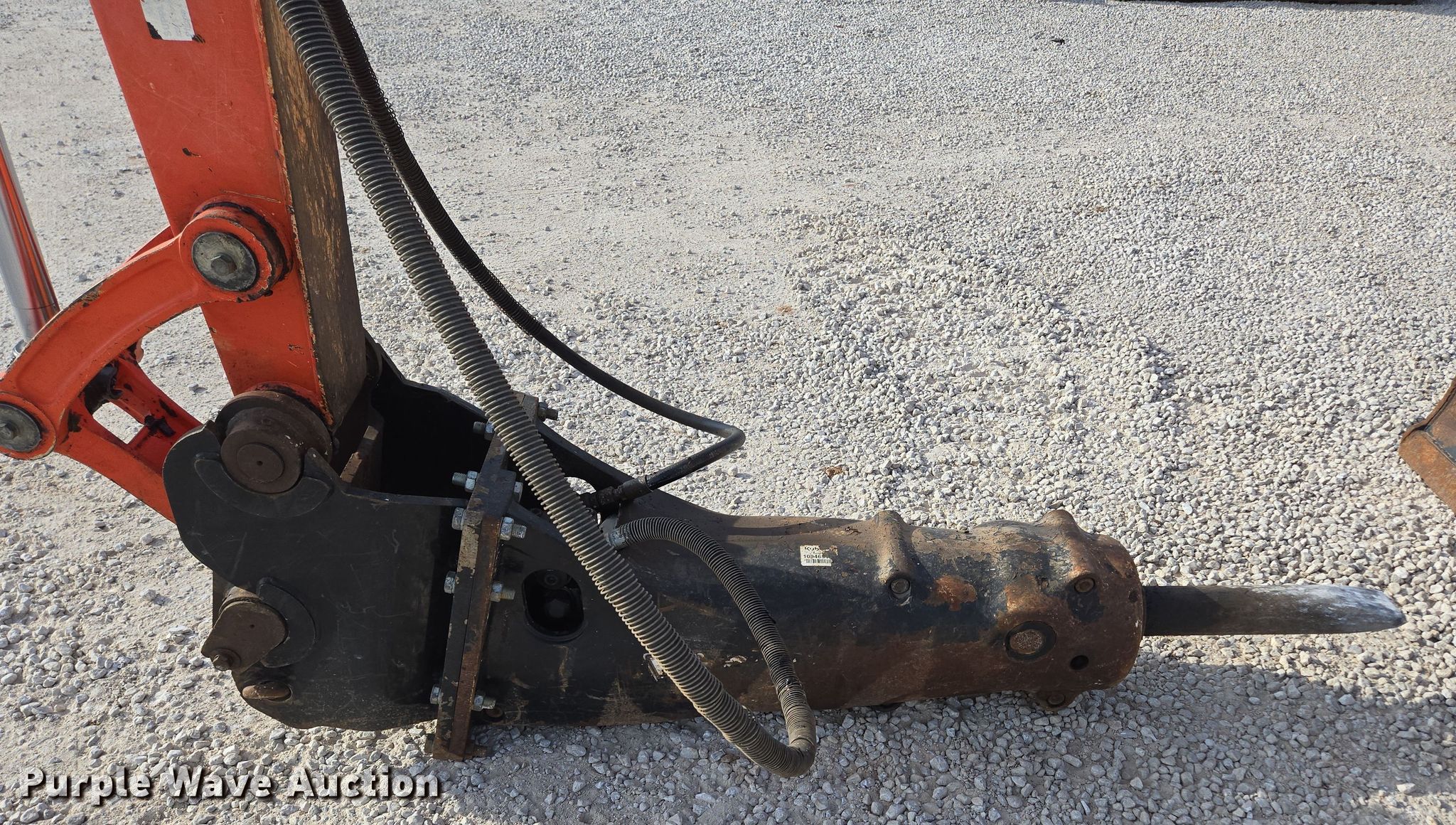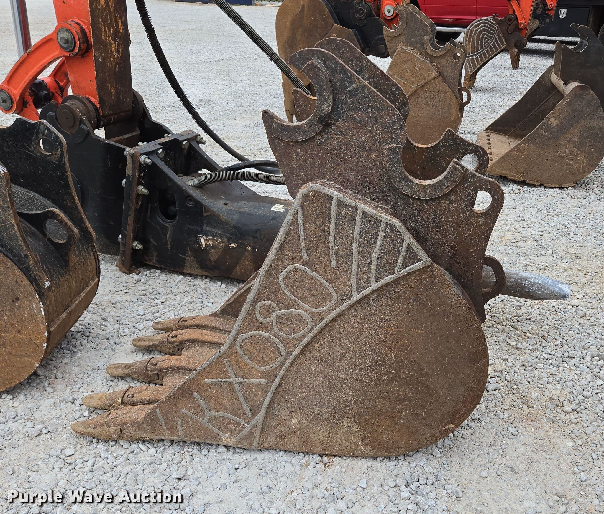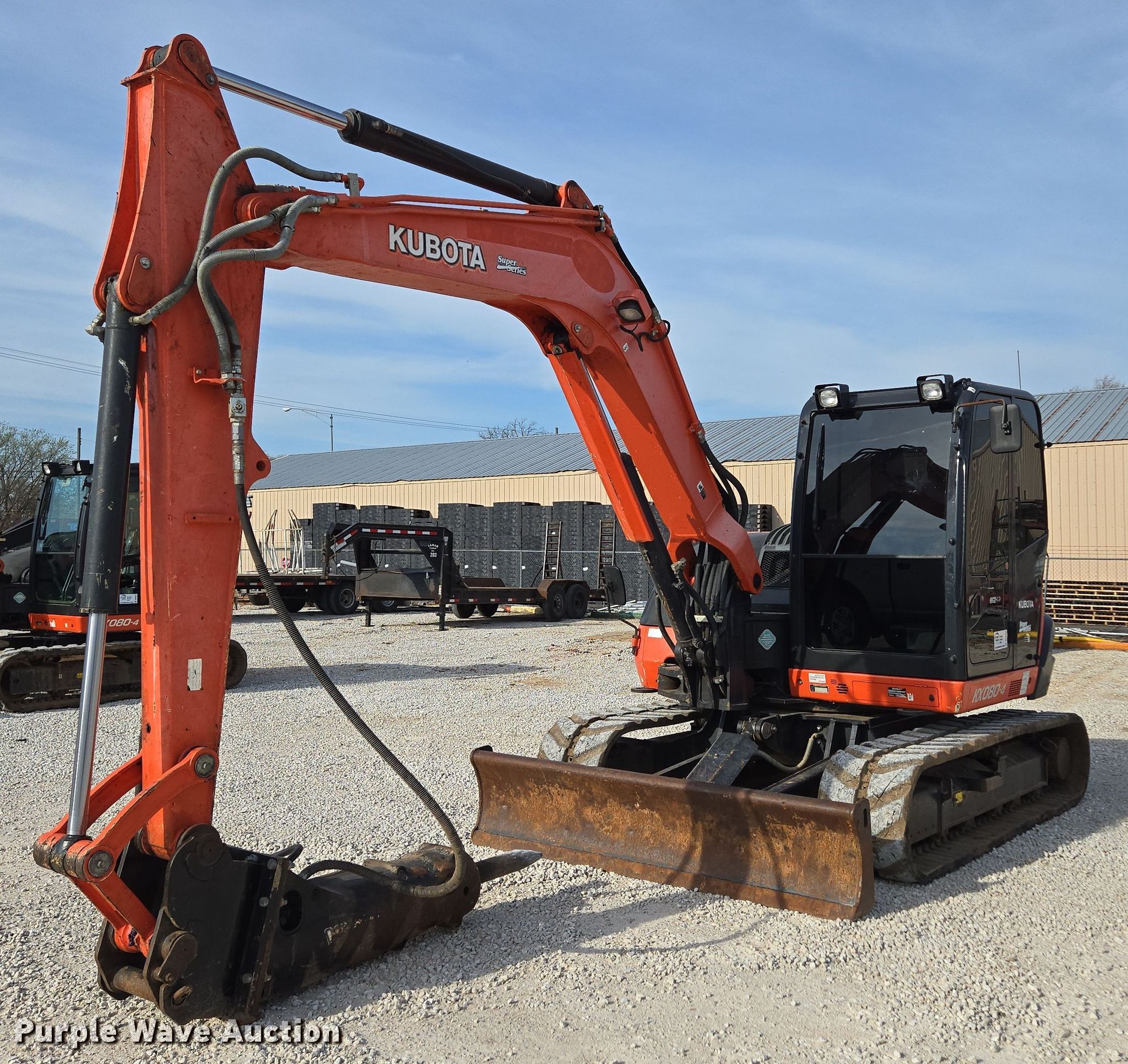2017 Kubota KX080-4 mini excavator. Hours: 3,173 on meter, Serial: 40799, Unit #: 319. Engine Kubota V3307-CR-T-EF06, Serial: 8GW1523, Displacement: 3.3L, Cylinders: 4, Fuel type: Diesel, kW: 49. Transmission Hydrostatic. Operators station Enclosed cab, AC, Heat, Pattern changer. Features Auxiliary hydraulics, Backfill blade Width: 86.5", Boom Swing, Stick Stick length: 6' 10.5", Quick coupler: Mechanical, Bucket Width: 19.5", Teeth: 4, Bucket Width: 23.5", Teeth: 5, Kubota hydraulic breaker. Tracks Width: 17.5", Rubber. Notes Engine hood latch issues. L&B Services LLC. Springfield, MO 65802
