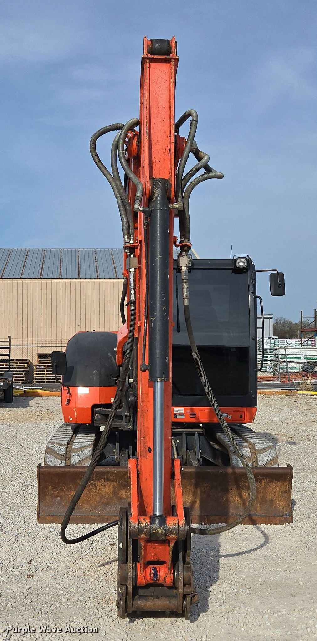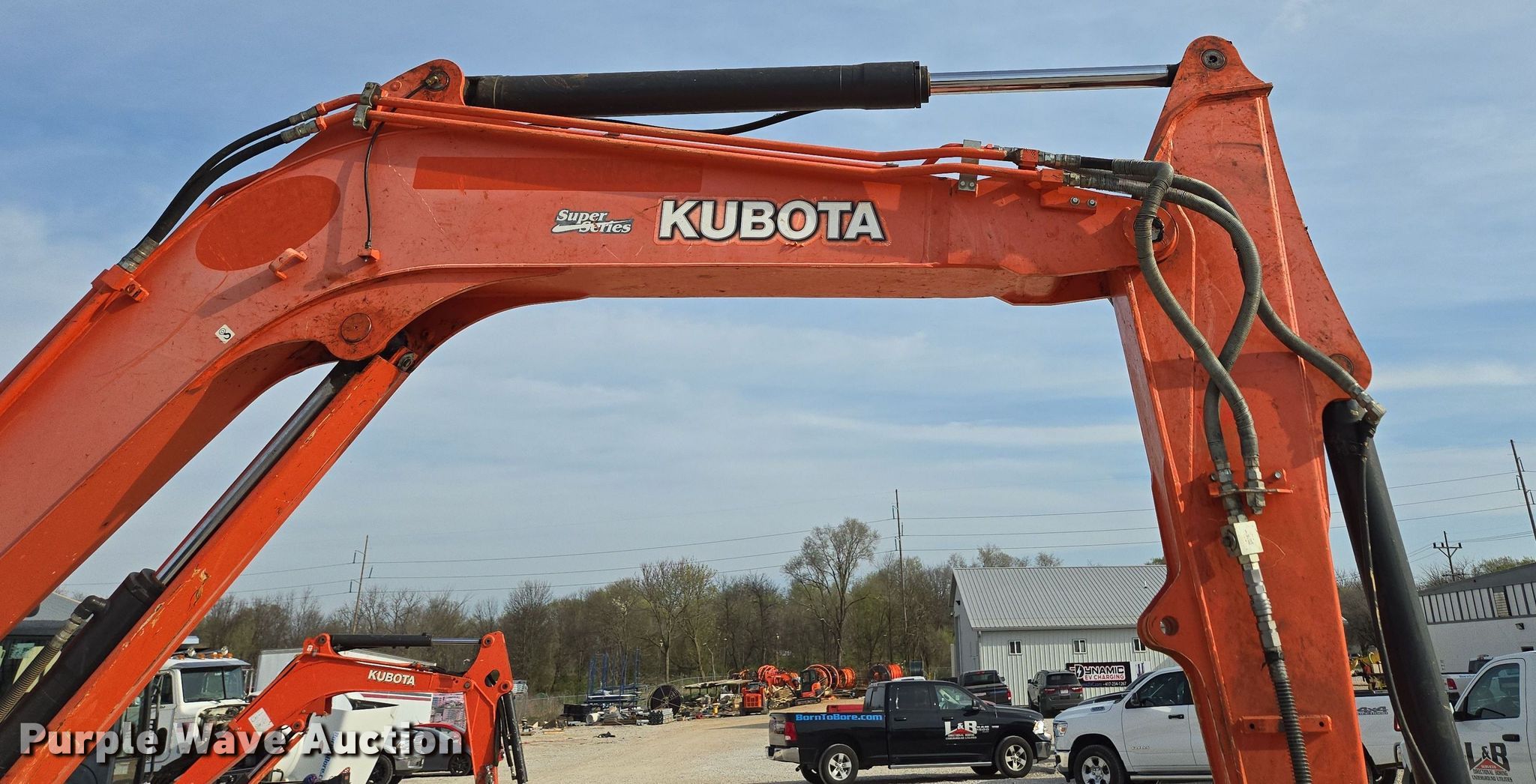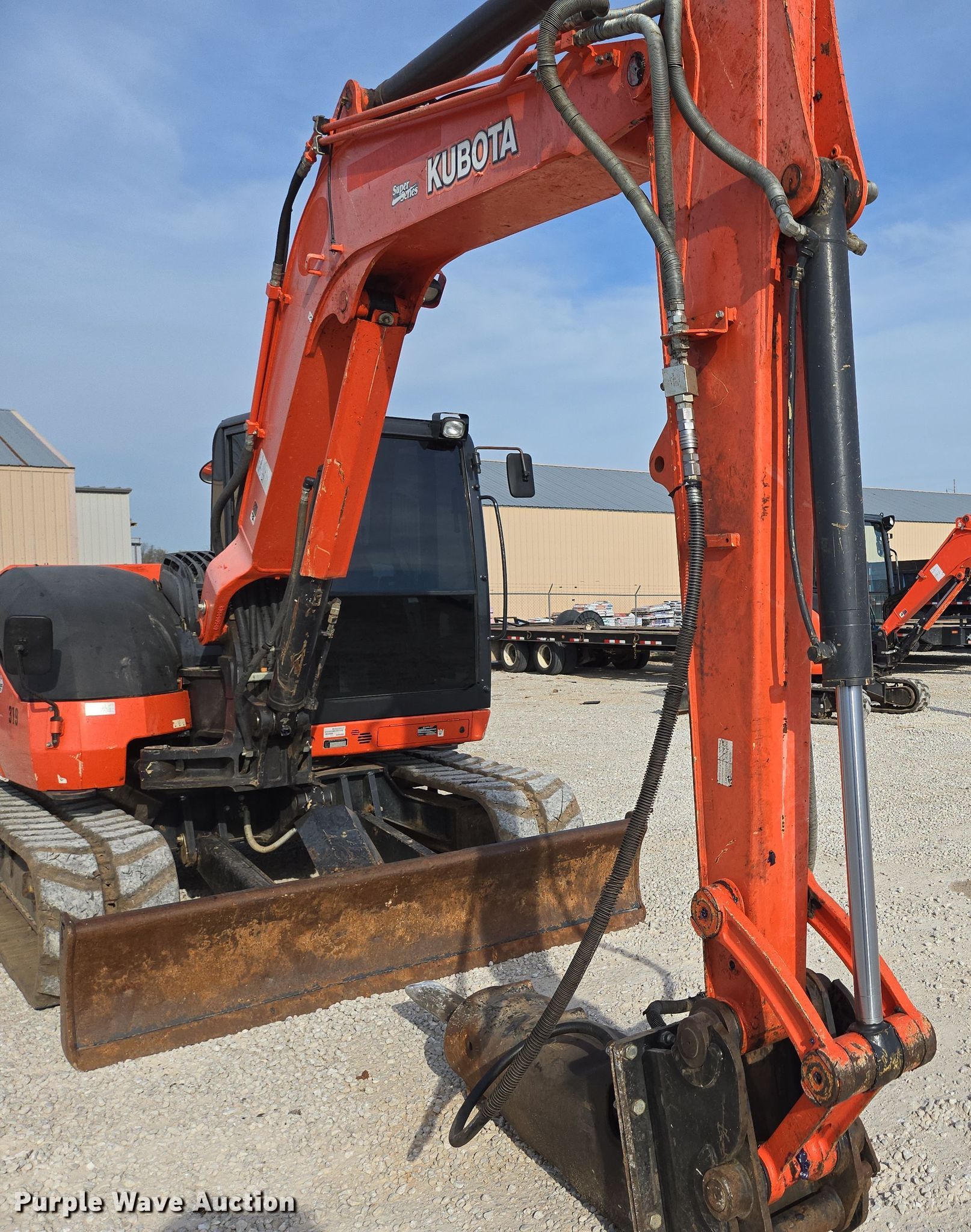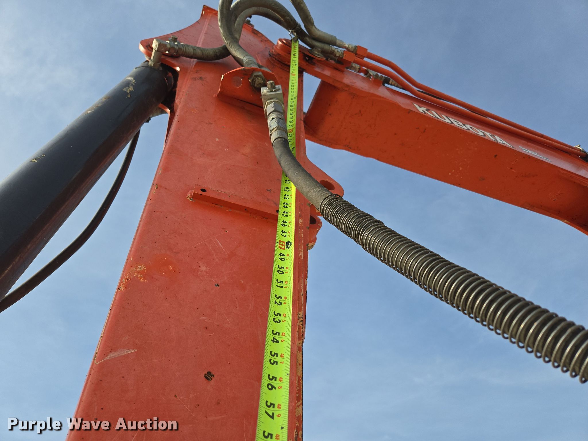 2017 Kubota KX080-4 mini excavator. Hours: 3,173 on meter, Serial: 40799, Unit #: 319. Engine Kubota V3307-CR-T-EF06, Serial: 8GW1523, Displacement: 3.3L, Cylinders: 4, Fuel type: Diesel, kW: 49. Transmission Hydrostatic. Operators station Enclosed cab, AC, Heat, Pattern changer. Features Auxiliary hydraulics, Backfill blade Width: 86.5", Boom Swing, Stick Stick length: 6' 10.5", Quick coupler: Mechanical, Bucket Width: 19.5", Teeth: 4, Bucket Width: 23.5", Teeth: 5, Kubota hydraulic breaker. Tracks Width: 17.5", Rubber. Notes Engine hood latch issues. L&B Services LLC. Springfield, MO 65802
