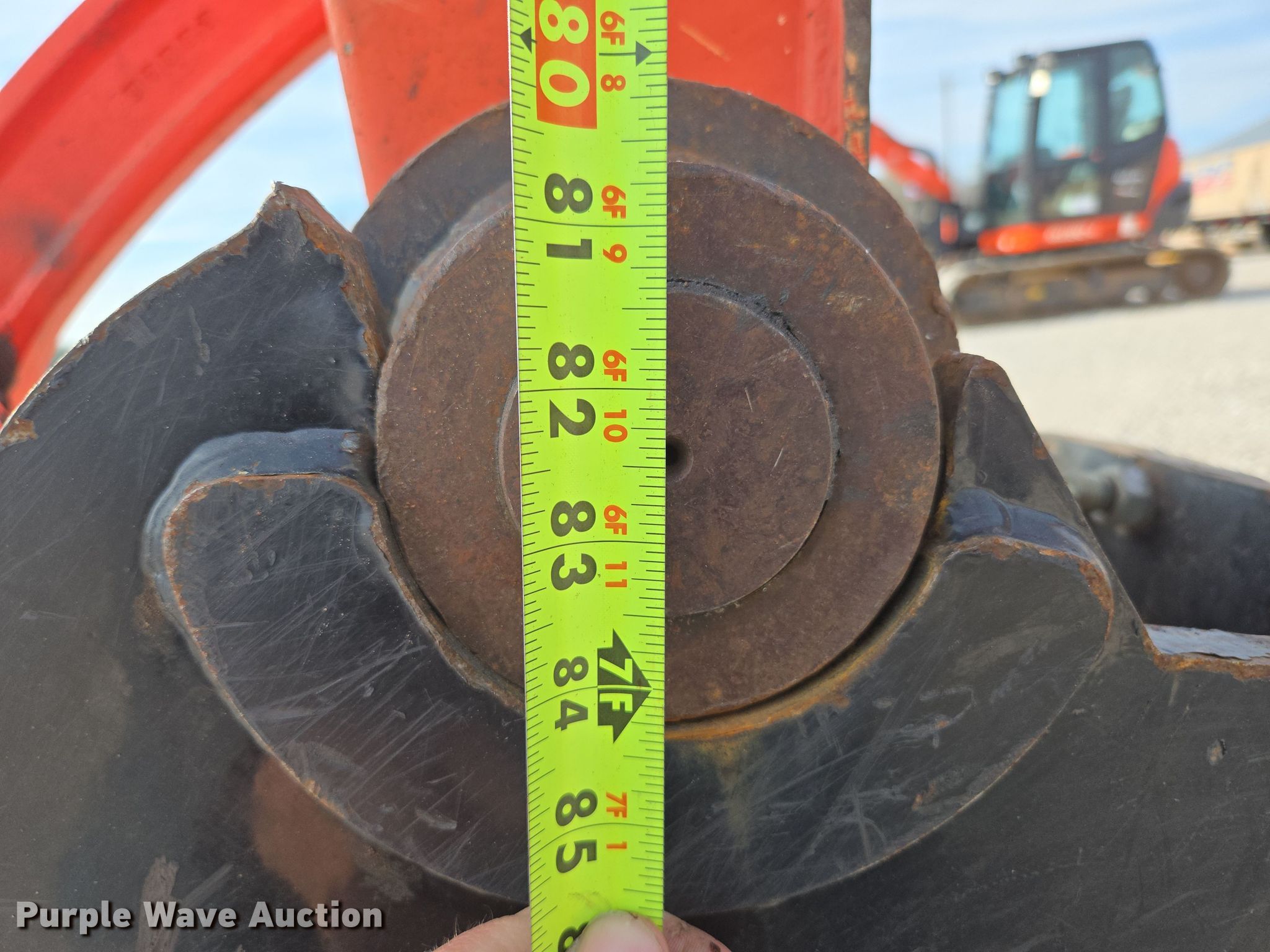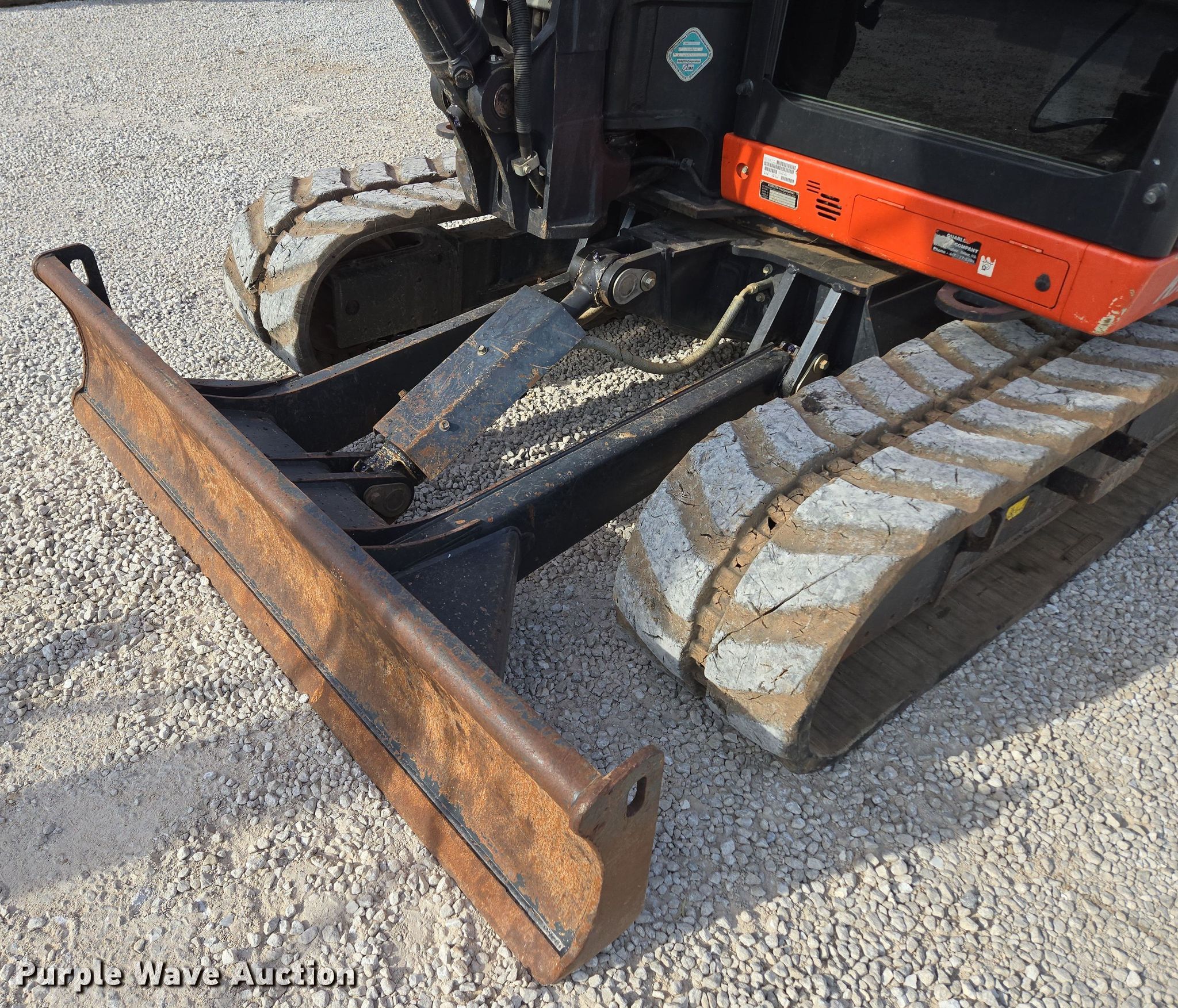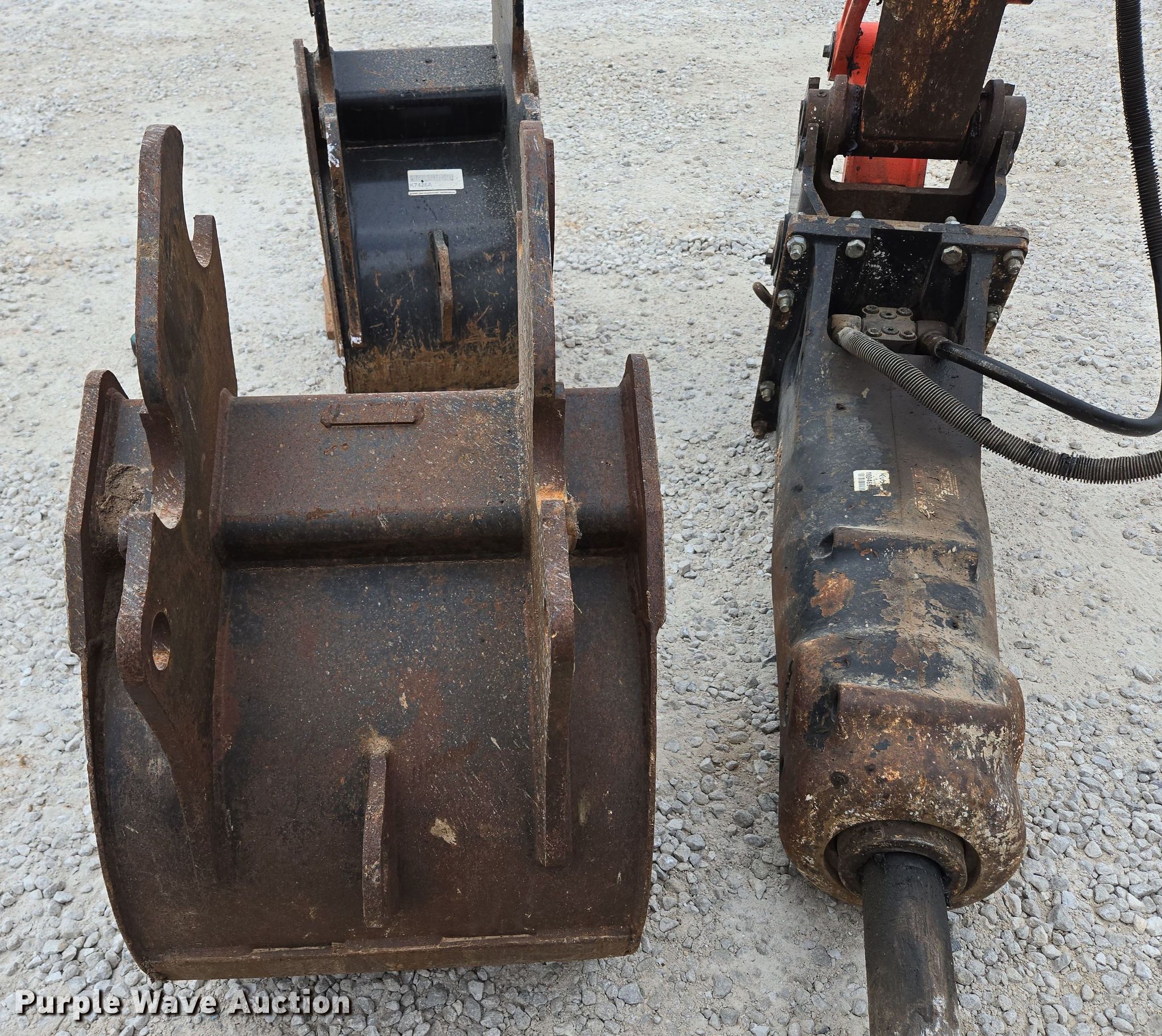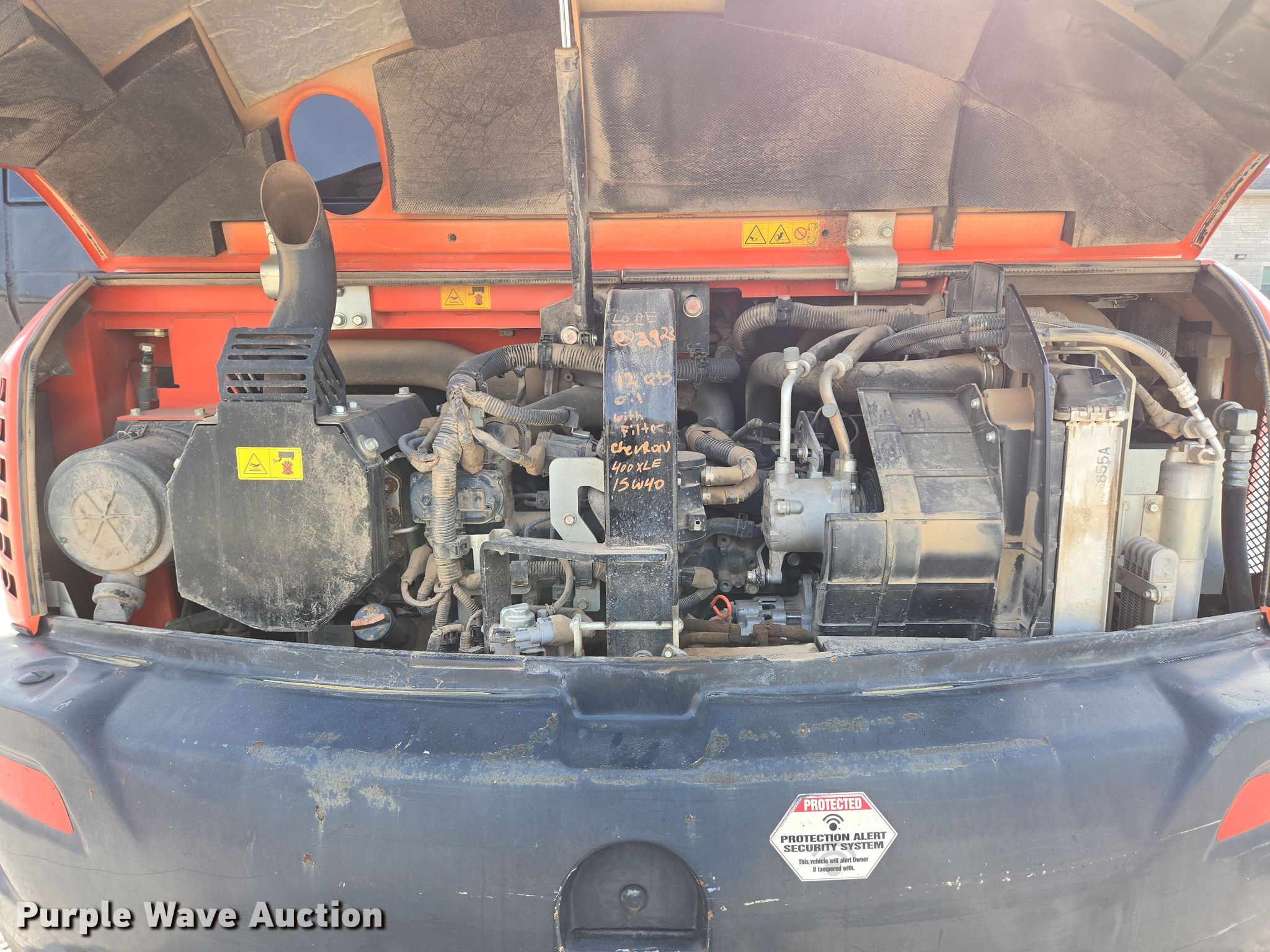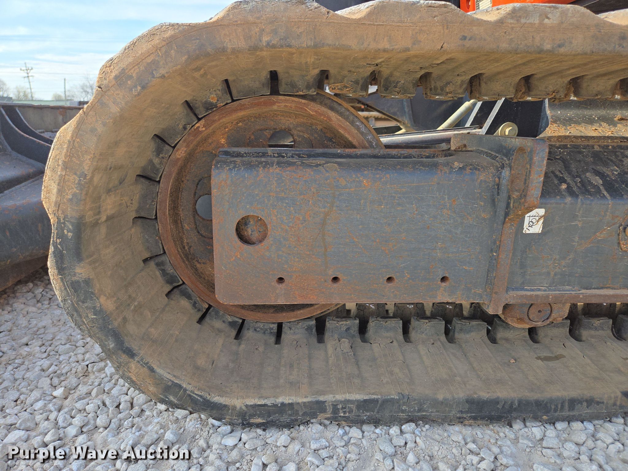 2017 Kubota KX080-4 mini excavator. Hours: 3,173 on meter, Serial: 40799, Unit #: 319. Engine Kubota V3307-CR-T-EF06, Serial: 8GW1523, Displacement: 3.3L, Cylinders: 4, Fuel type: Diesel, kW: 49. Transmission Hydrostatic. Operators station Enclosed cab, AC, Heat, Pattern changer. Features Auxiliary hydraulics, Backfill blade Width: 86.5", Boom Swing, Stick Stick length: 6' 10.5", Quick coupler: Mechanical, Bucket Width: 19.5", Teeth: 4, Bucket Width: 23.5", Teeth: 5, Kubota hydraulic breaker. Tracks Width: 17.5", Rubber. Notes Engine hood latch issues. L&B Services LLC. Springfield, MO 65802
