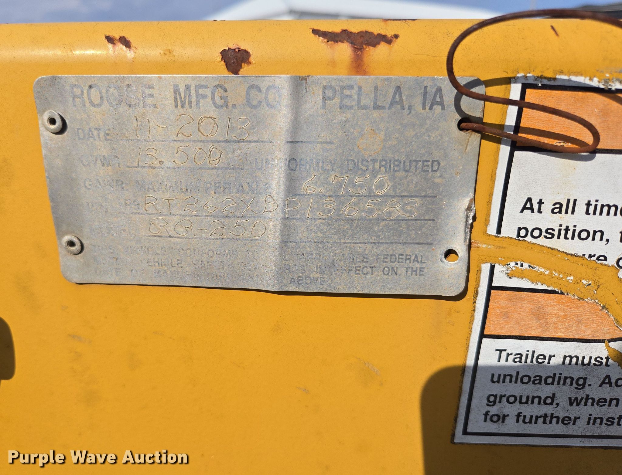 2013 Roose Reeler RR-250 reel trailer. VIN: RT262XDP136583, Unit #: 205. Dimensions Overall: 25' L x 100" W. Features Reel: Double, Maximum reel width: 60", Maximum reel diameter: 96", Hydraulic height adjustment, Self-contained hydraulics. Chassis Hitch: Pintle, Landing gear: Single, Suspension: Walking beam, Brakes: Electric, Axles: Tandem, GVWR: 13,500 lbs. Tires Size: ST235/80R16. Notes Reel included, Rear tailgate, pin issues. Missouri title. Title distribution may be delayed up to 30 days from verification of funds. L&B Services LLC. Springfield, MO 65802