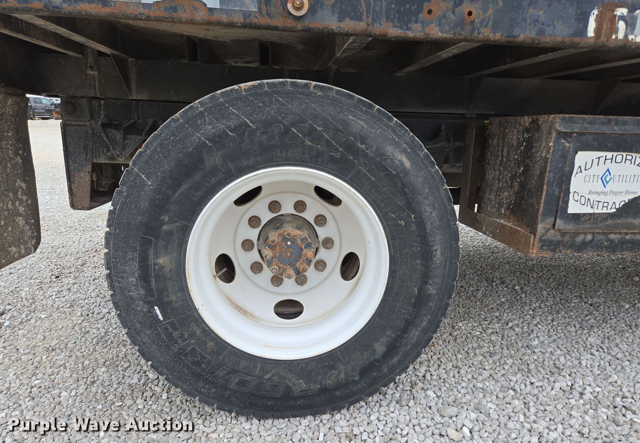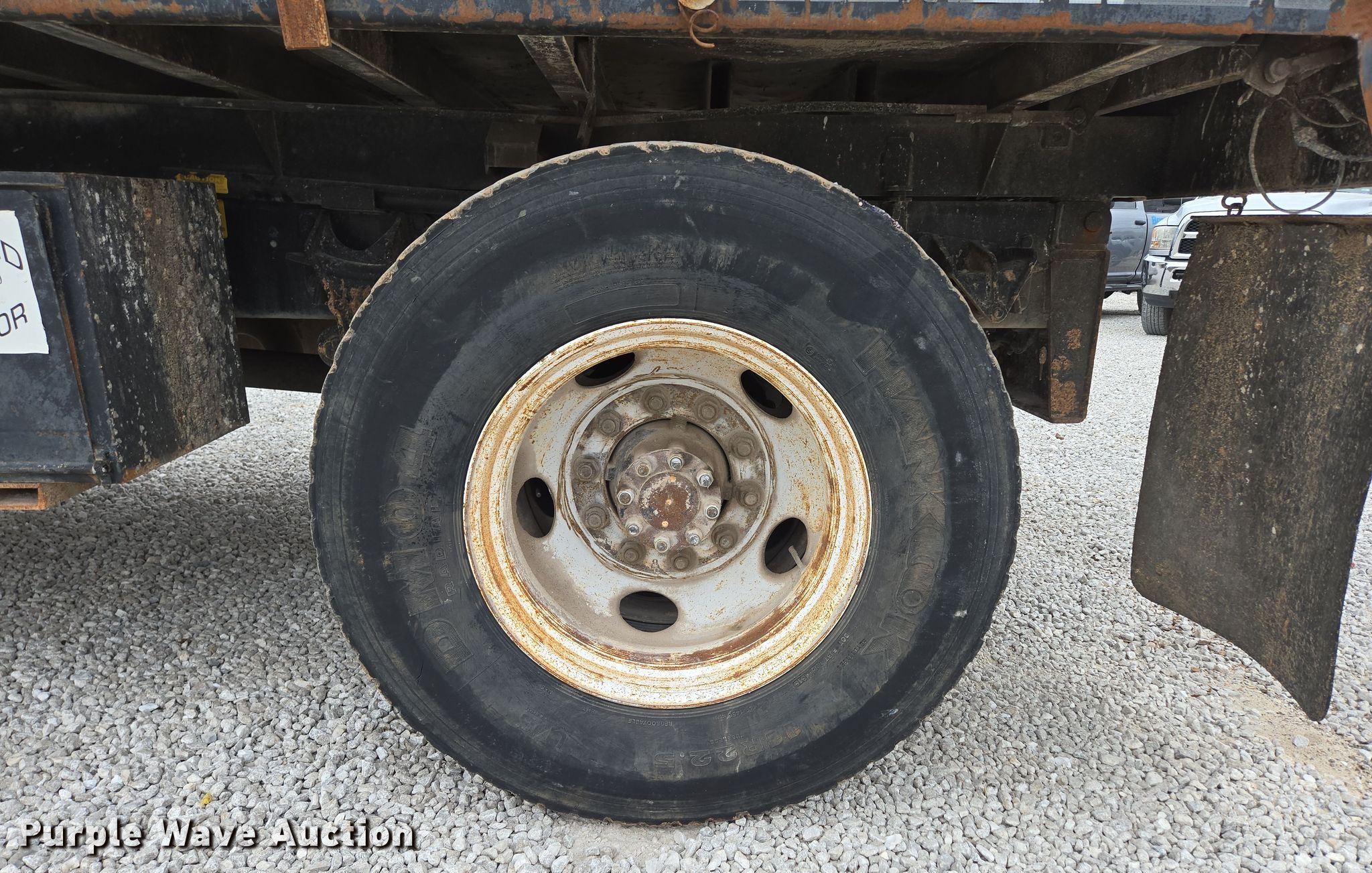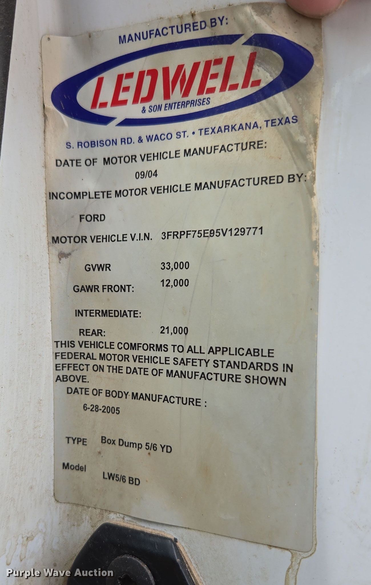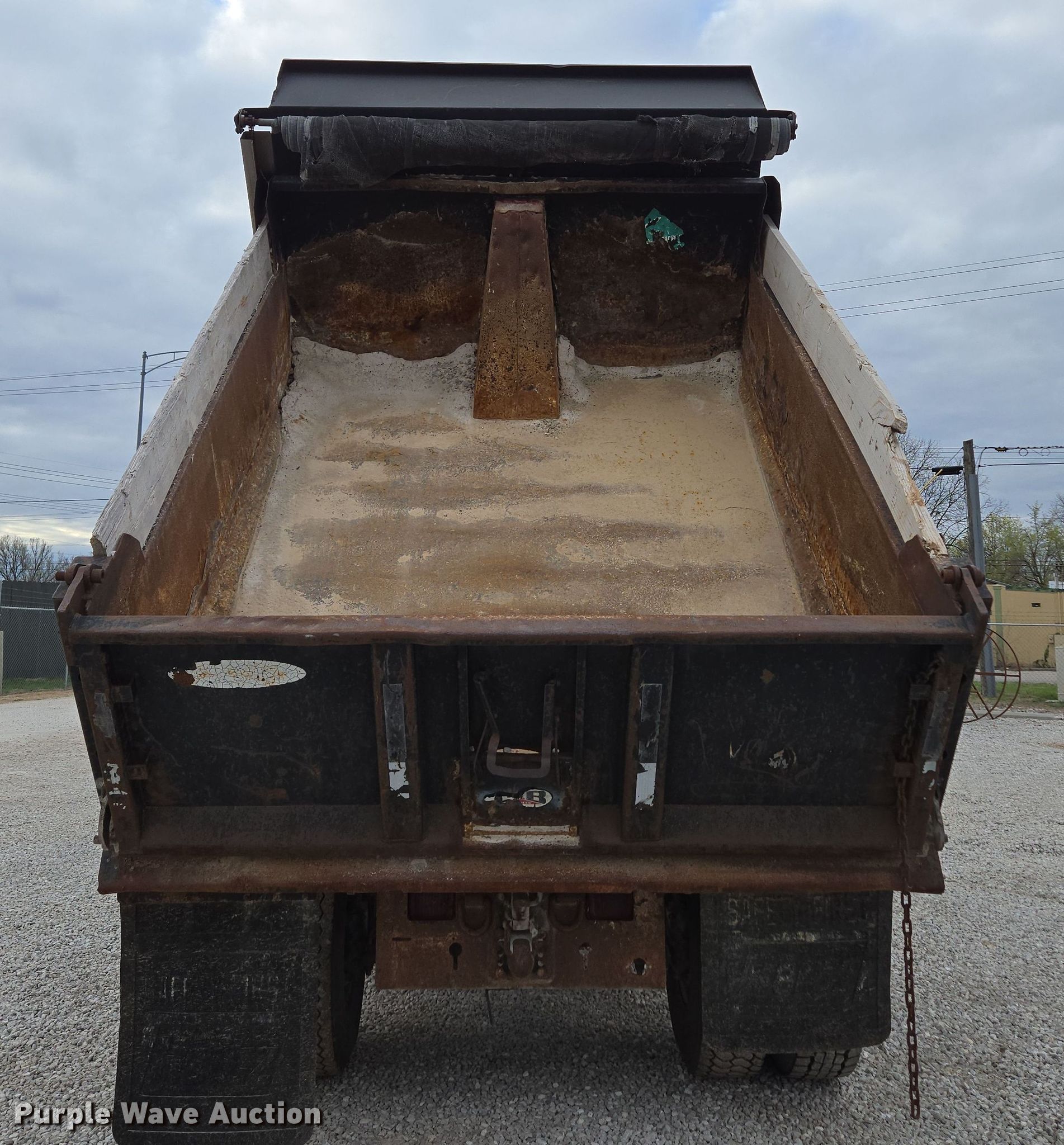 2005 Ford F750 Super Duty dump truck. Miles: 110,168 on odometer, VIN: 3FRPF75E95V129771, Unit #: 117. Engine Cummins, Displacement: 5.9L, Cylinders: 6, Fuel type: Diesel. Transmission Manual. Chassis Axles: Single, Suspension: Spring, Brakes: Hydraulic, PTO, GVWR: 33,000 lbs. Interior AC, Heat, Cruise control, Brake controller. Features Dump bed Ledwell & Son Enterprises LW5/6 BD, 9' 10.5" L x 97" W, Side height: 28", Side board height: 8.5", Bed type: Steel, Roll tarp, Ram: Single, End gate: Manual. Tires Size: 11R22.5. Notes Side toolboxes welded to frame, Dash warning indicator: Brake, Service engine soon, Windshield chipped or cracked, Roll tarp missing crank handle, Hydraulic ram issues, leaks. Missouri title. Title distribution may be delayed up to 30 days from verification of funds. L&B Services LLC. Springfield, MO 65802