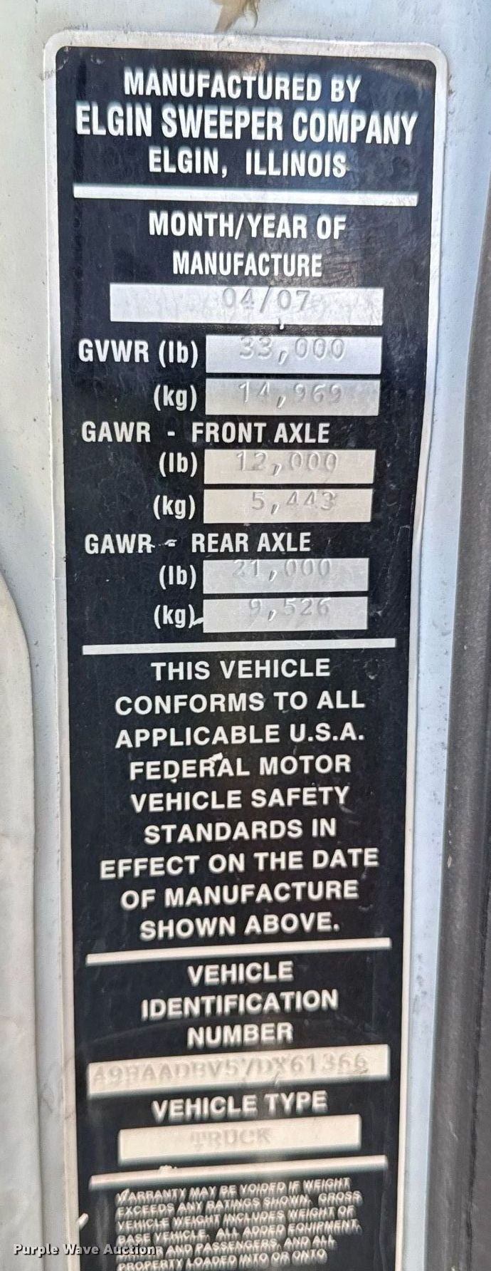 Purple Wave is selling a used Street Sweeper Truck in Kansas. This item is a 2007 Sterling SC8000 street sweeper truck with the following: Miles: 63,696 on odometer, Hours: 10,472 on meter, VIN: 49HAADBV57DX61366