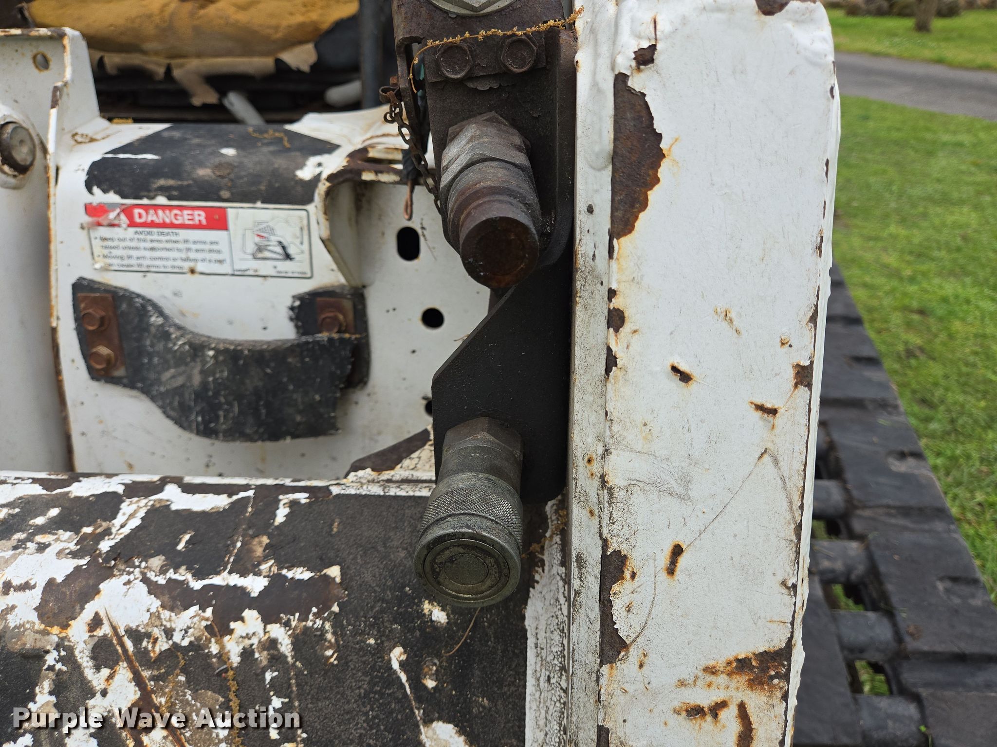 2000 Bobcat 864 tracked skid steer loader. Hours: 1,458 on meter, Serial: 518912063. Engine Deutz, Cylinders: 4, Fuel type: Diesel. Transmission Hydrostatic. Operators station Bucket control: Foot, Electronic Monitoring System panel. Features Auxiliary hydraulics, Auxiliary electrical outlet, Quick coupler: Manual, Bucket Width: 66". Tracks Width: 12". Notes Auxiliary electrical outlet damaged. S&T International. Orange, TX 77632