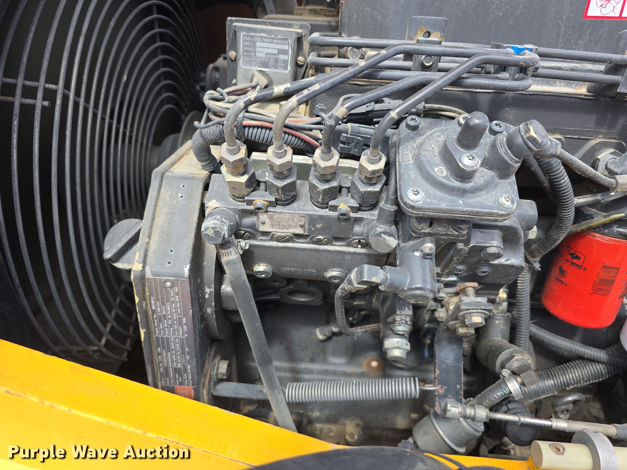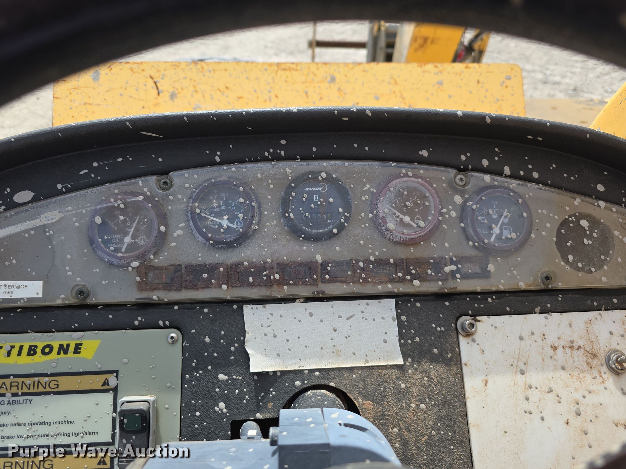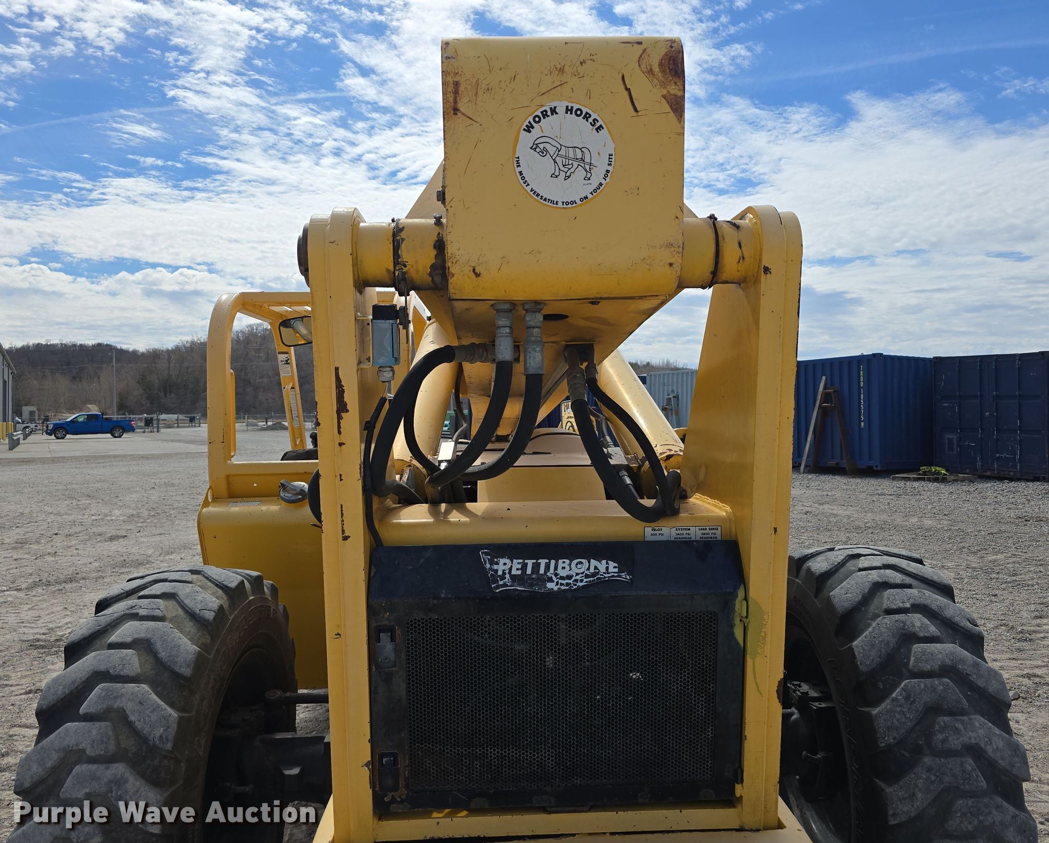 2001 Pettibone 10044 Extendo telehandler. Hours: 7,087 on meter, Serial: 2128. Engine Cummins B3.9-C, Serial: 46018012, Displacement: 3.9L, Cylinders: 4, Fuel type: Diesel. Transmission Powershift, 4F - 4R, Four wheel drive. Operators station Canopy, Steering: Crab, Four wheel. Features Maximum lift capacity: 10,000 lbs, Boom stages: 3, Fork length: 47.5", Tilt carriage, Hydraulic leveling, Quick attach: Manual. Tires Front: 15.5-25, Foam filled. Neuvirth Construction. Crescent, IA 51526