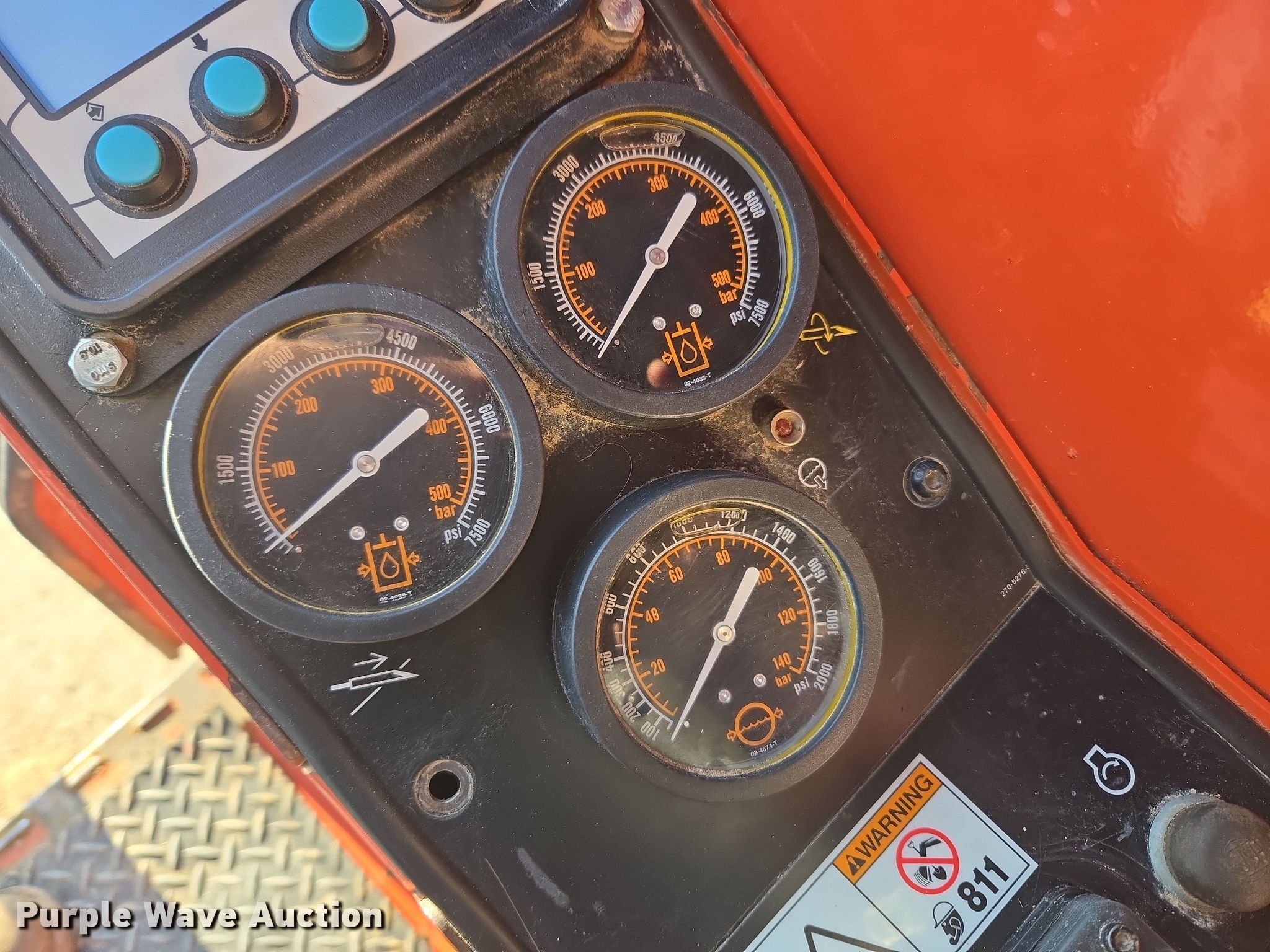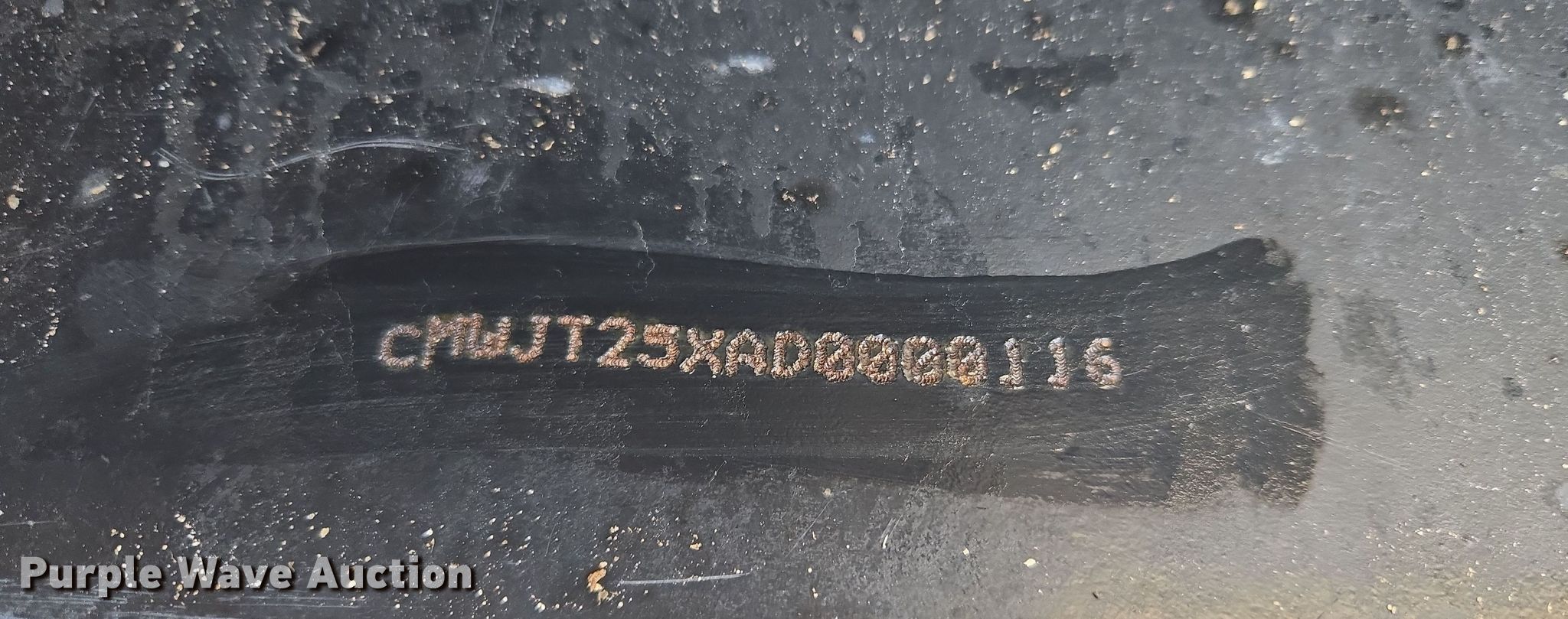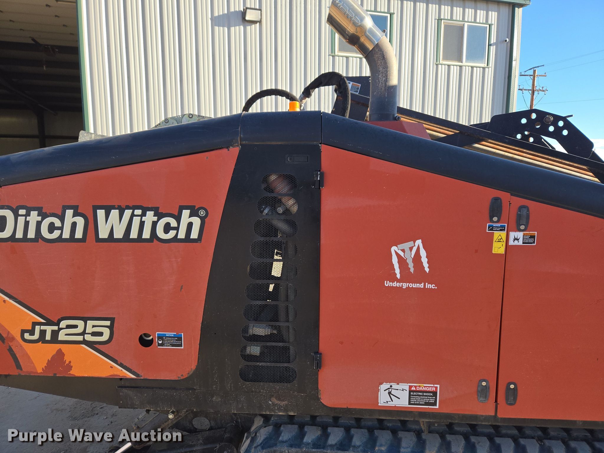 2013 Ditch Witch JT25 directional boring unit. Hours: 4,787 on meter, Serial: CMWJT25XAD0000116. Engine Cummins QSB4.5 130, Serial: 73531428, Displacement: 4.5L, Cylinders: 4, Fuel type: Diesel, HP: 163. Operators station Enclosed cab, AC, Heat. Features Ground drive remote: Tethered, Water pump FMC Technologies Inc. L0618 HD, GPM: 50, Drill bit width: 5", Drill stems On drill: 51, Drill stem length: 10' Diameter: 2.5", Auto rod loader, Rear hydraulic stabilizers, Hydraulic stake down. Tracks Width: 12", Rubber. Notes TD Recon monitor not included. M&T Underground Inc. Worland, WY 82401