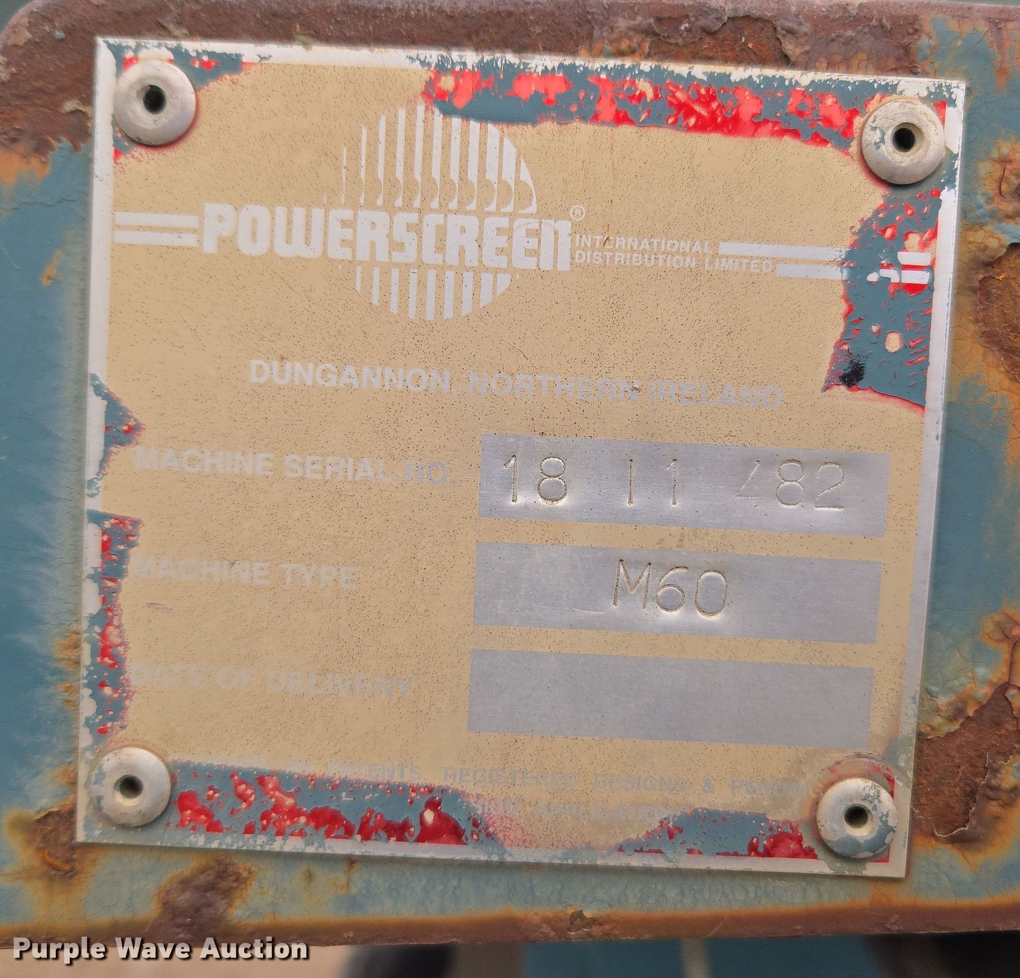 Purple Wave is selling a used Conveyor in Nebraska. This item is a Powerscreen M60 conveyor with the following: Hours: 2,985 on meter, Serial: 18 11 482