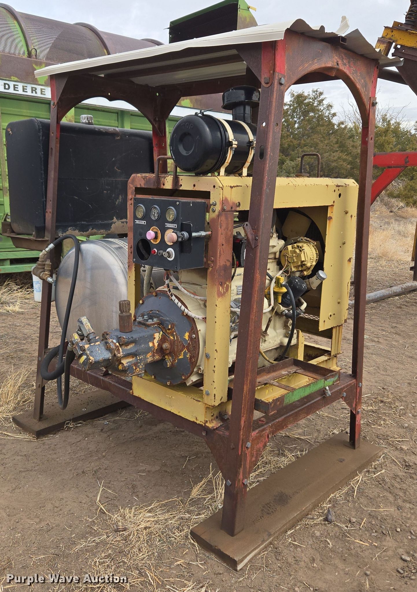 John Deere 4239 DF hydraulic power unit. Serial: CD 4239 D 862853, Cylinders: 4, Fuel type: Diesel. Features Radiator, Self-contained fuel tank, Engine stand, Skid mounted, Muncie hydraulic tank. Notes Battery not included. Pat Parsons Trucking. 3006 N Hwy 71. Harrisburg, NE 69345